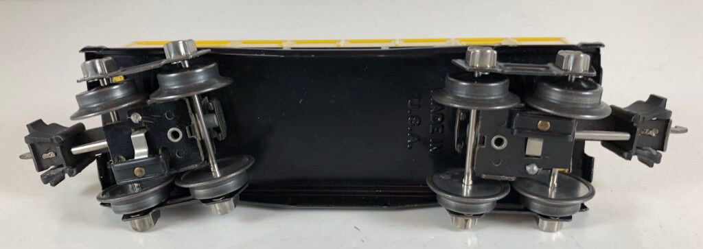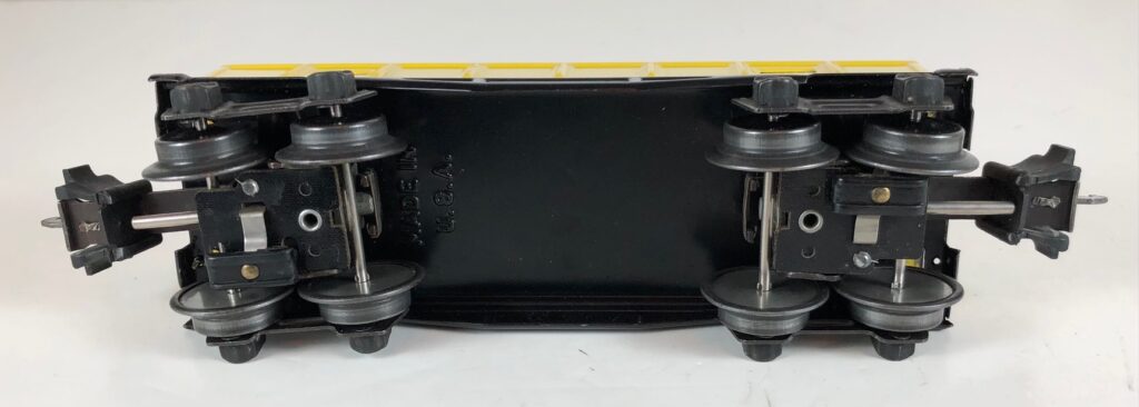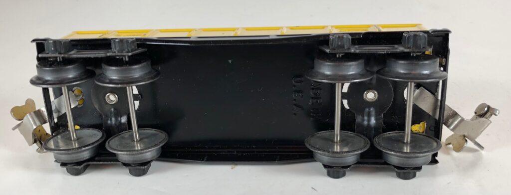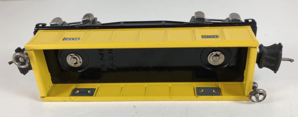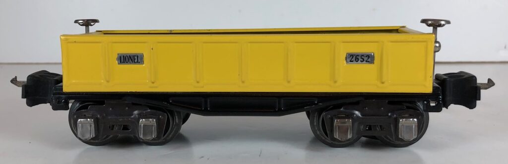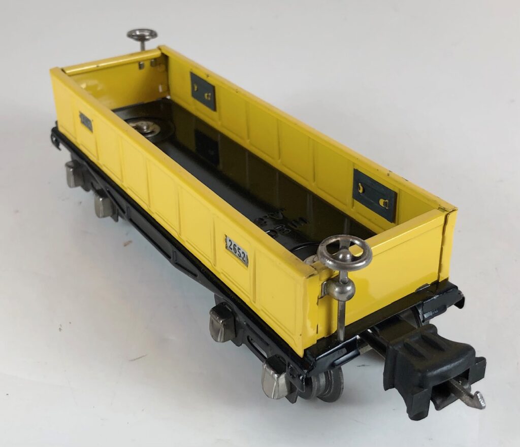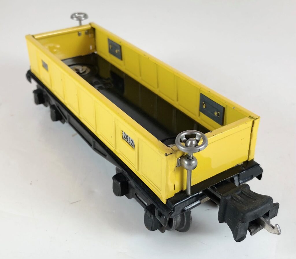 1. No. 2652 Gondola Car in yellow (1938). The cars have aluminum plates, nickel trim and nickel journals. The cars have early style operating box couplers.