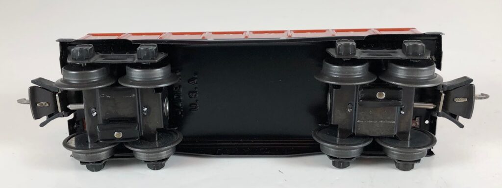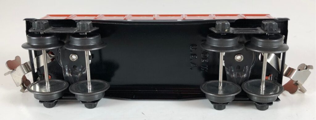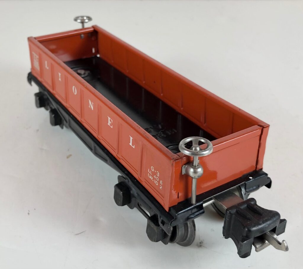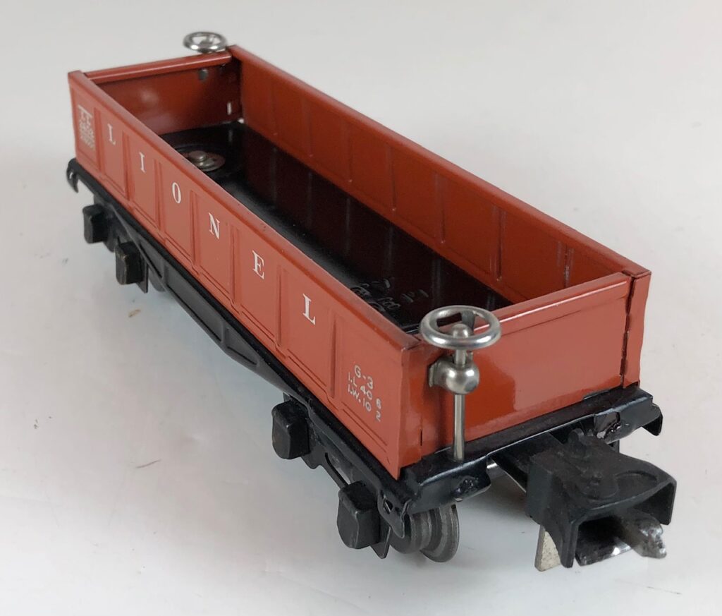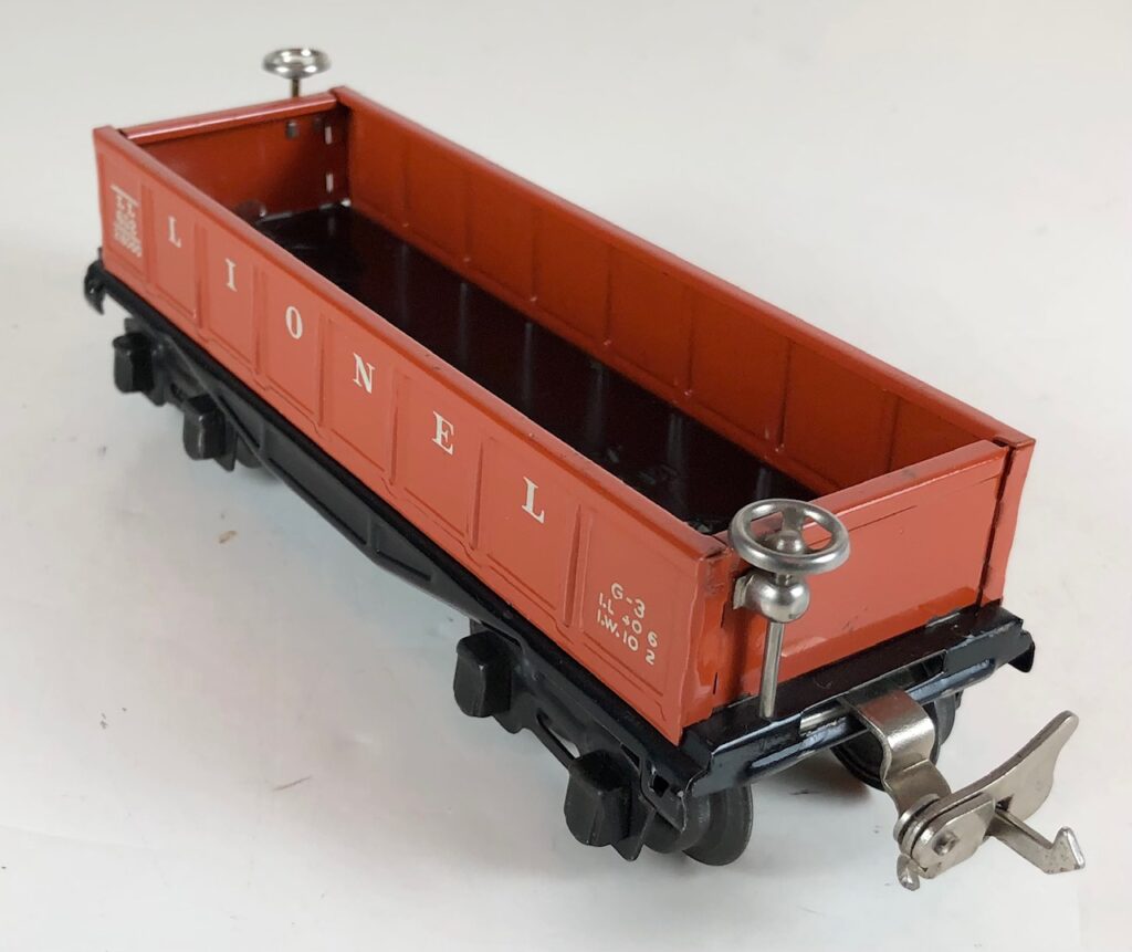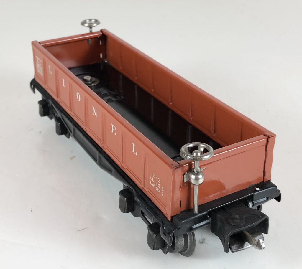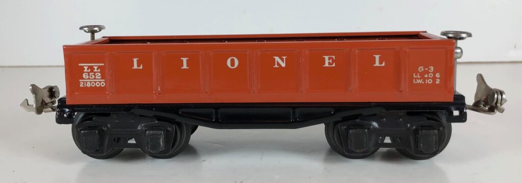 3. No. 652 Gondola Car in burnt orange (1940). The cars have white, rubber stamped number and data, nickel trim and black journals. The cars have latch couplers.