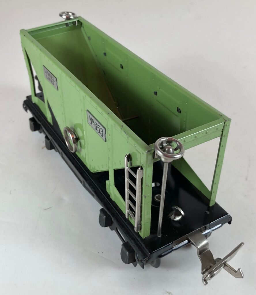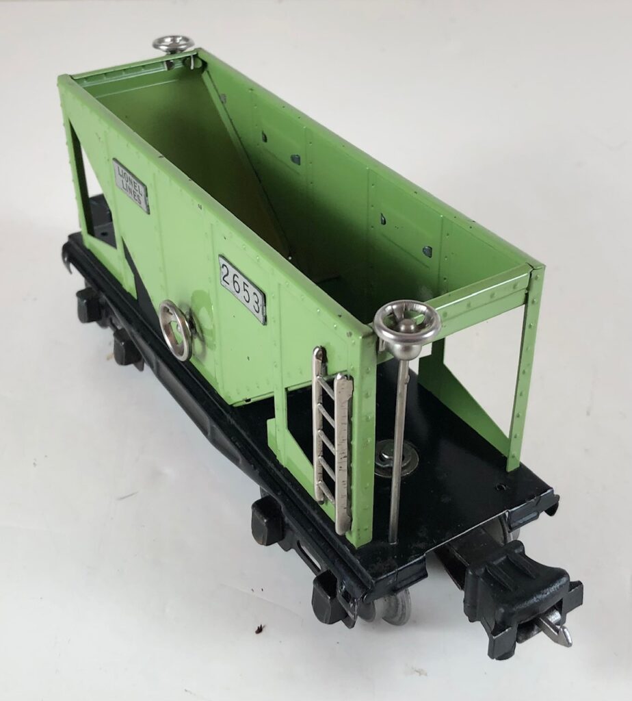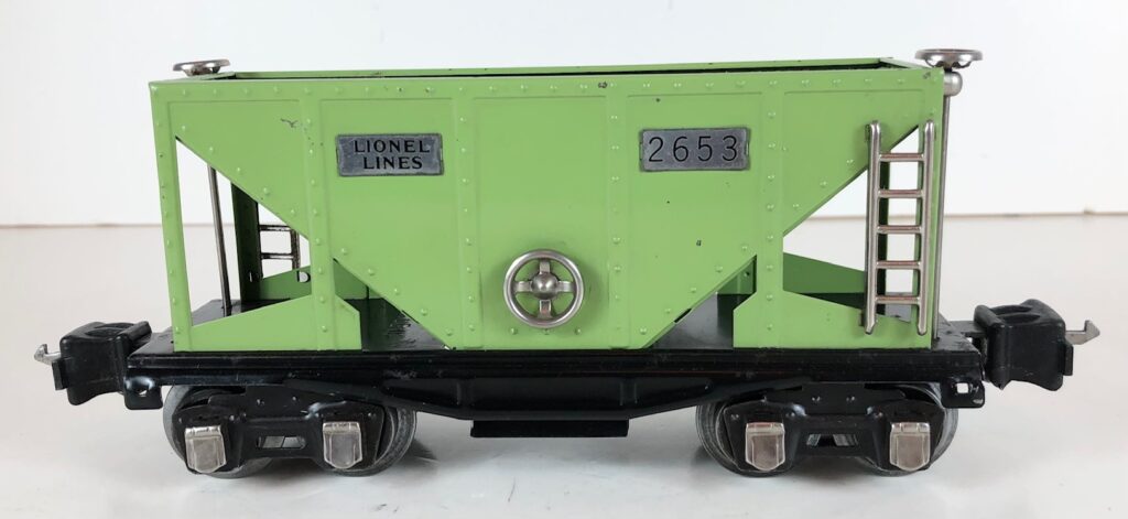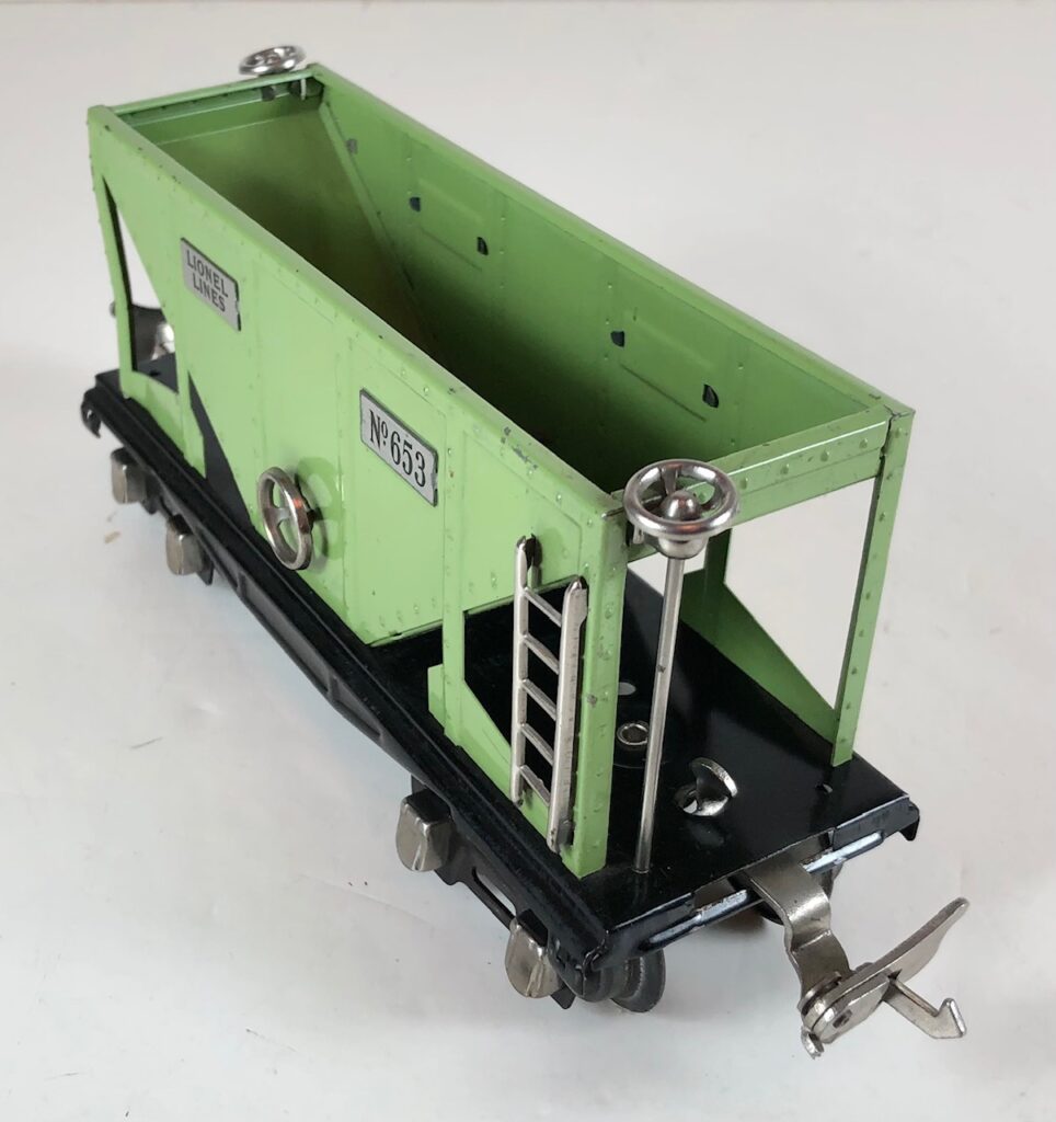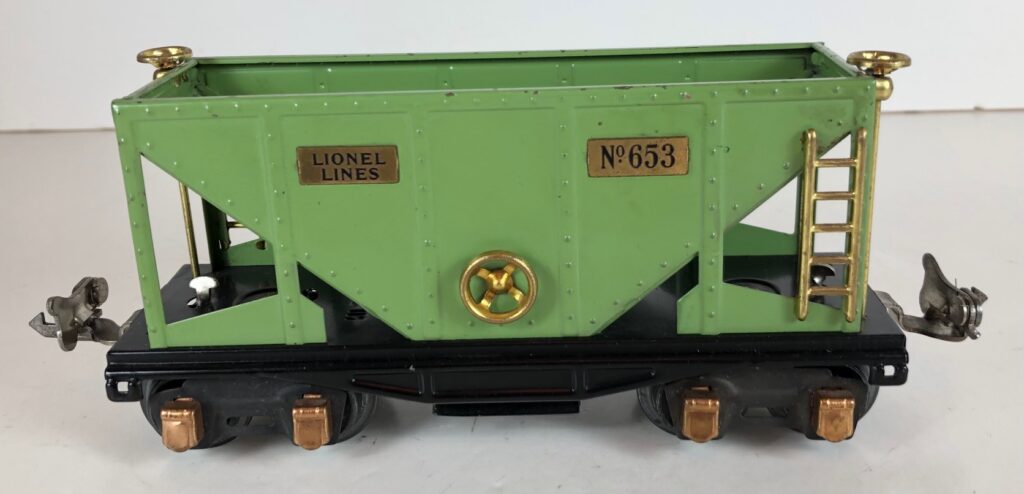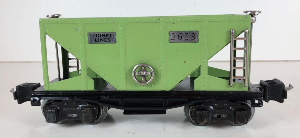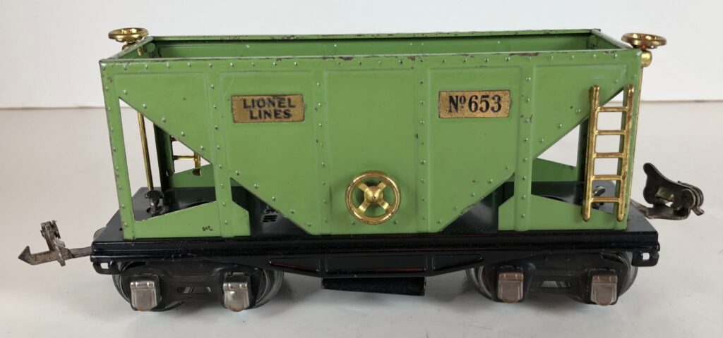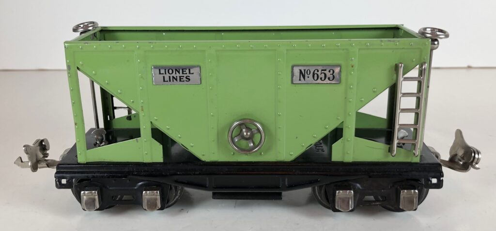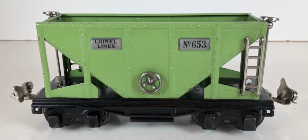 The Lionel No. 653 Hopper Cars were introduced in 1934 and were issued through 1942. The No. 653 Hopper Cars always had latch couplers. The No. 653 Hopper Cars measure 6 1/2-inches in length. The hopper car bodies were always painted Stephen Girard green and had a black frame. All of the hopper cars have metal plates to identify the number and “Lionel Lines”.