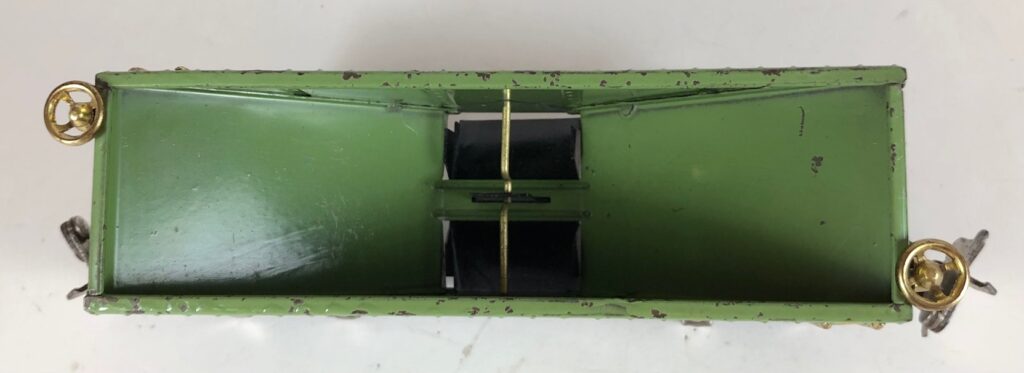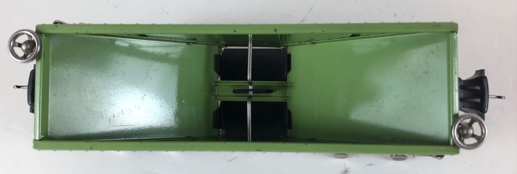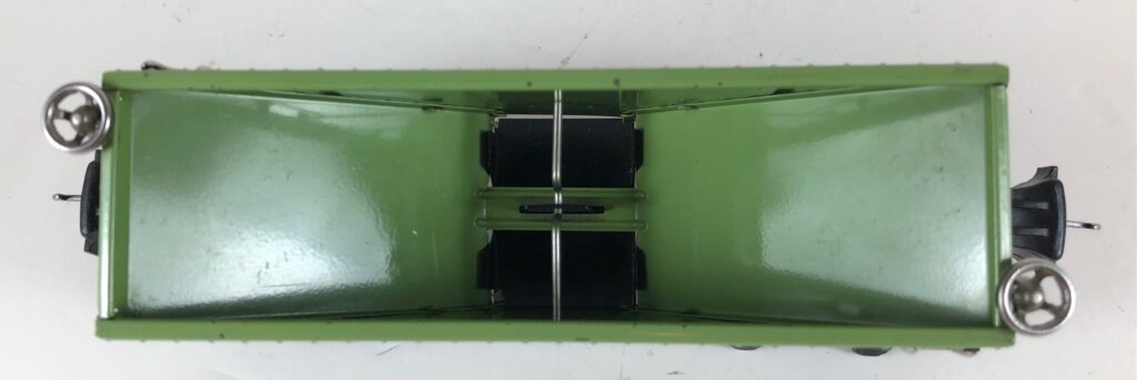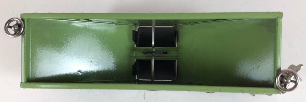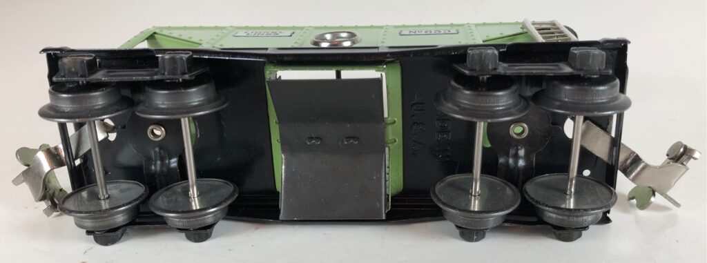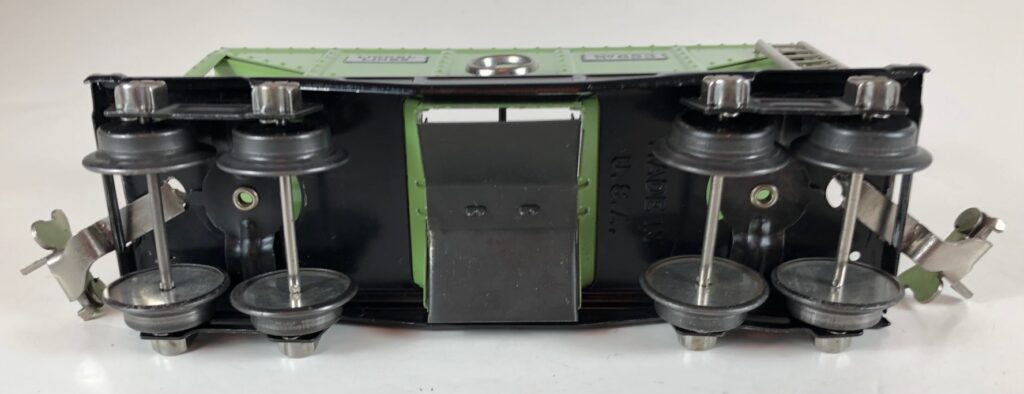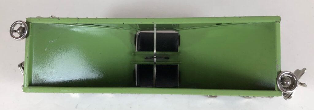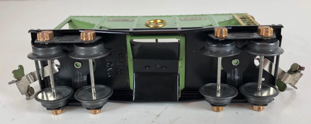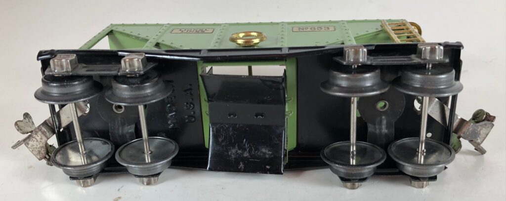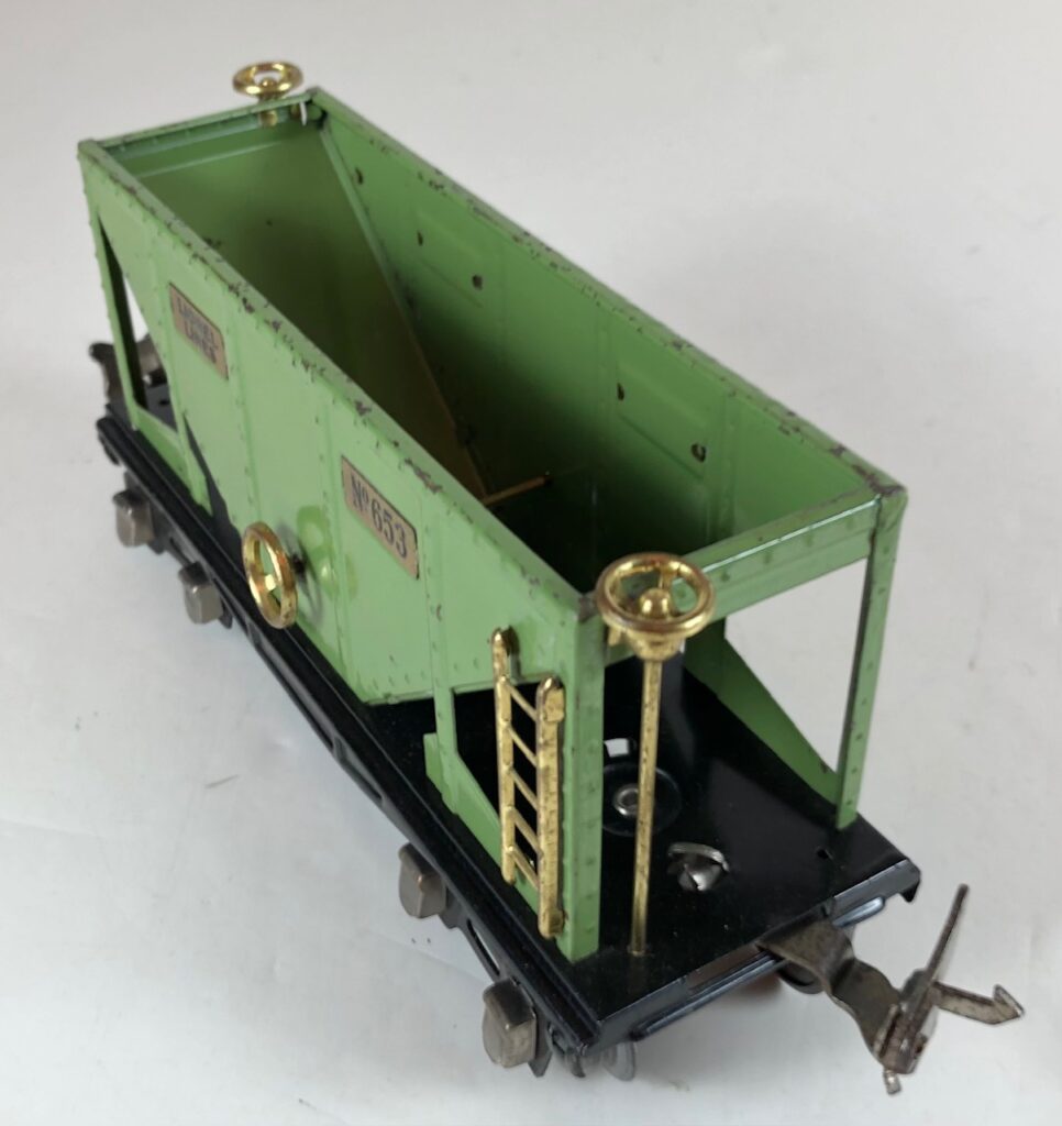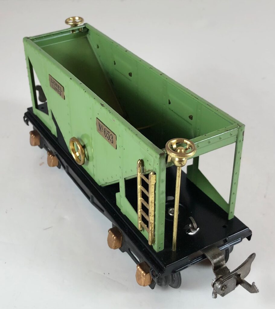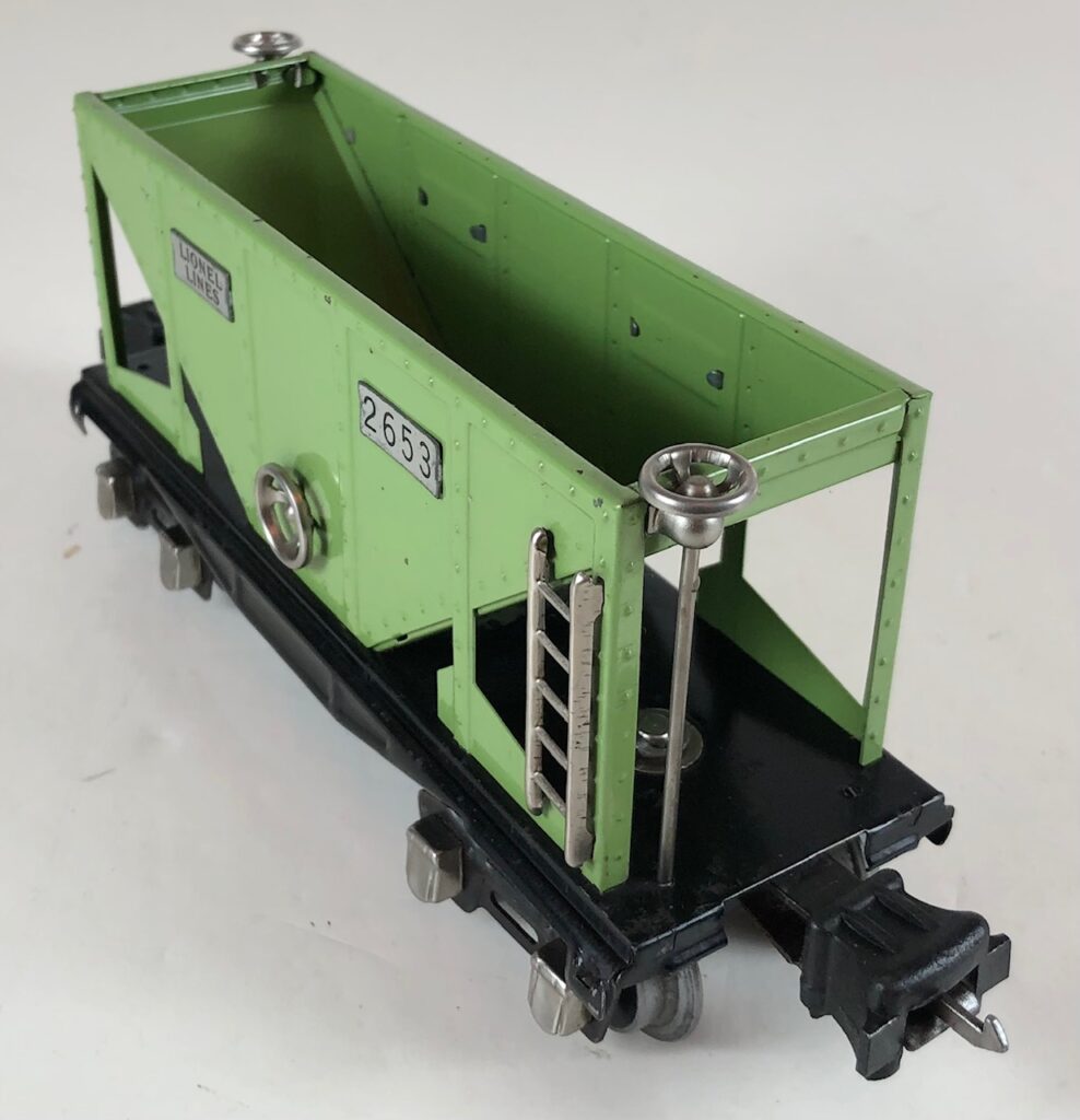 The Lionel No. 653 Hopper Cars were introduced in 1934 and were issued through 1942. The No. 653 Hopper Cars always had latch couplers. The No. 653 Hopper Cars measure 6 1/2-inches in length. The hopper car bodies were always painted Stephen Girard green and had a black frame. All of the hopper cars have metal plates to identify the number and “Lionel Lines”.