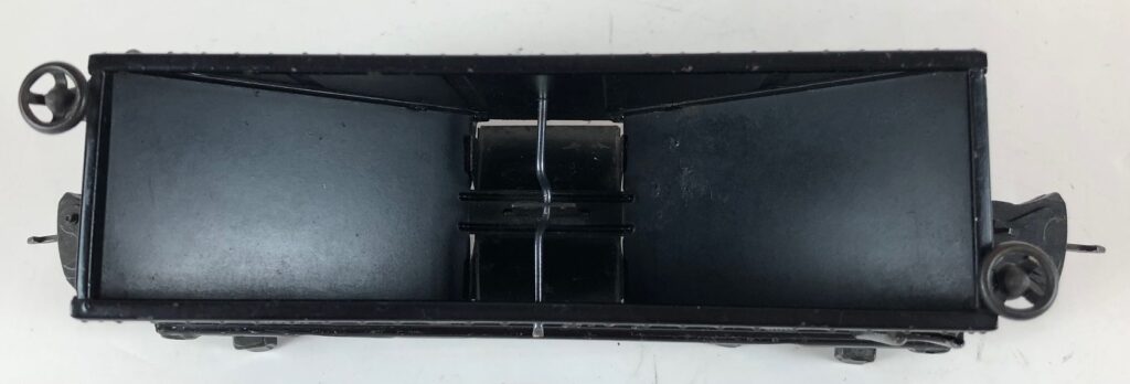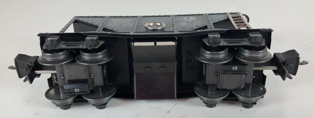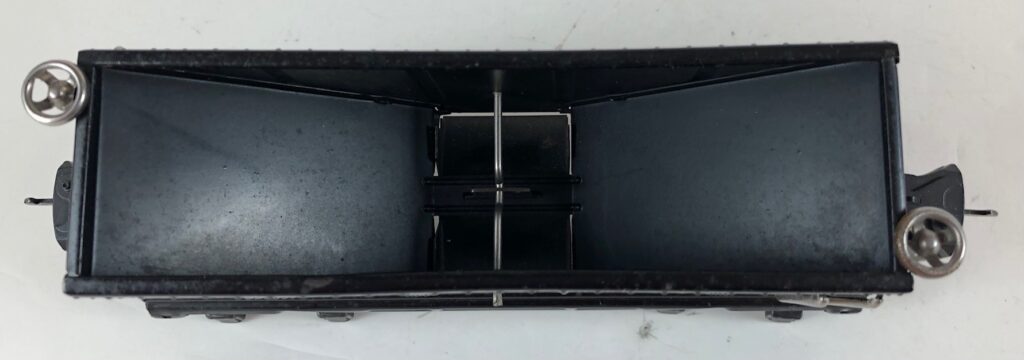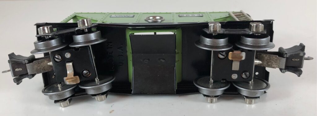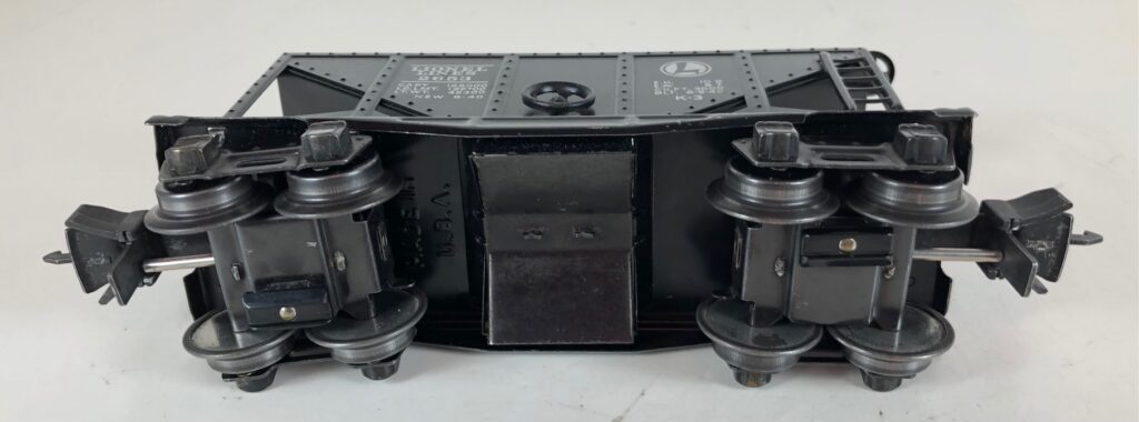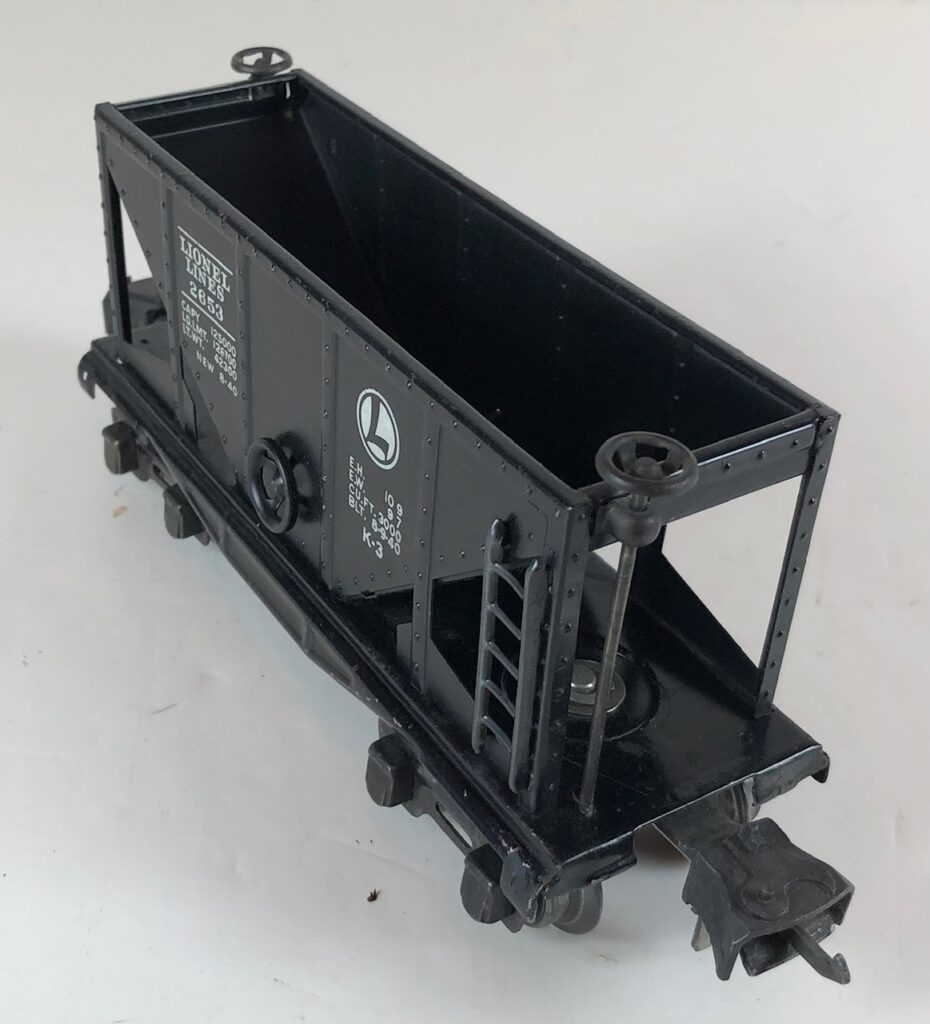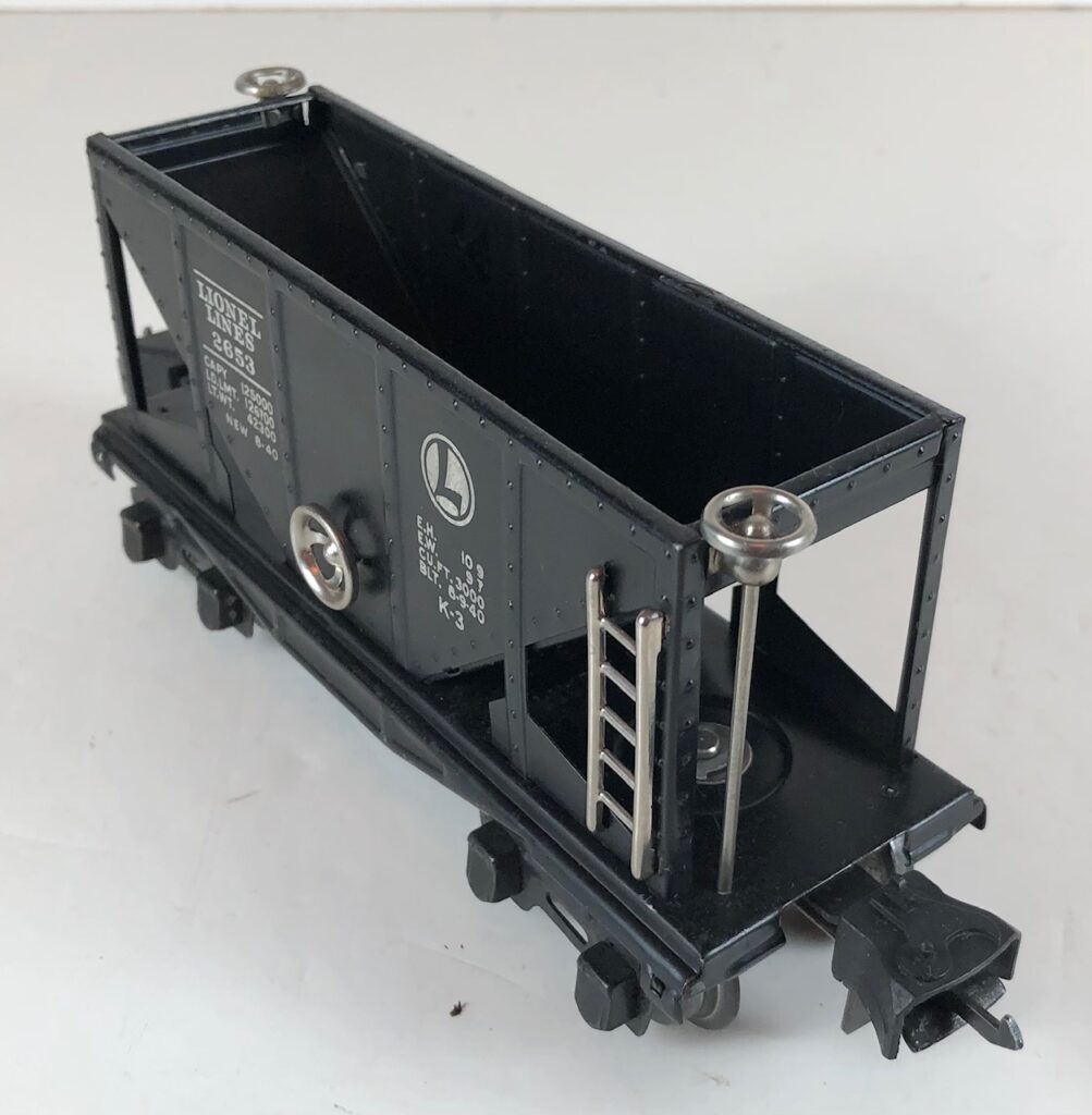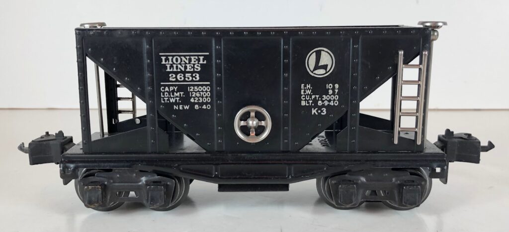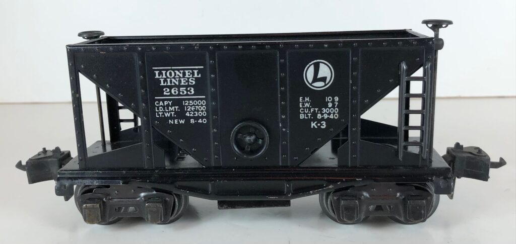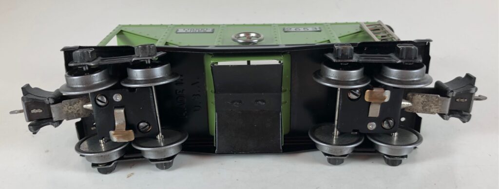 The Lionel No. 2653 Hopper Cars were introduced in 1938 and were issued through 1942. The No. 2653 Hopper Cars always had operating couplers. The No. 2653 Hopper Cars measure 6 1/2-inches in length. The hopper car bodies were always painted a single color and had a black frame. The early hopper cars have metal plates to identify the number and “Lionel Lines”. Late hopper cars have rubber stamped lettering.