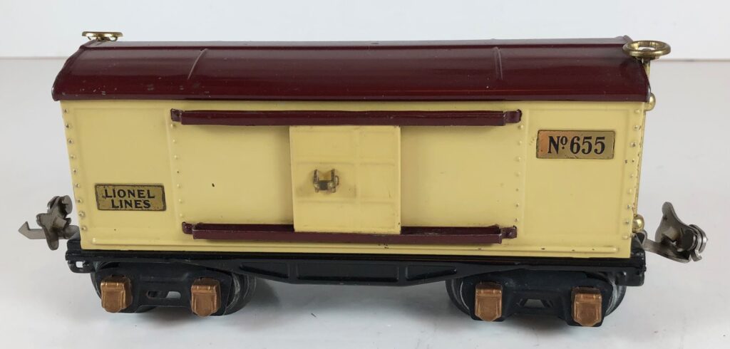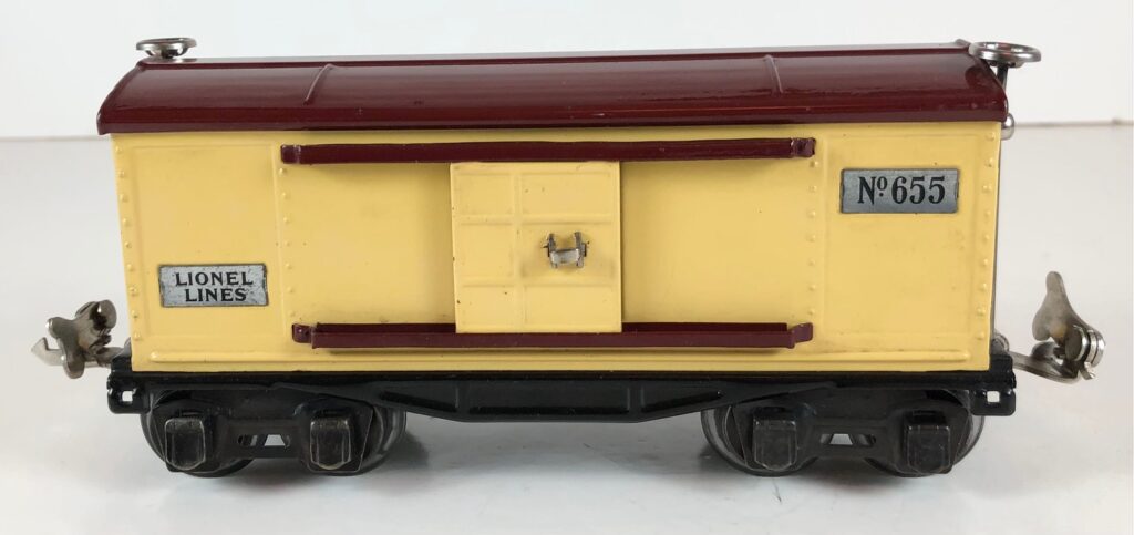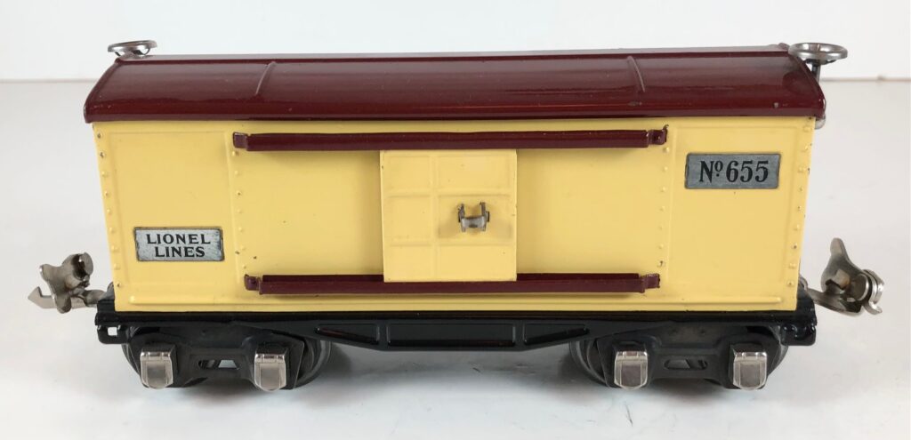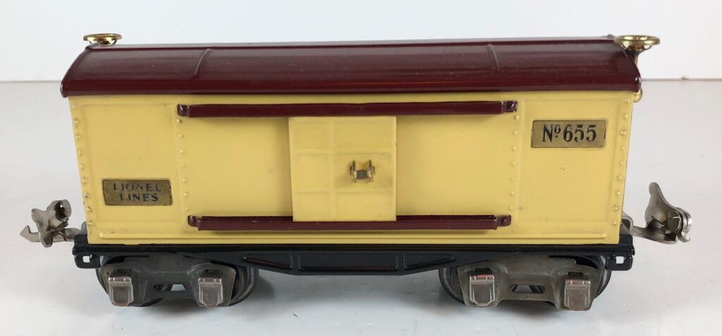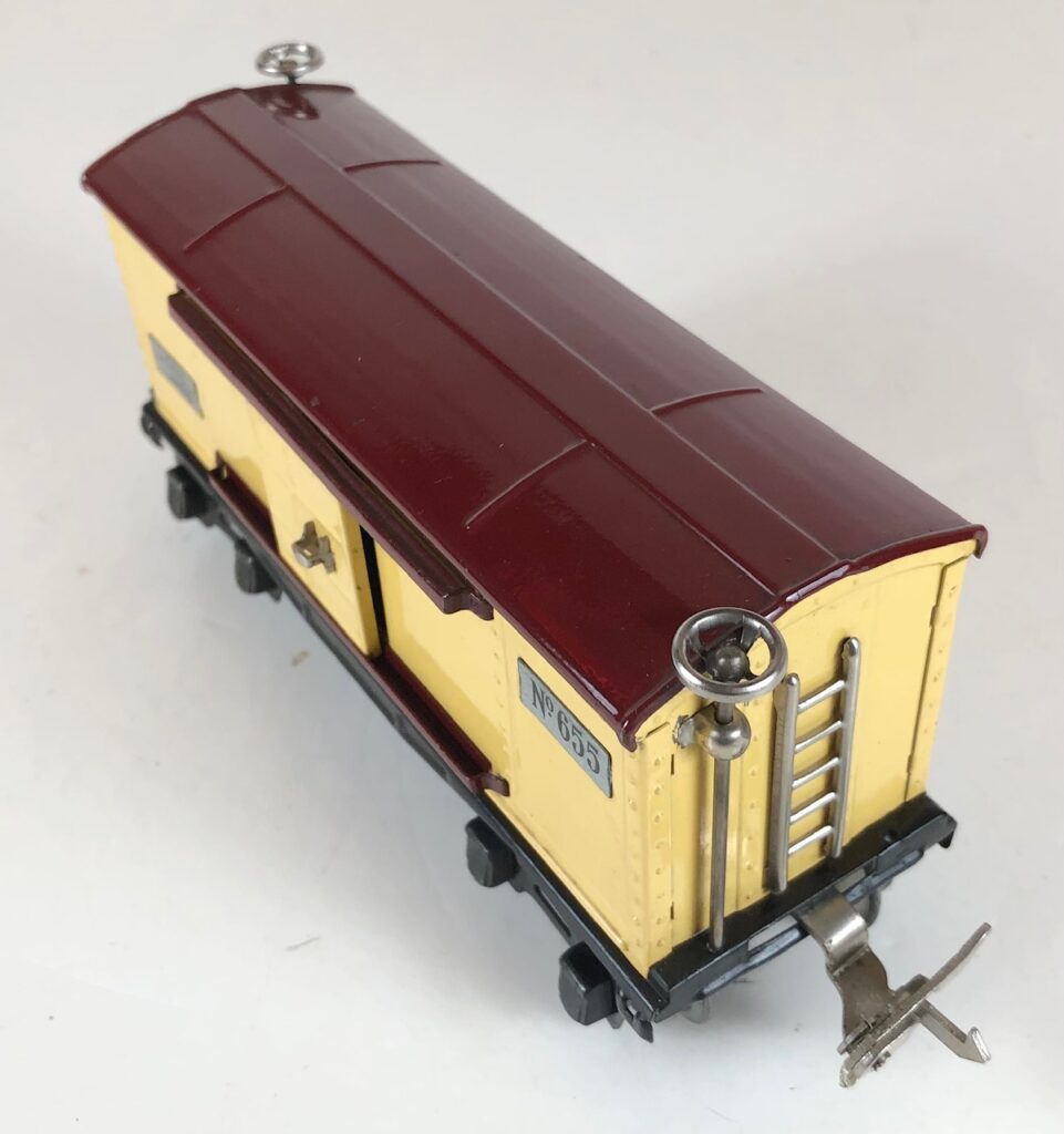 3. No. 655 Box Car in cream with maroon roof and door guides (1935-1938). The cars have aluminum plates, nickel trim and nickel journals. The cars have latch couplers.