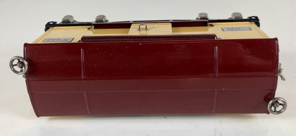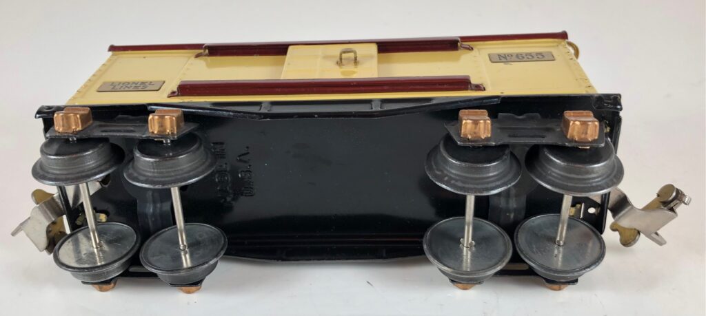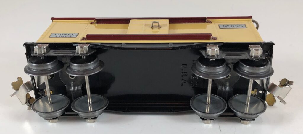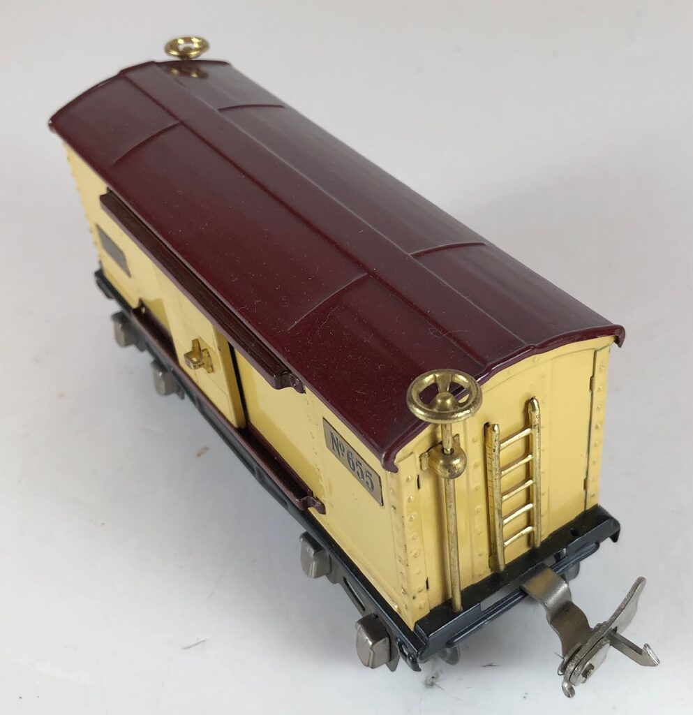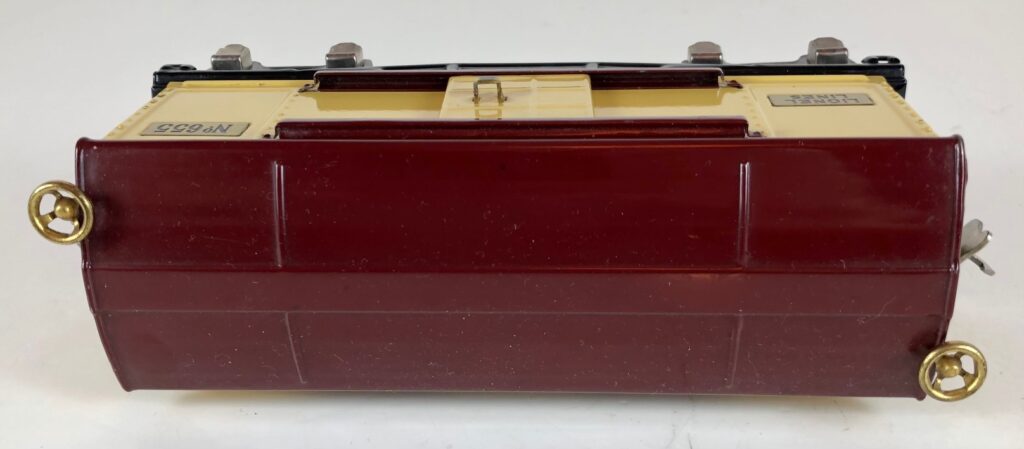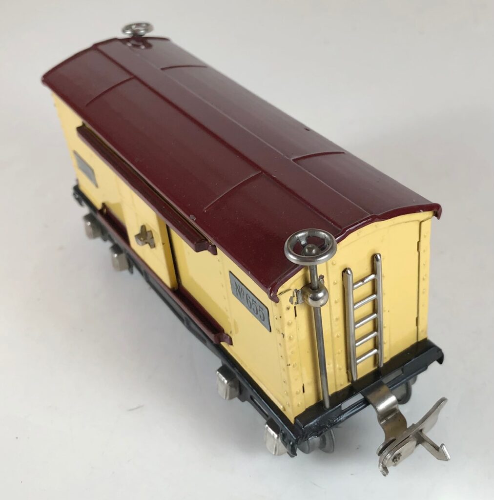 3. No. 655 Box Car in cream with maroon roof and door guides (1935-1938). The cars have aluminum plates, nickel trim and nickel journals. The cars have latch couplers.