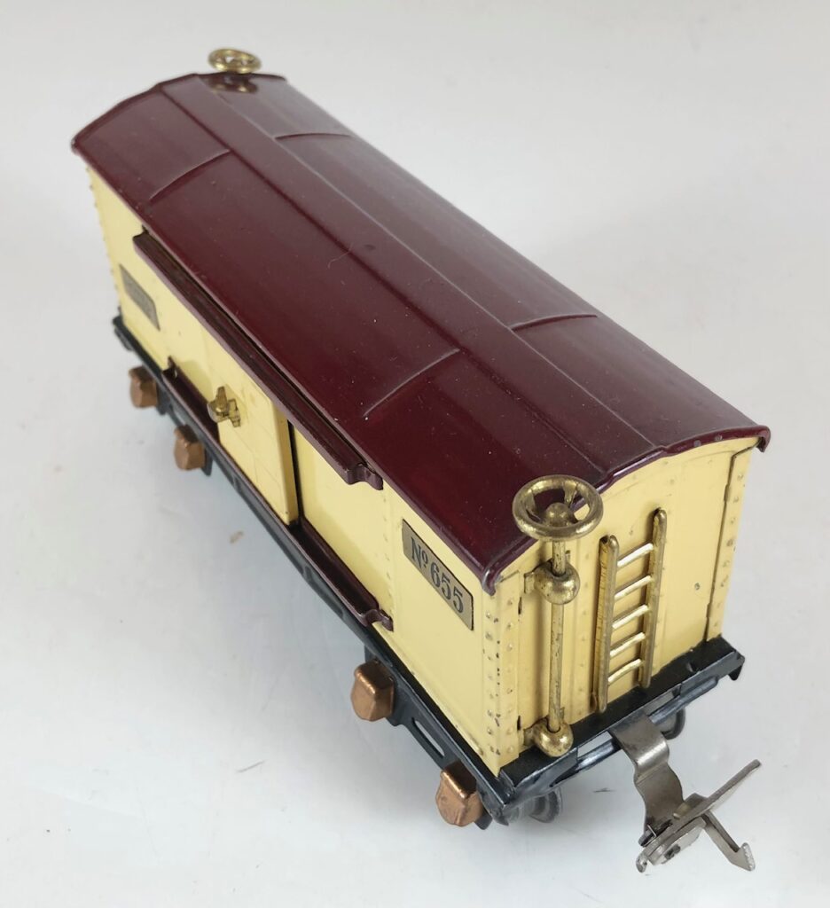 1. No. 655 Box Car in cream with maroon roof and door guides (1934). The cars have brass plates, brass trim and copper journals. The cars have latch couplers.