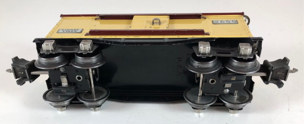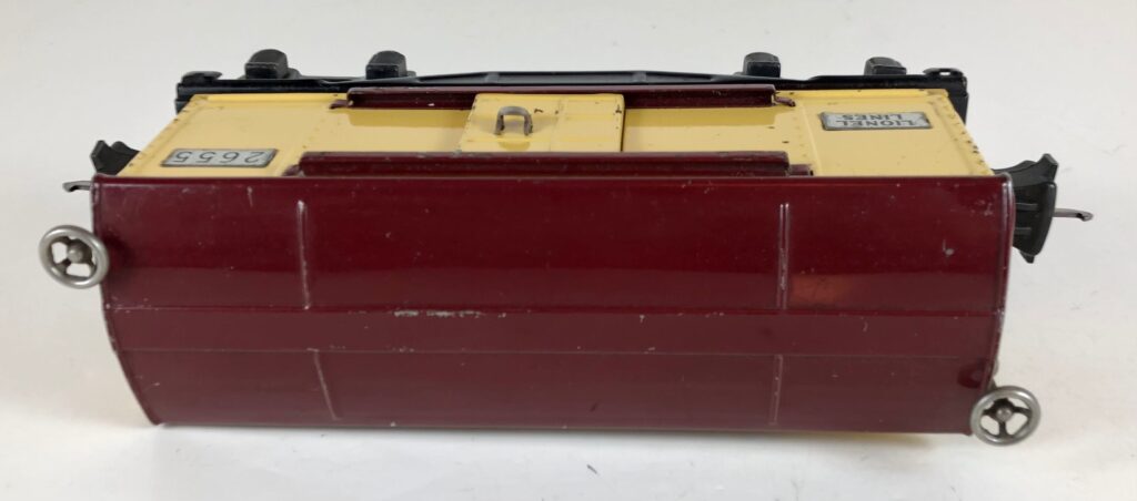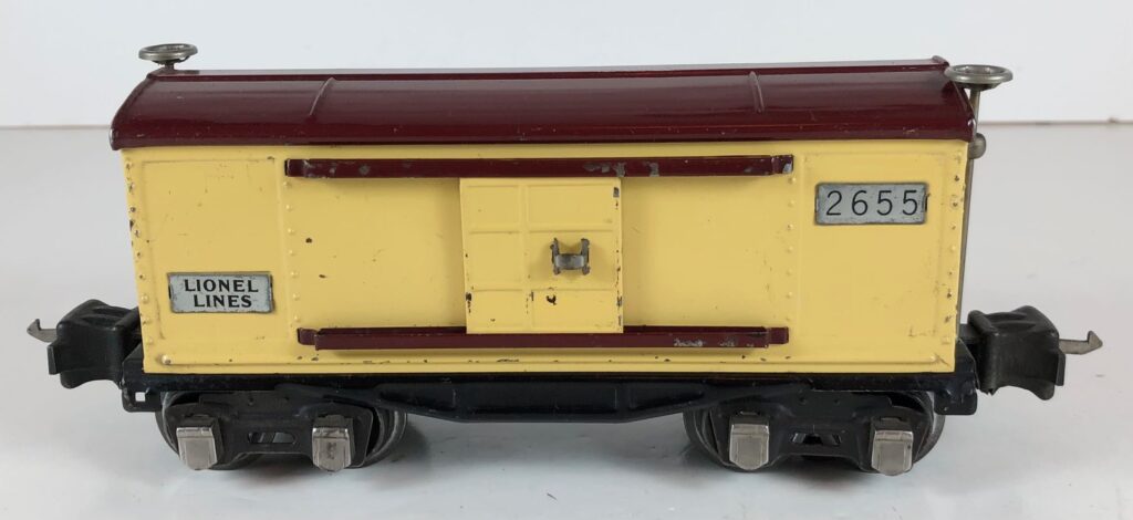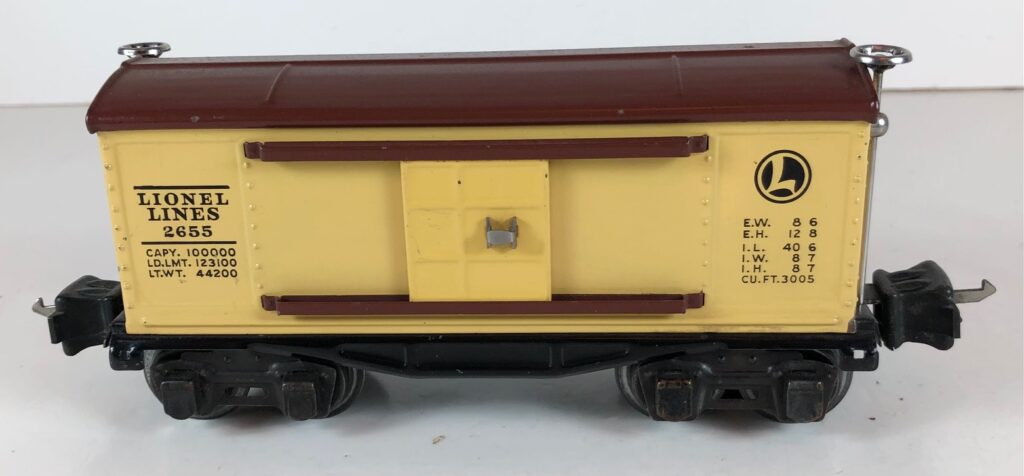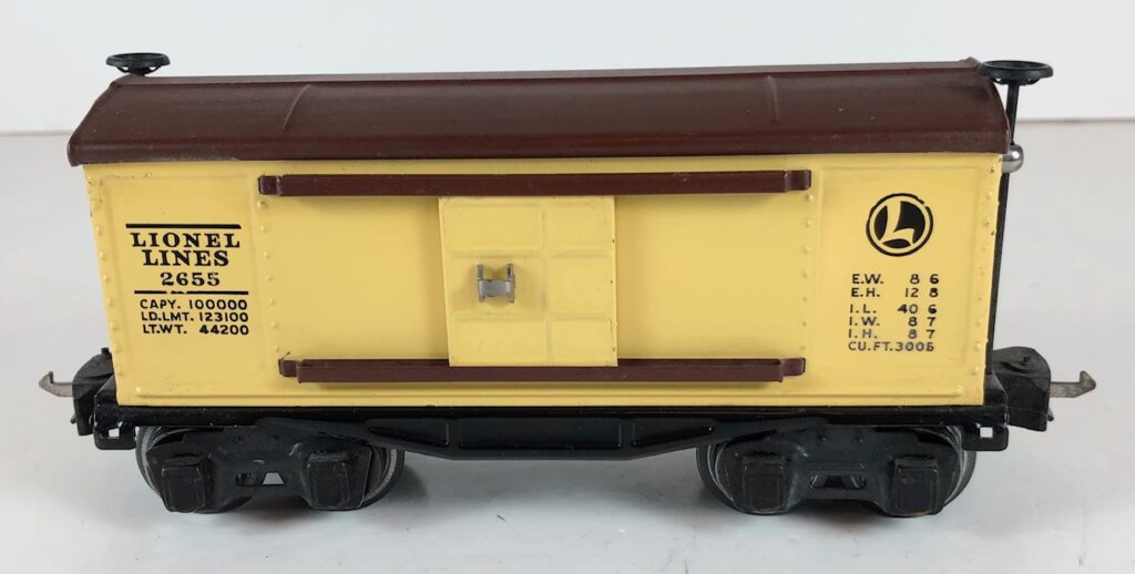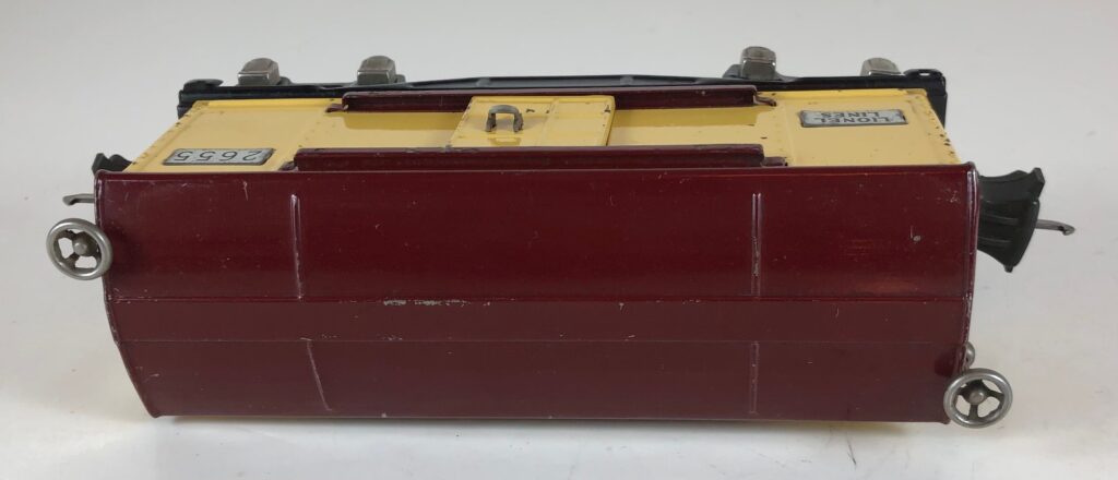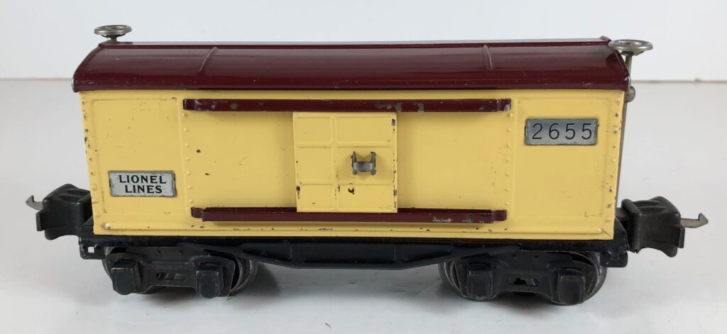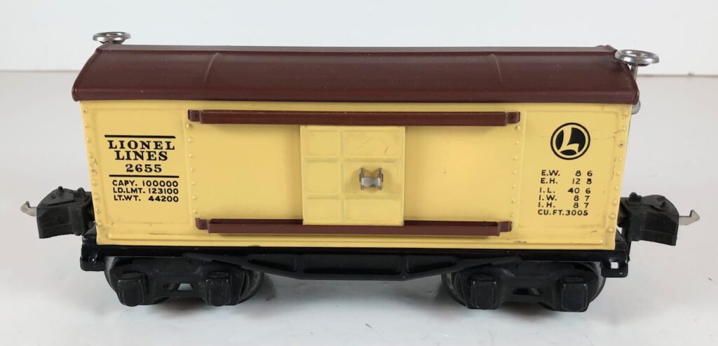 The Lionel No. 2655 Box Cars were introduced in 1938 and were issued through 1942. The No. 2655 Box Cars always had operating couplers. The No. 2655 Box Cars measure 6 1/2-inches in length. The box cars had contrasting colors for the body and roof. The frame was always black. The cars had sliding doors that opened. The doors matched the car body color and have a handle in the center. The door guides always matched the roof color. Early box cars have metal plates to identify the number and “Lionel Lines”. The later box cars have rubber stamped lettering. All of the No. 655 Box Cars have nickel trim.