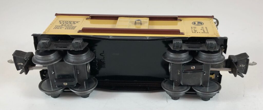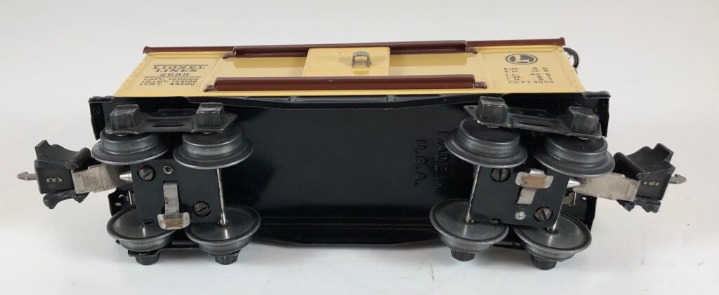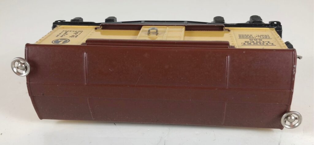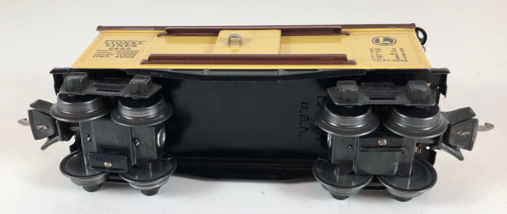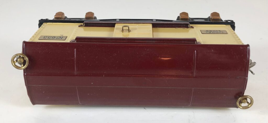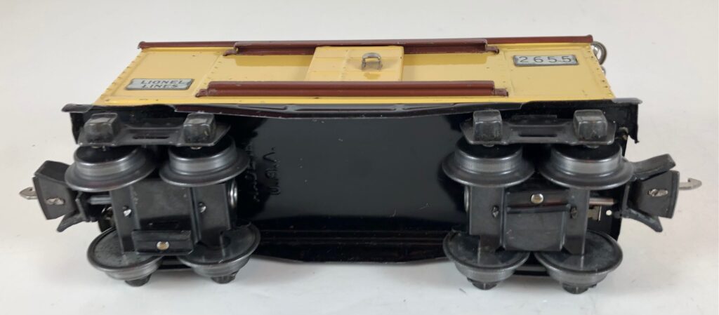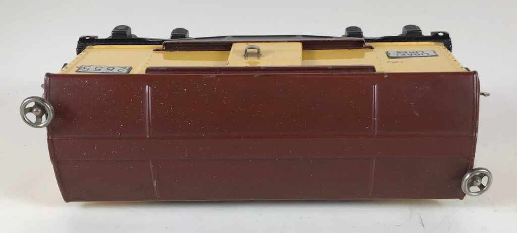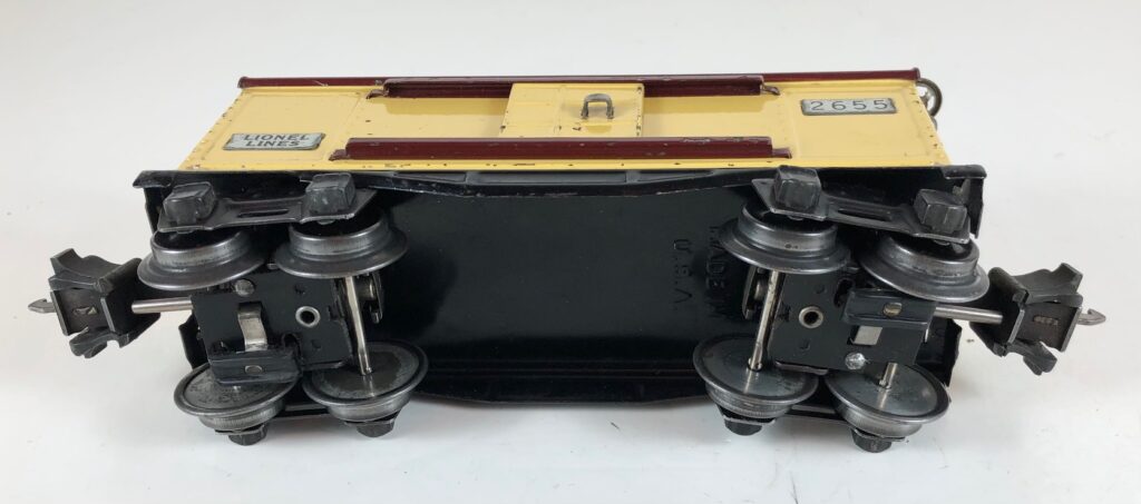 The Lionel No. 2655 Box Cars were introduced in 1938 and were issued through 1942. The No. 2655 Box Cars always had operating couplers. The No. 2655 Box Cars measure 6 1/2-inches in length. The box cars had contrasting colors for the body and roof. The frame was always black. The cars had sliding doors that opened. The doors matched the car body color and have a handle in the center. The door guides always matched the roof color. Early box cars have metal plates to identify the number and “Lionel Lines”. The later box cars have rubber stamped lettering. All of the No. 655 Box Cars have nickel trim.