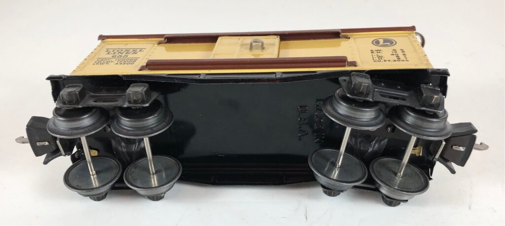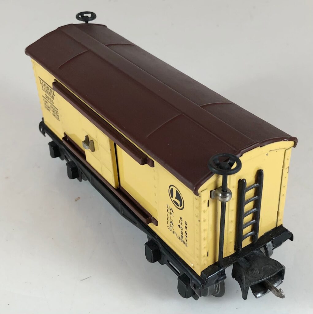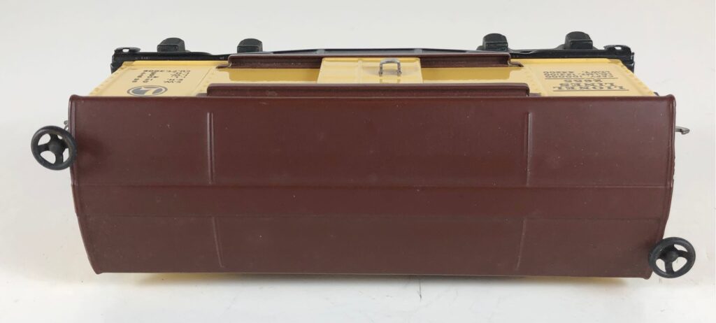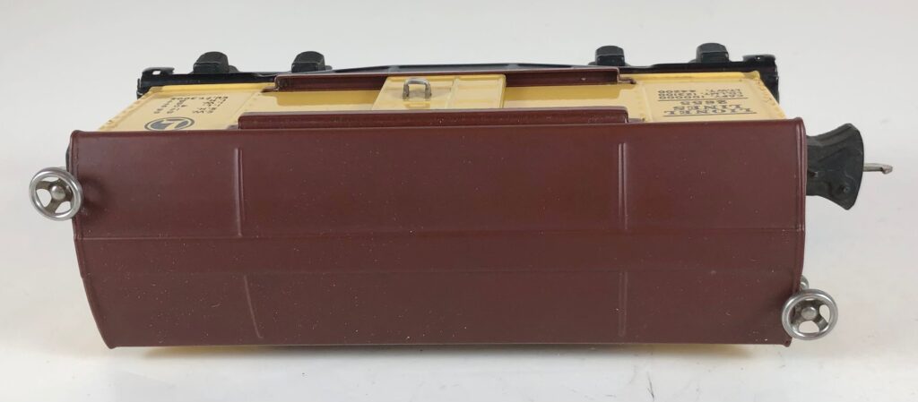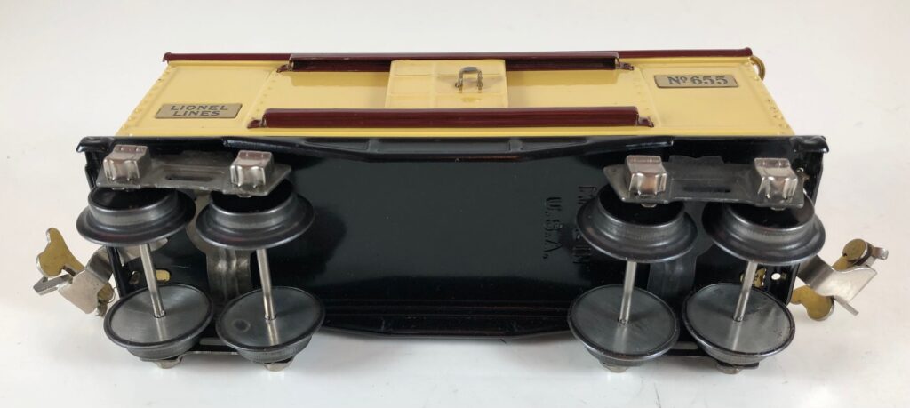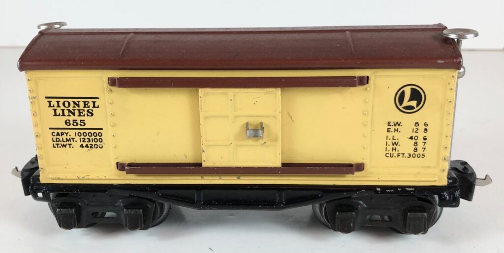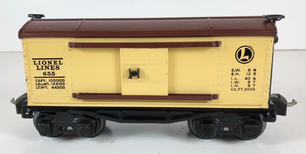 The Lionel No. 655 Box Cars were introduced in 1934 and were issued through 1942. The No. 655 Box Cars always had manual couplers. The No. 655 Box Cars measure 6 1/2-inches in length. The box cars had contrasting colors for the body and roof. The frame was always black. The cars had sliding doors that opened and have a handle in the center. The door guides always matched the roof color. Early box cars have metal plates to identify the number and “Lionel Lines”. The later box cars have rubber stamped lettering.