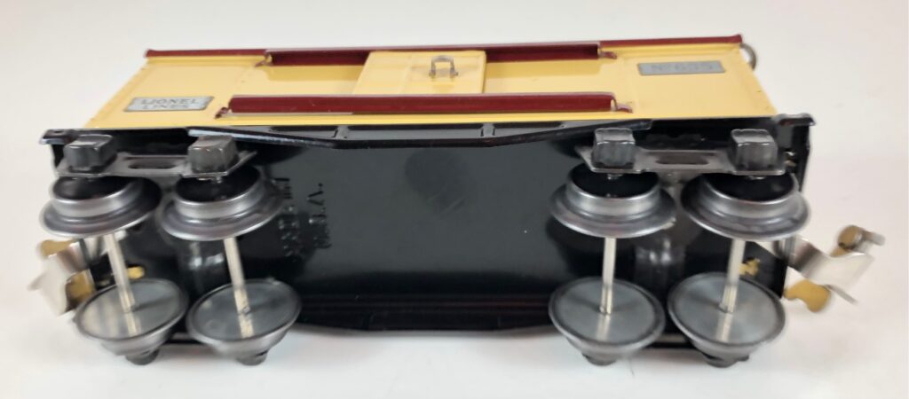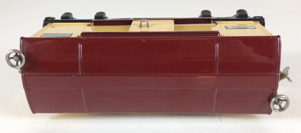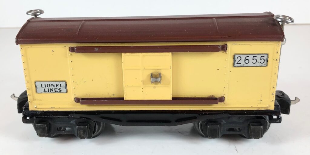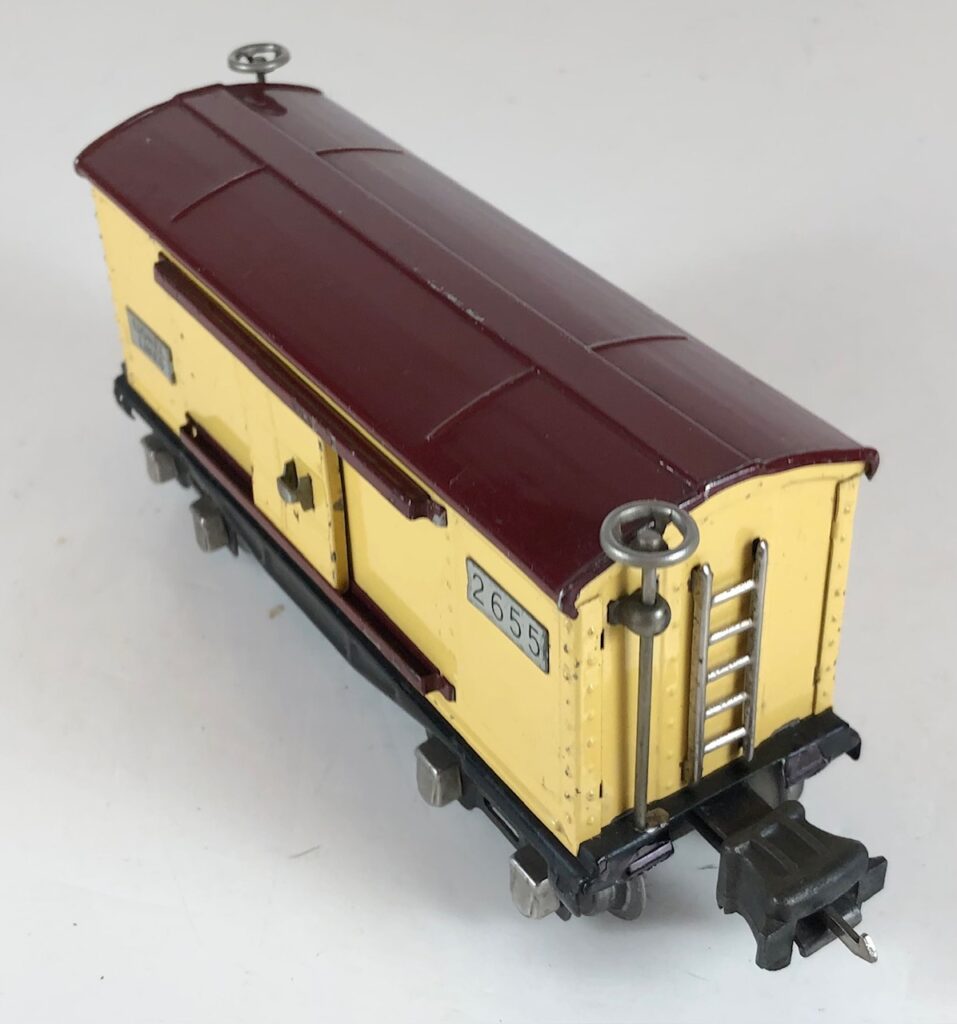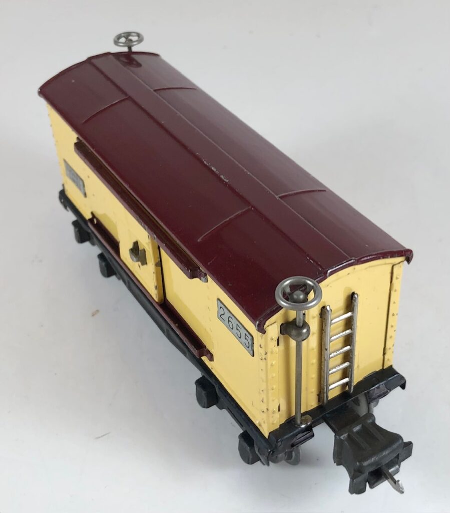1. No. 2655 Box Car in cream with maroon roof and door guides (1938). The cars have aluminum plates, nickel trim and nickel journals. The cars have early style operating box couplers.