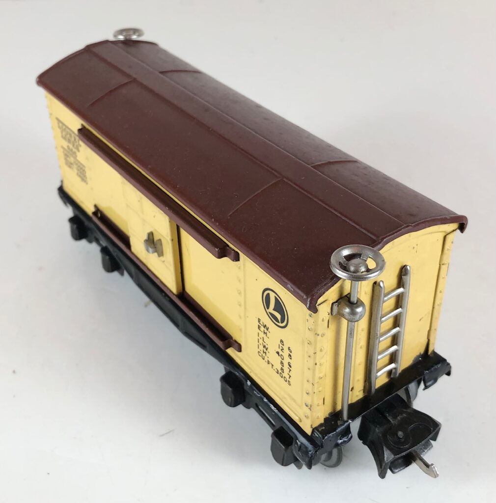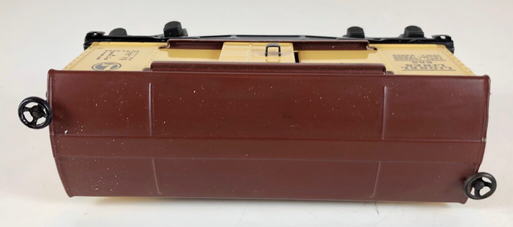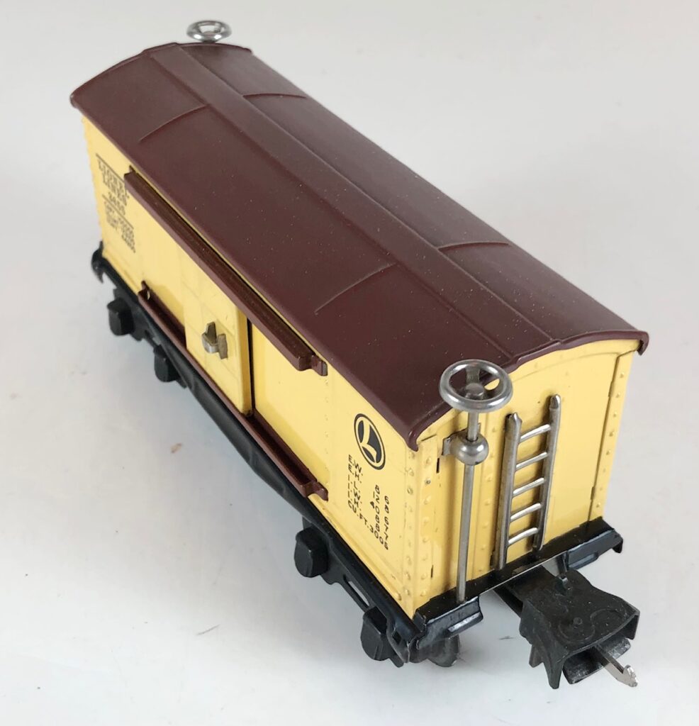 6. No. 655 Box Car in cream with Tuscan brown roof and door guides (1941-1942). The cars have black, rubber stamped number and data, nickel trim and black journals. The cars have late style manual box couplers.