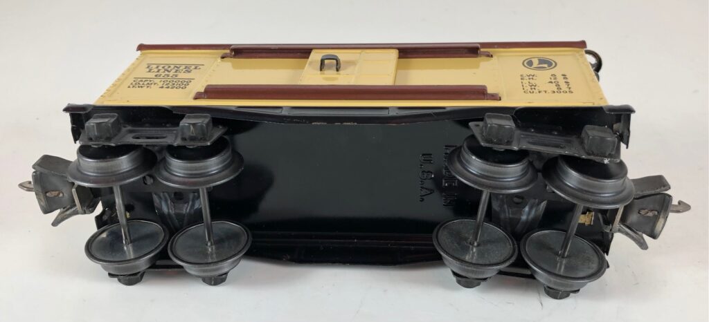 Variations of the No. 655 Box Cars include different roof color; brass or nickel trim; copper, nickel or black journals; and brass or aluminum metal identification plates or rubber stamping. Early box cars have latch couplers. The last box cars have late style manual box couplers.