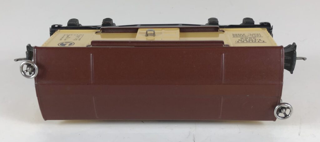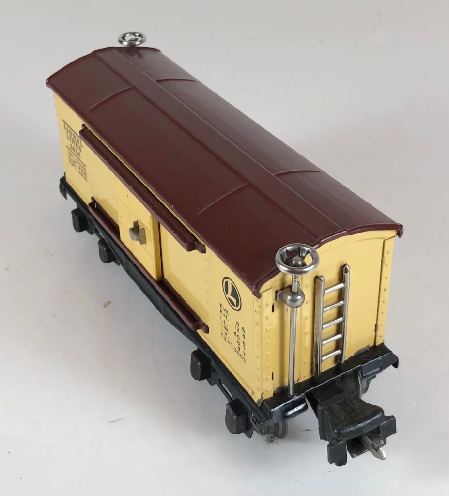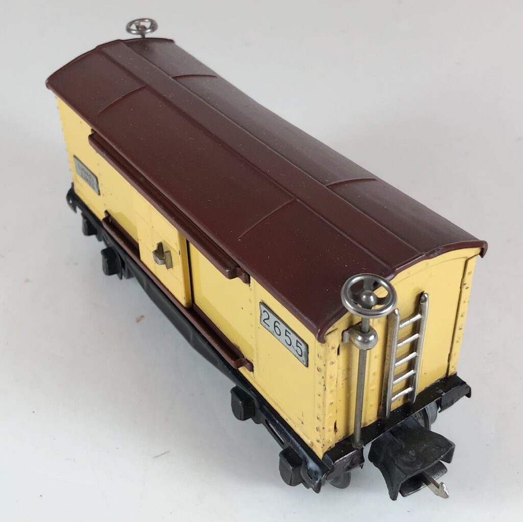 3. No. 2655 Box Car in cream with Tuscan brown roof and door guides (1939). The cars have aluminum plates, nickel trim and black journals. The cars have late style operating box couplers.