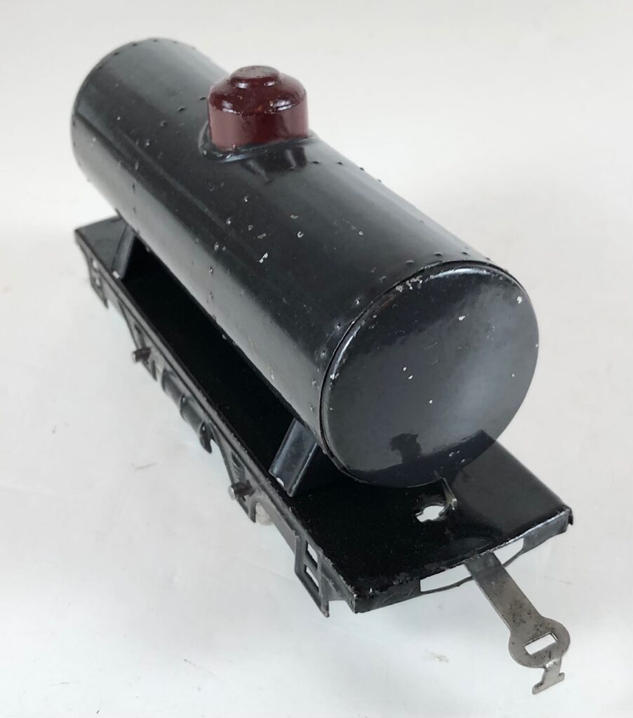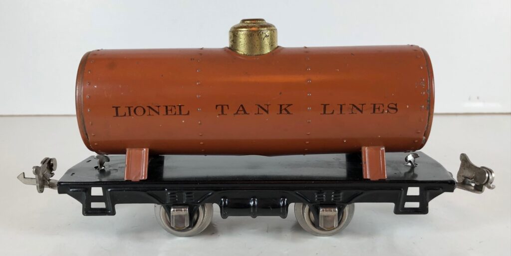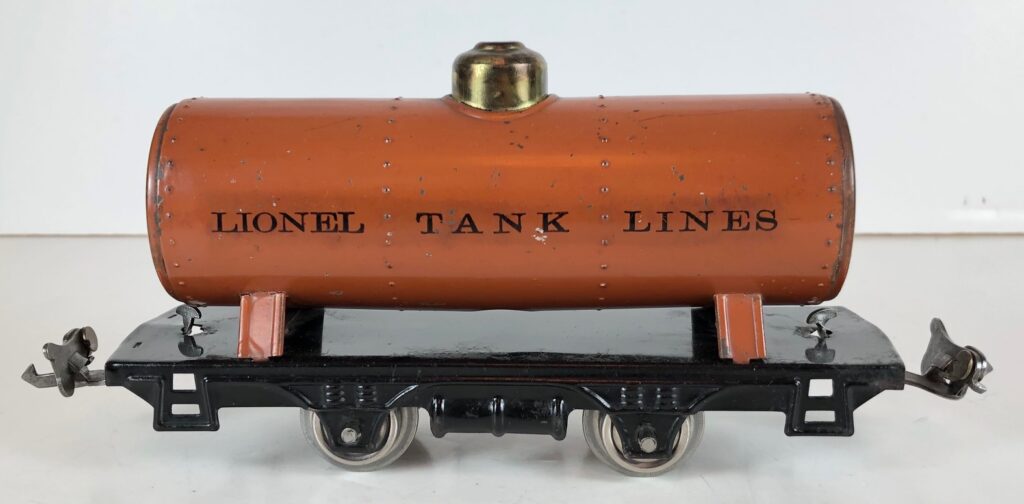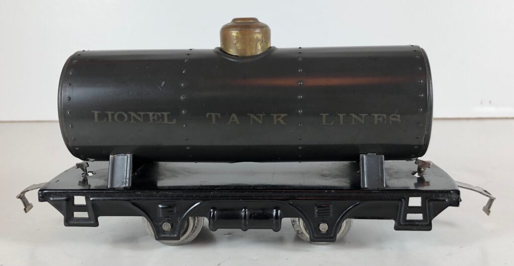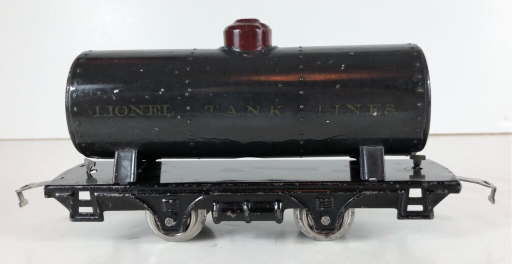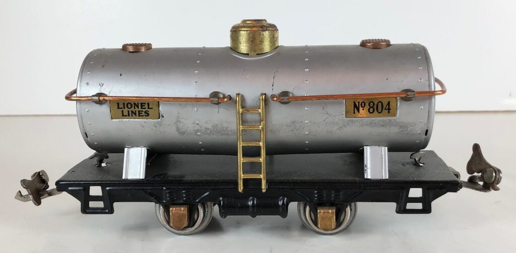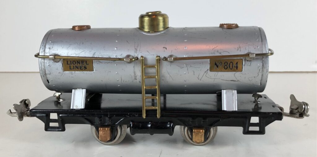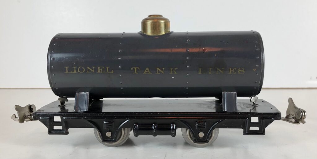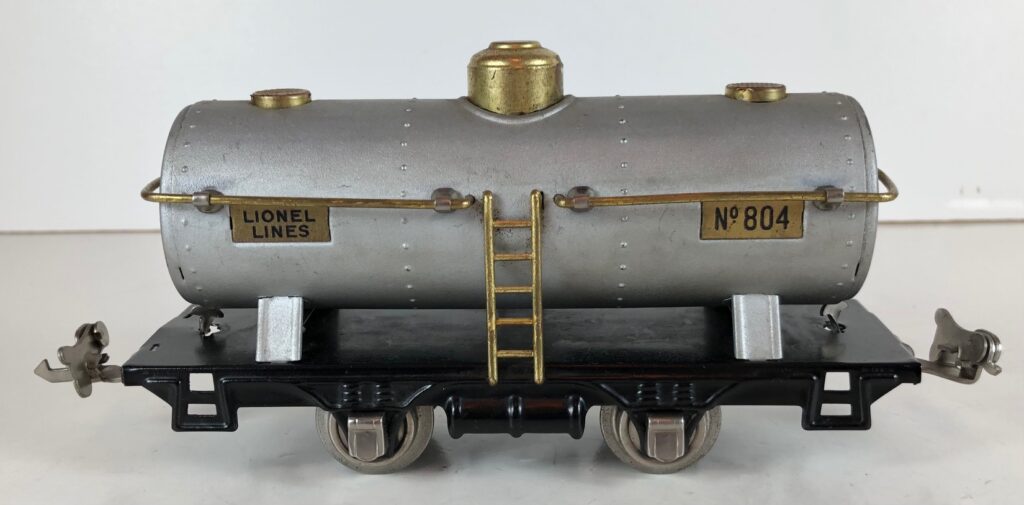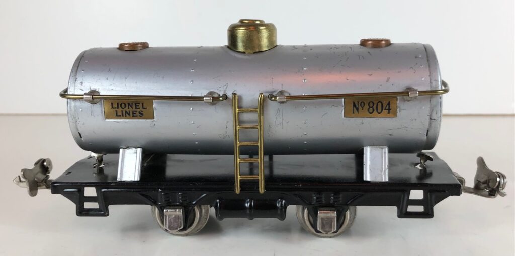 1. No. 804 Tank Car in dark gray with dark red painted center dome (1923). The cars have “Lionel Tank Lines” rubber stamped in gold on the sides of the car. The cars have no trim and no journals. The cars have tongue and slot couplers.