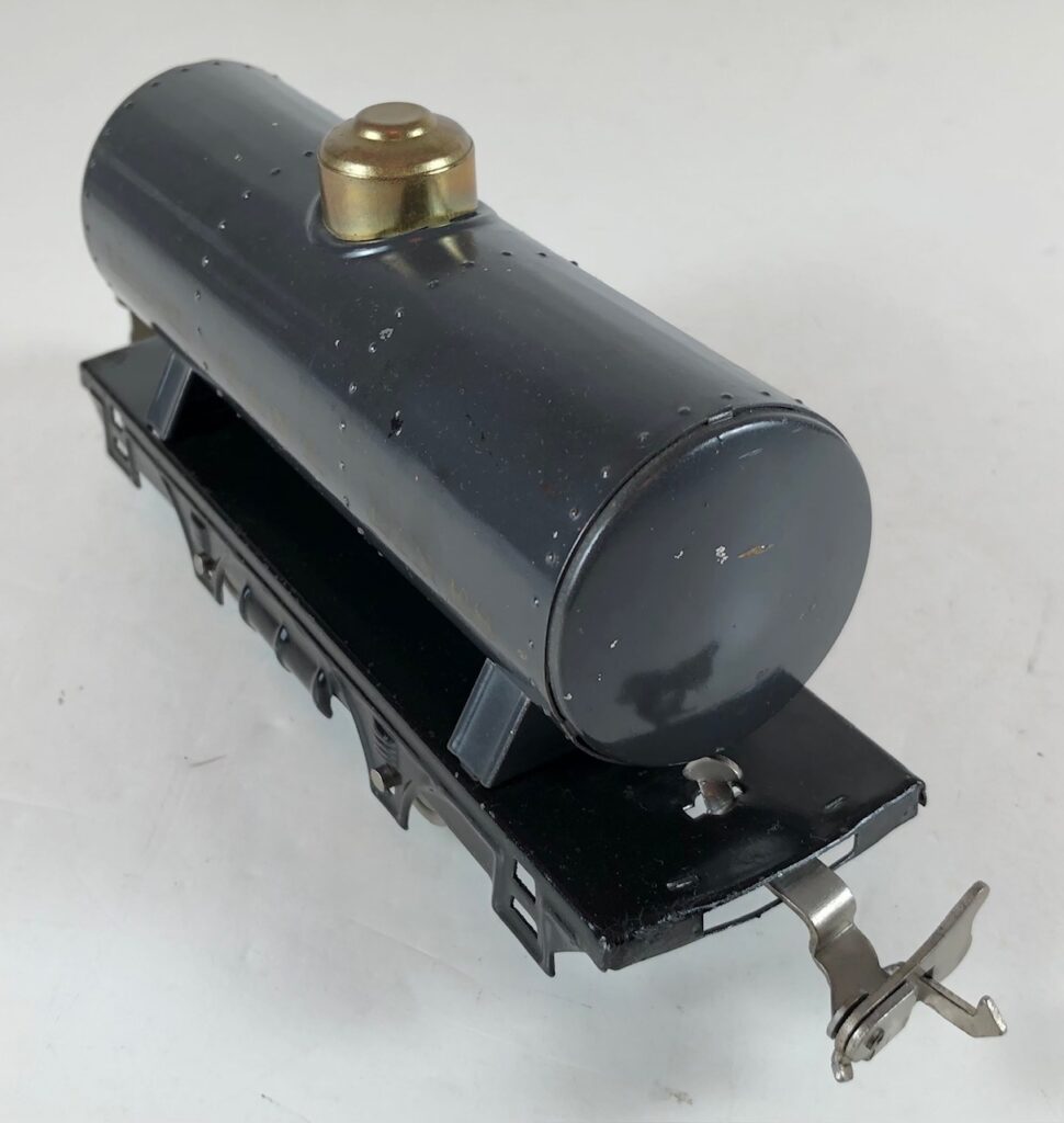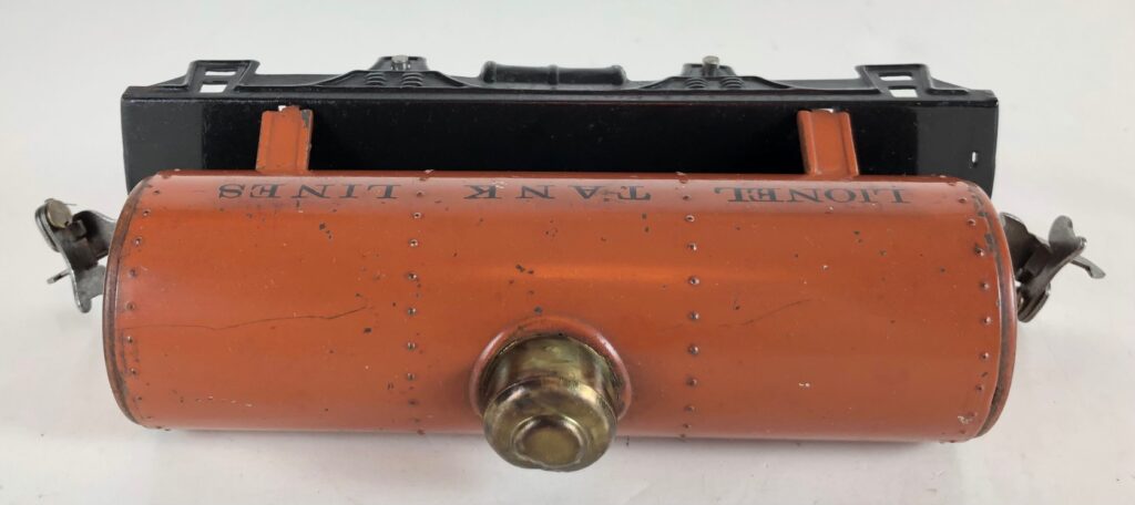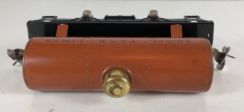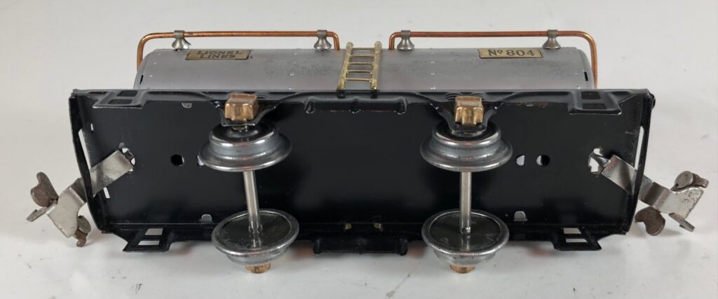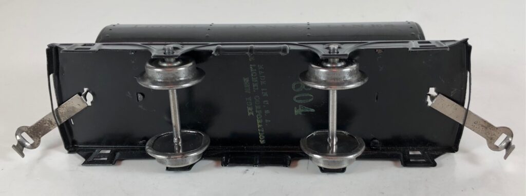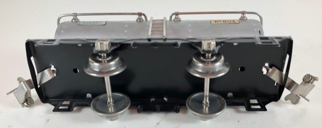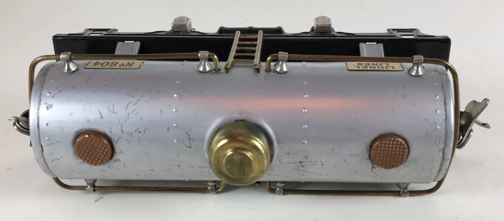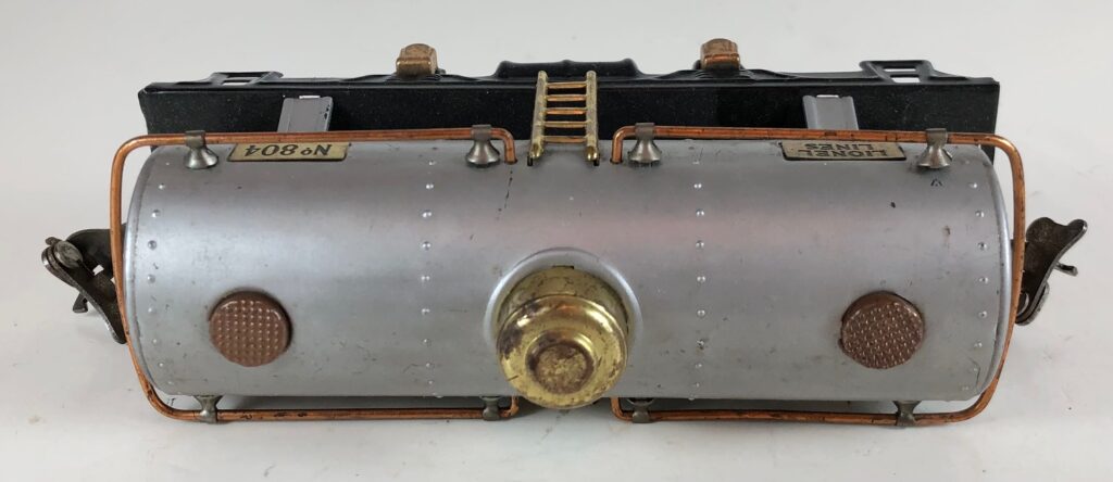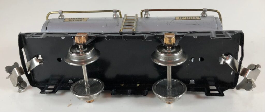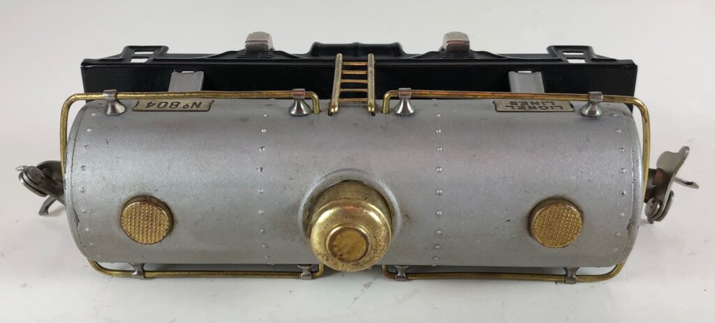 2. No. 804 Tank Car in dark gray with brass center dome (1923-1924). The cars have “Lionel Tank Lines” rubber stamped in gold on the sides of the car. The cars have “Made in U.S.A. / The Lionel Corporation / New York” rubber stamped on the underside of the car. The cars have no trim and no journals. The cars have tongue and slot couplers.