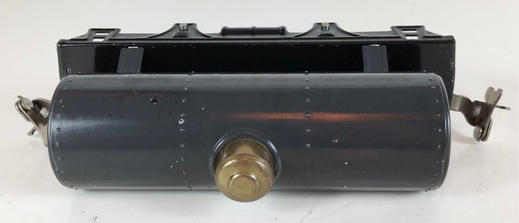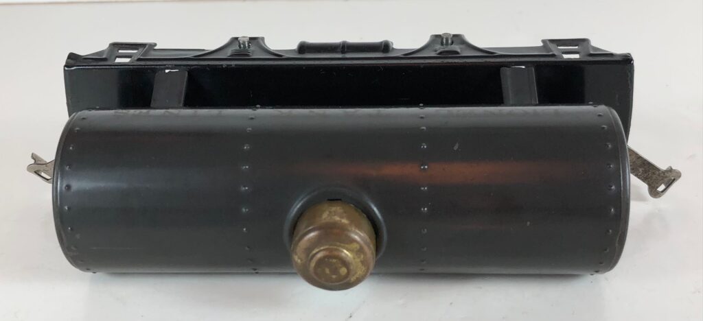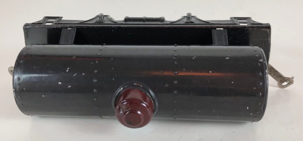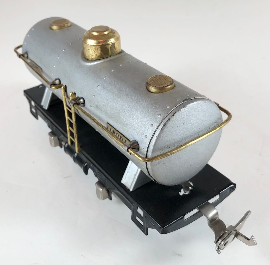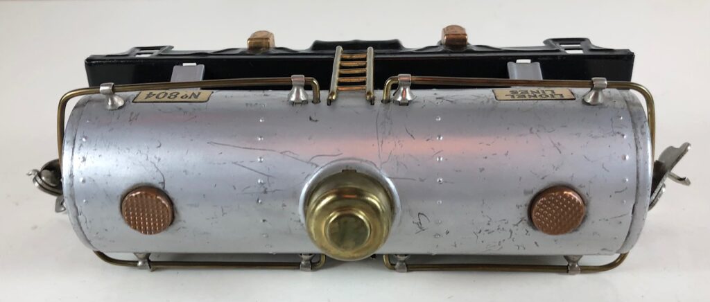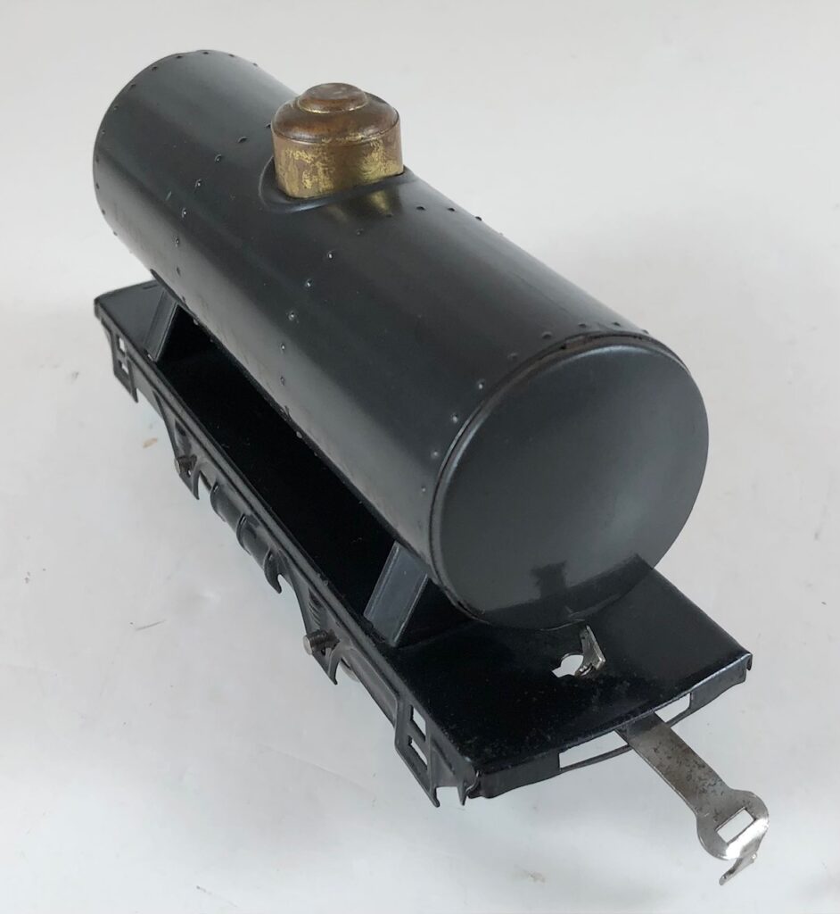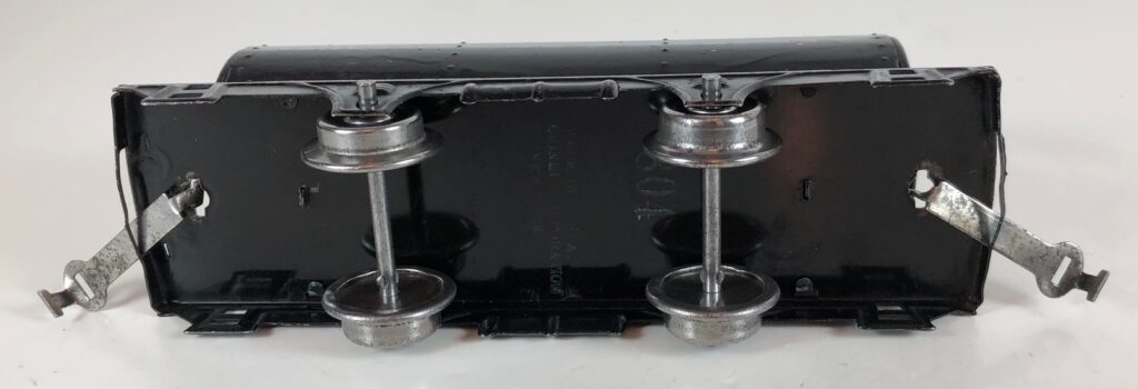 2. No. 804 Tank Car in dark gray with brass center dome (1923-1924). The cars have “Lionel Tank Lines” rubber stamped in gold on the sides of the car. The cars have “Made in U.S.A. / The Lionel Corporation / New York” rubber stamped on the underside of the car. The cars have no trim and no journals. The cars have tongue and slot couplers.