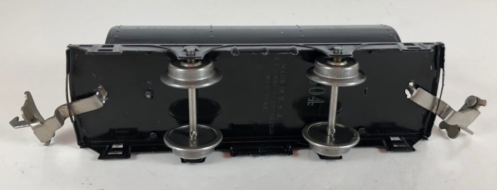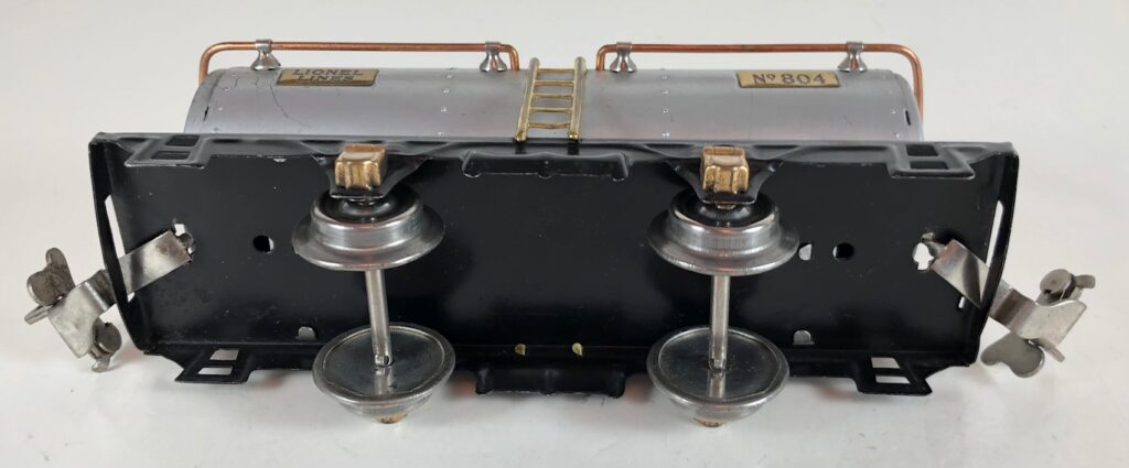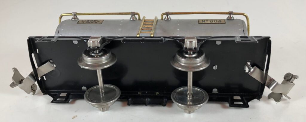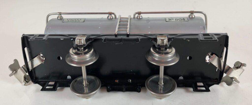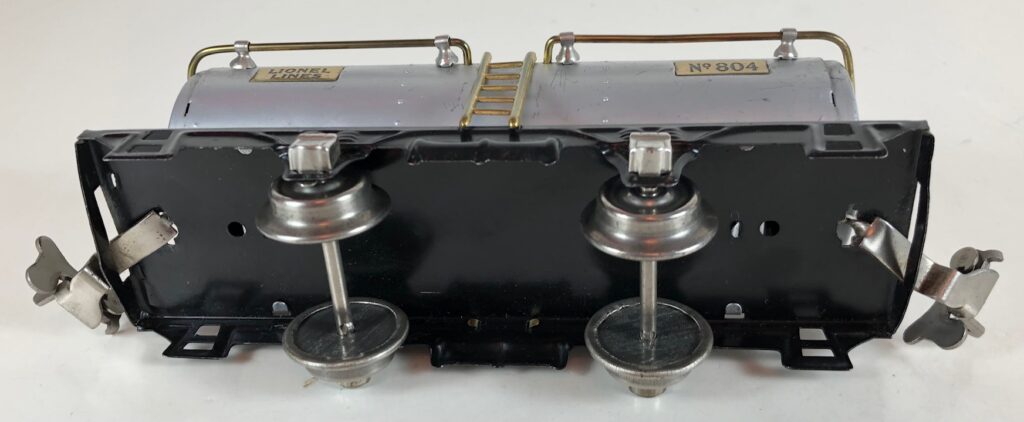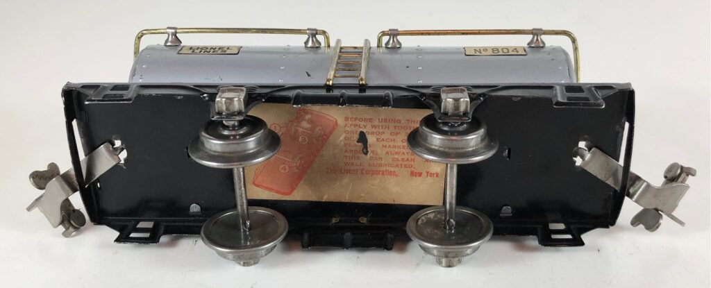 3. No. 804 Tank Car in dark gray with brass center dome (1925-1926). The cars have “Lionel Tank Lines” rubber stamped in gold on the sides of the car. The cars have the number and “Made in U.S.A. / The Lionel Corporation / New York” rubber stamped on the underside of the car. The cars have no trim and no journals. The cars have latch couplers.