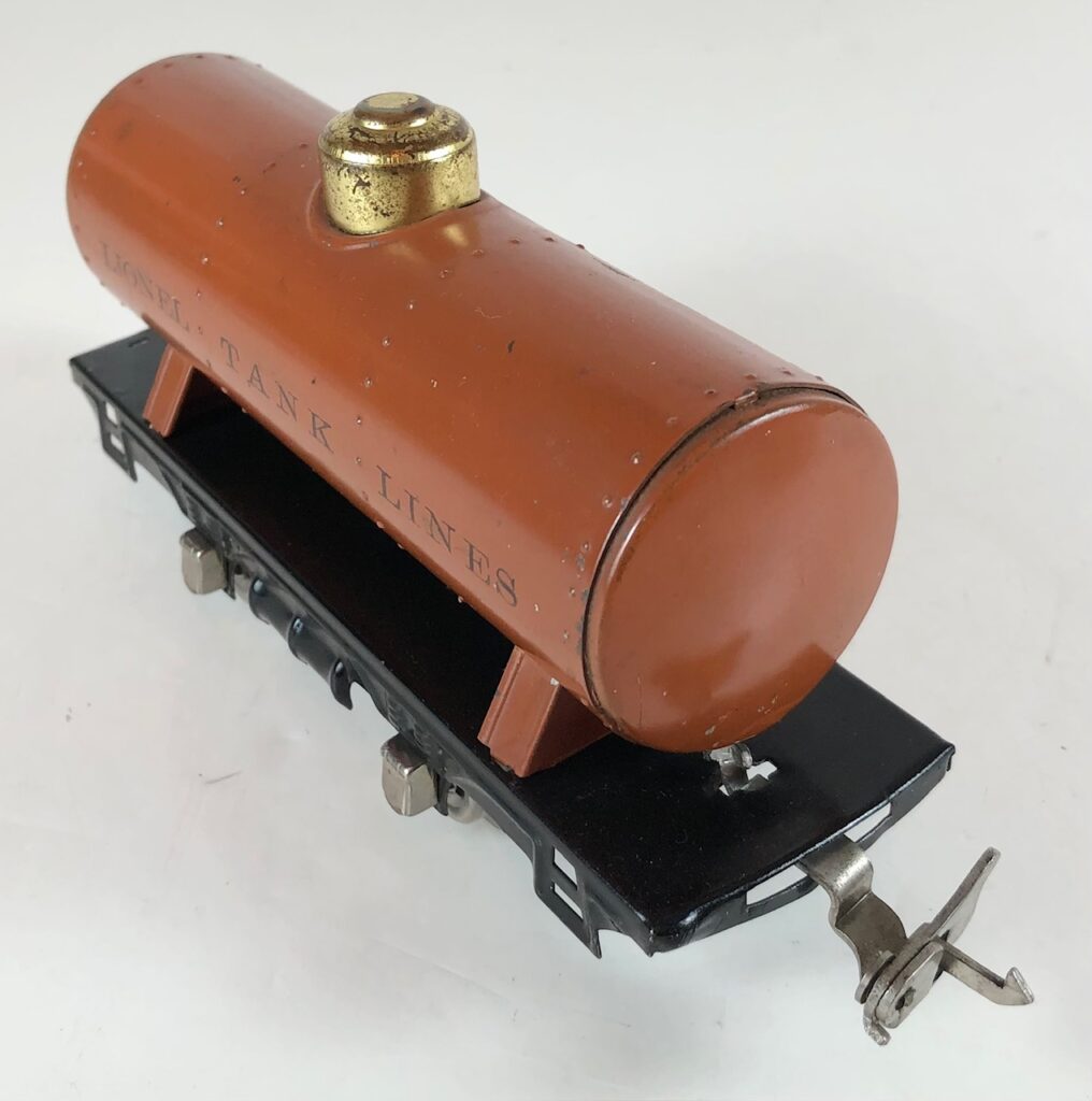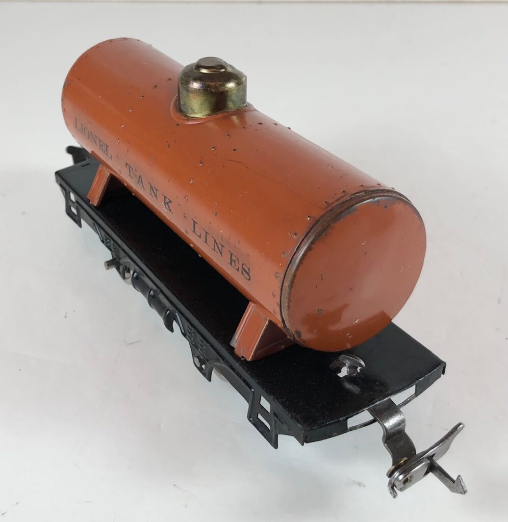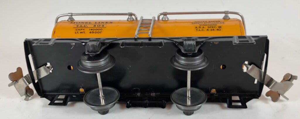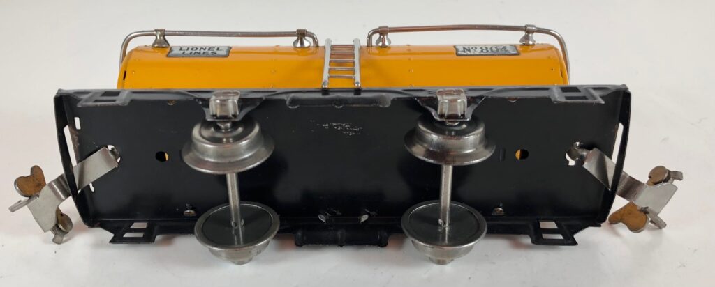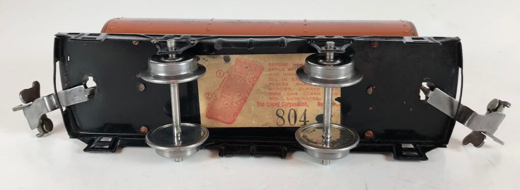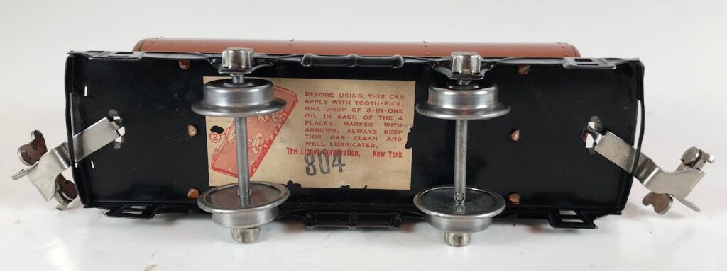 6. No. 804 Tank Car in terra cotta with brass center dome (1926-1928). The cars have “Lionel Tank Lines” rubber stamped in black on the sides of the car. The cars have the number rubber stamped on the lubrication sticker on the underside of the car. The cars have no trim and nickel journals. The cars have latch couplers.