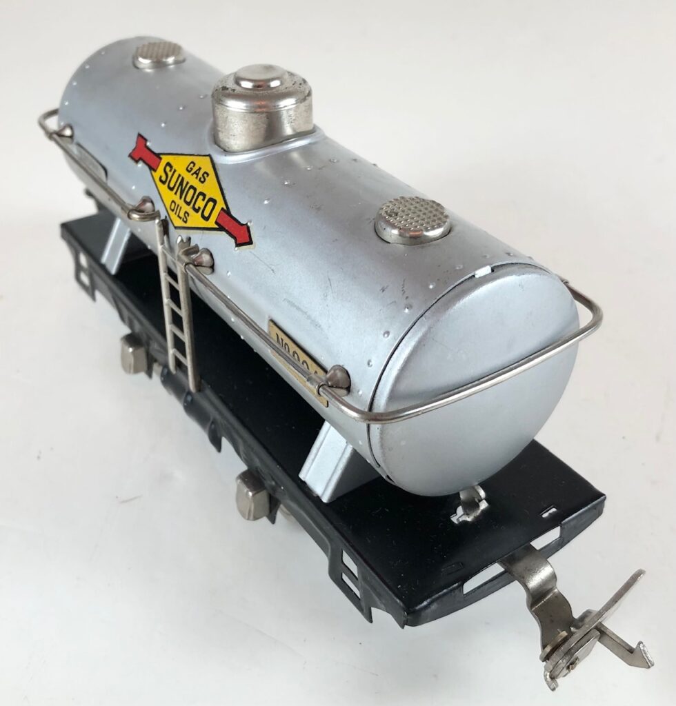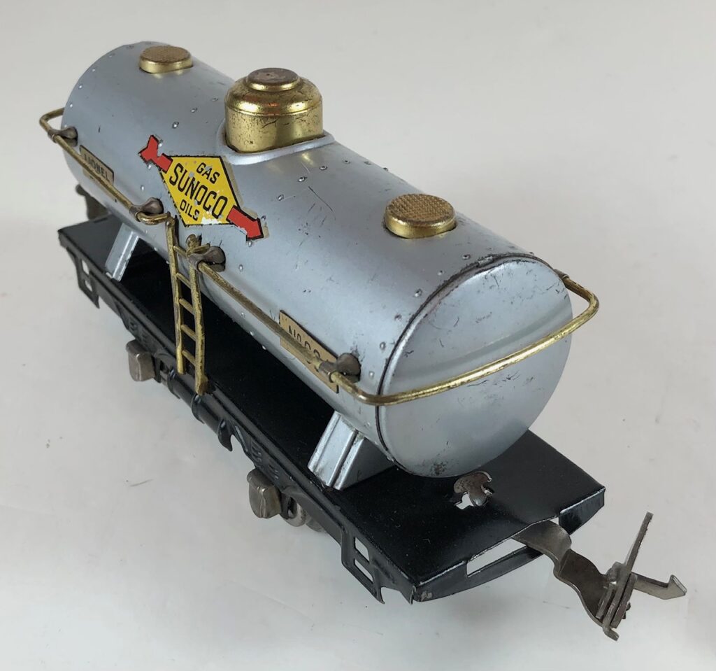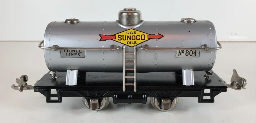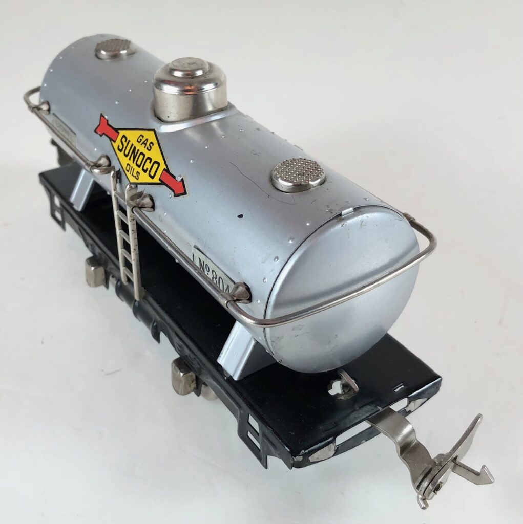 15. No. 804 Tank Car in silver with nickel center and end domes (1935). The cars have Sunoco decals, aluminum plates, nickel trim and nickel journals. The cars have latch couplers.