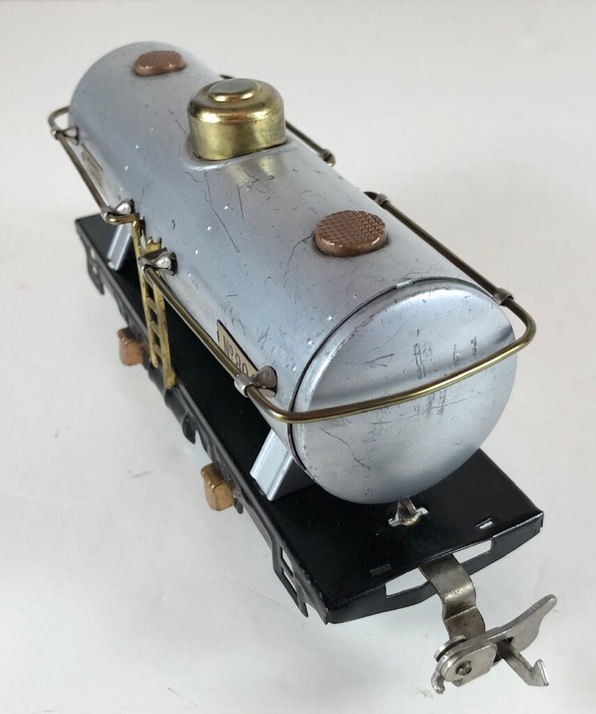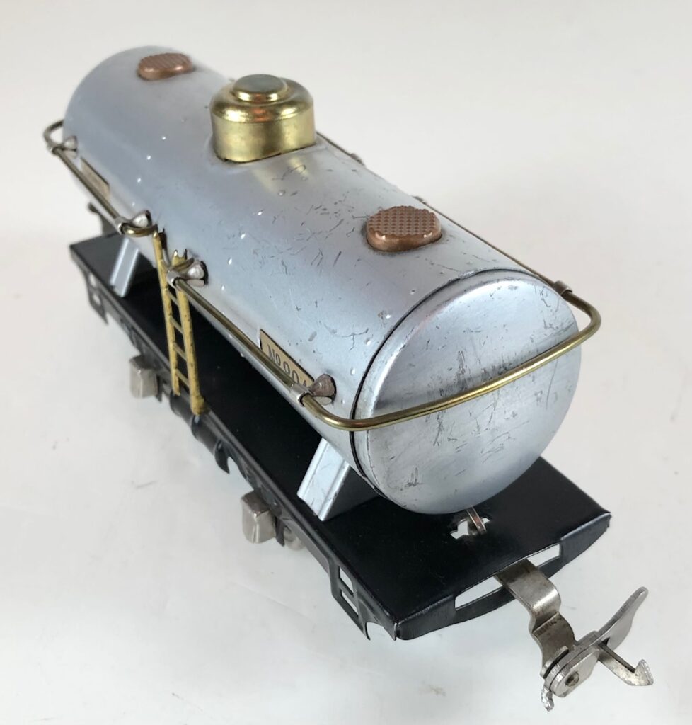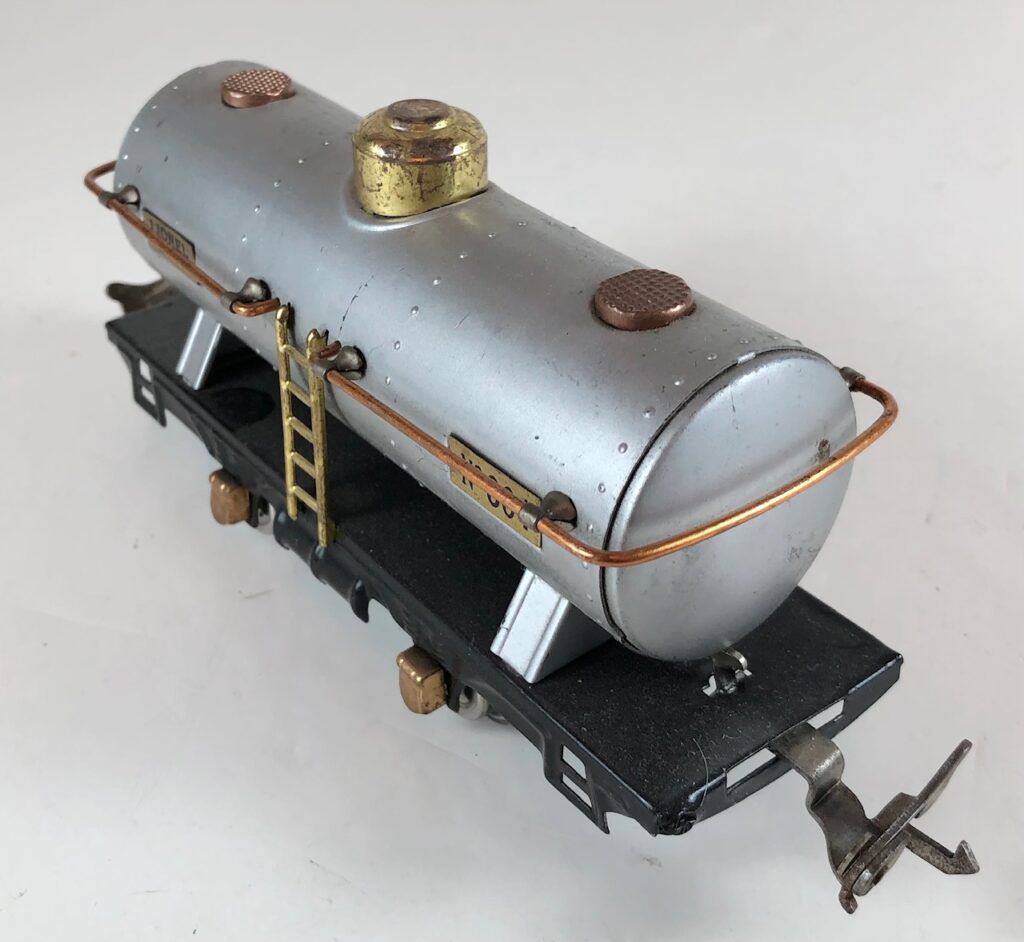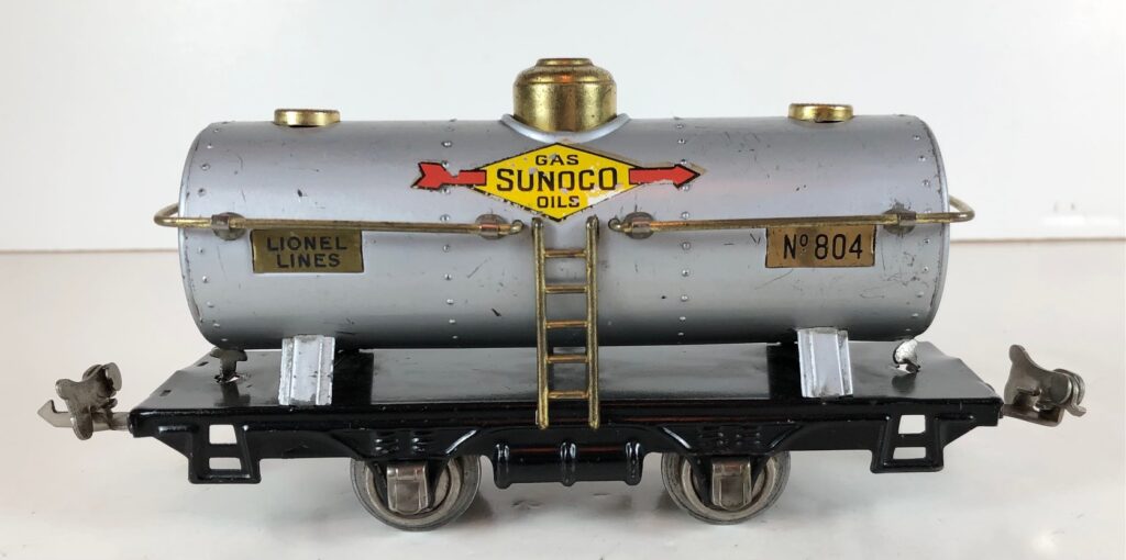 15. No. 804 Tank Car in silver with nickel center and end domes (1935). The cars have Sunoco decals, aluminum plates, nickel trim and nickel journals. The cars have latch couplers.