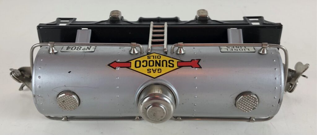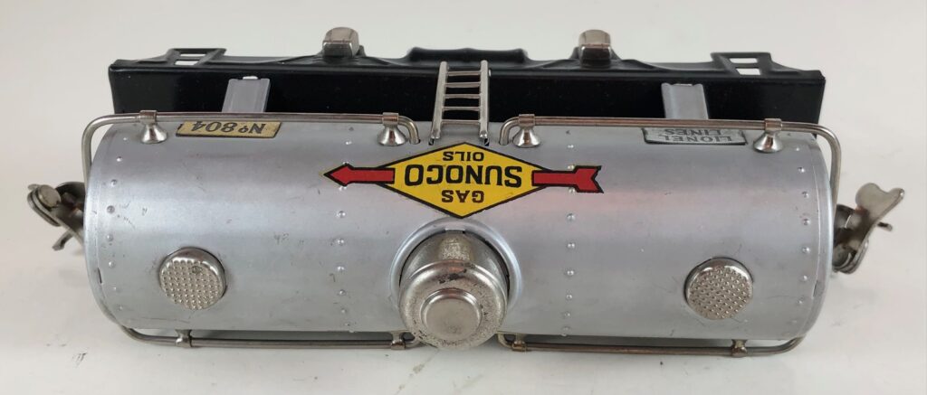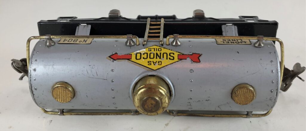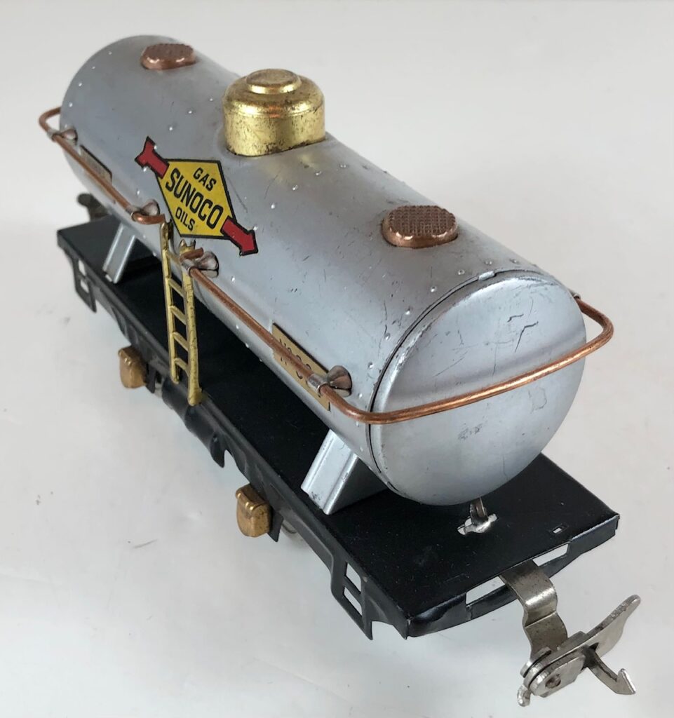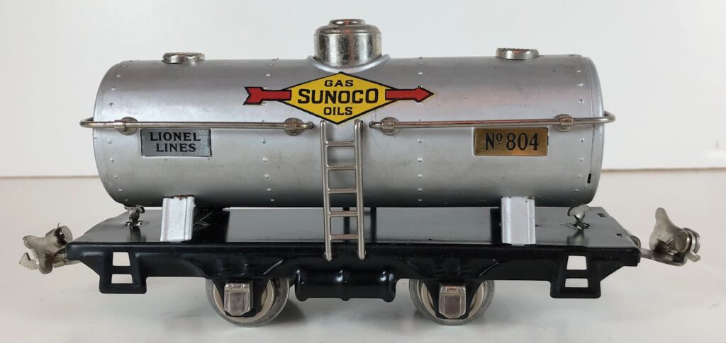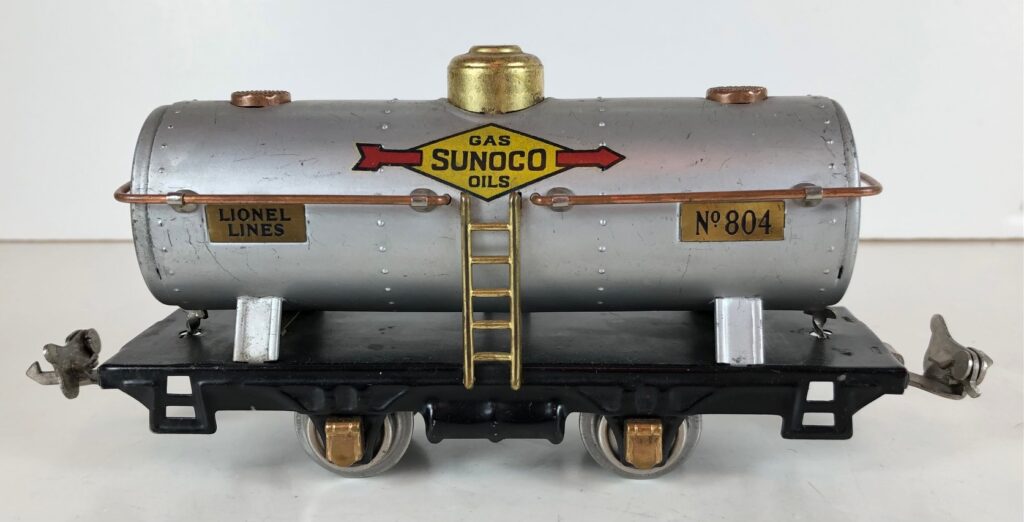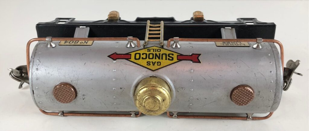 12. No. 804 Tank Car in silver with brass center and end domes (1934). The cars have centered Sunoco decals, brass plates, brass trim and nickel journals. The cars have a lubrication sticker on the underside. The cars have latch couplers.
