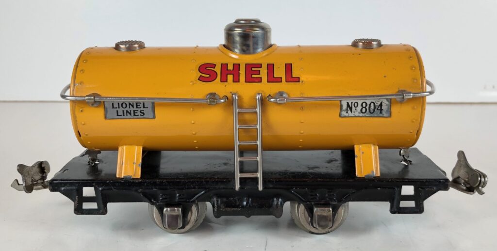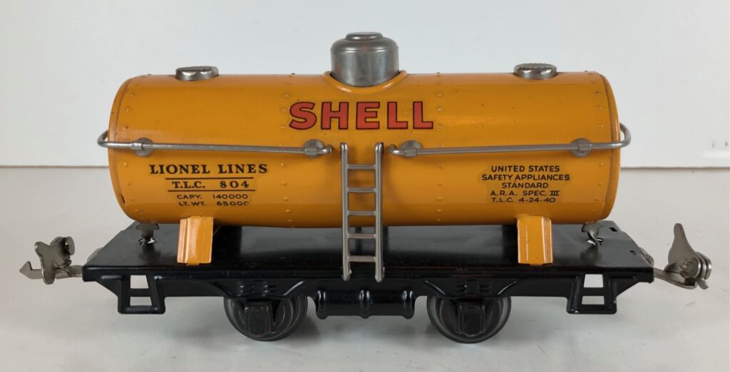 17. No. 804 Tank Car in orange with nickel center and end domes (1940-1941). The cars have Shell decals, number and capacity decals, nickel trim and black journals. The cars have latch couplers.
