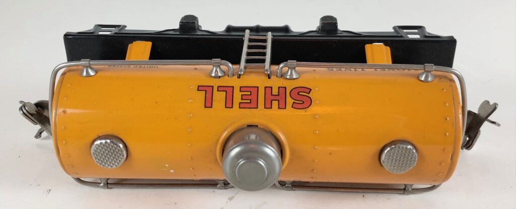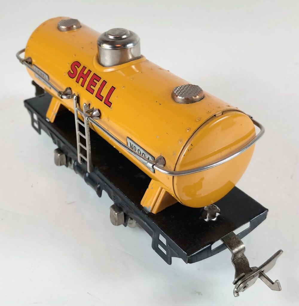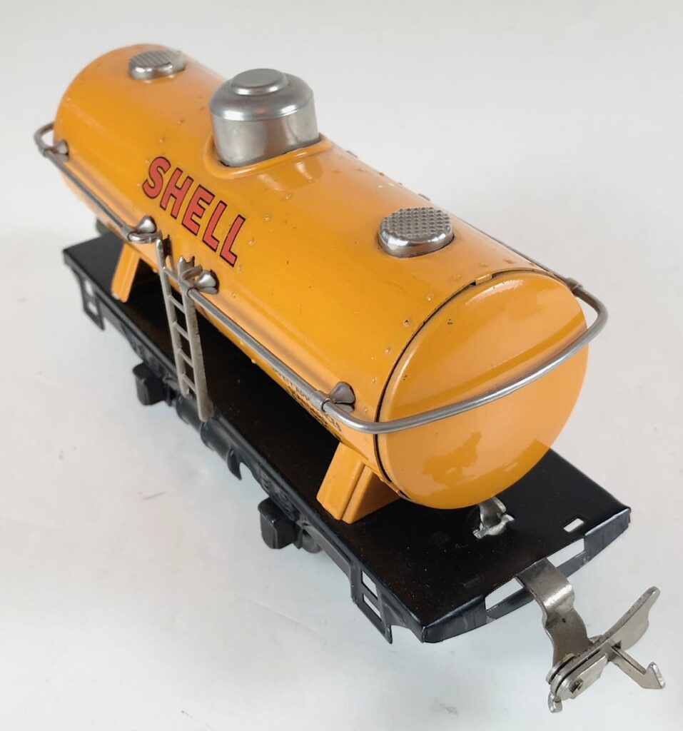 16. No. 804 Tank Car in orange with nickel center and end domes (1939-1940). The cars have Shell decals, aluminum plates, nickel trim and nickel journals. The cars have latch couplers.