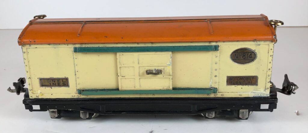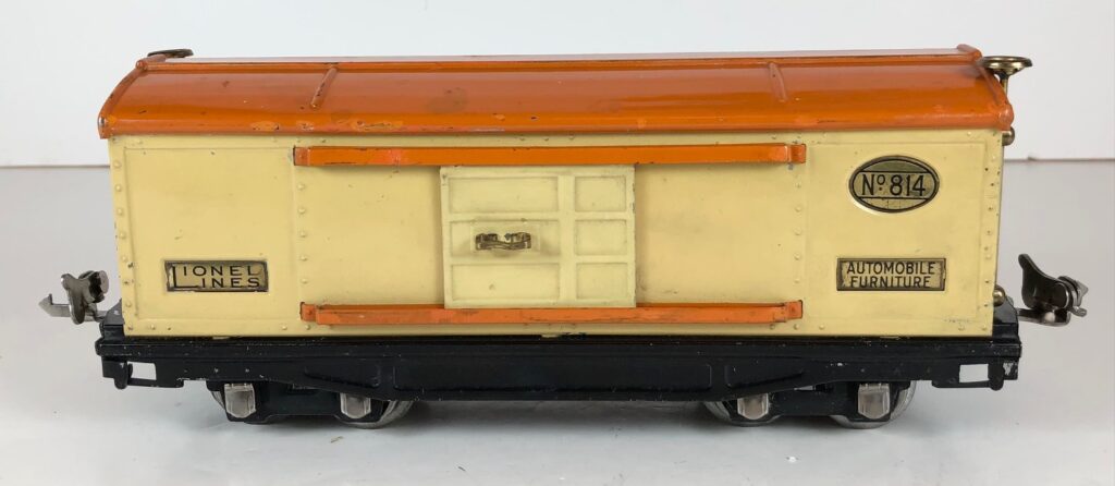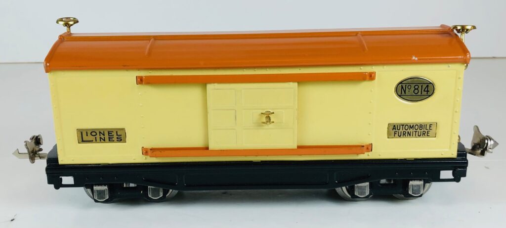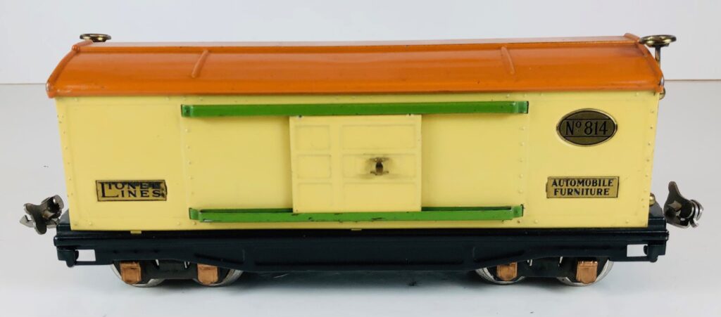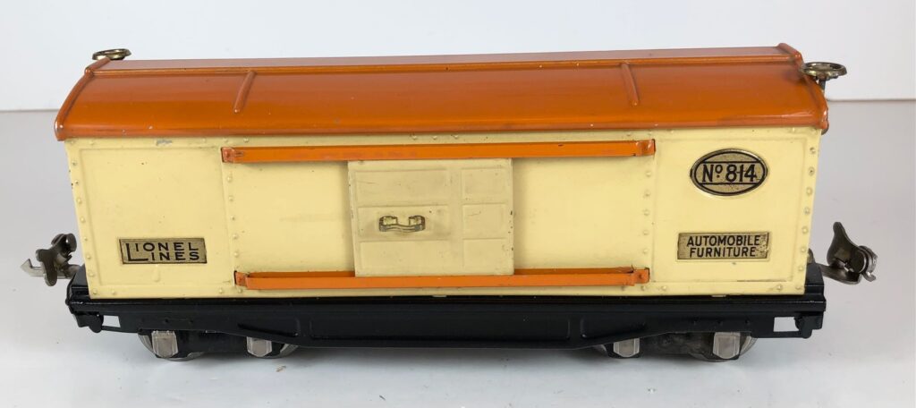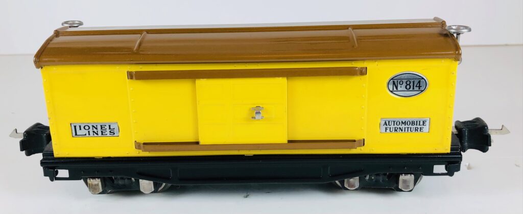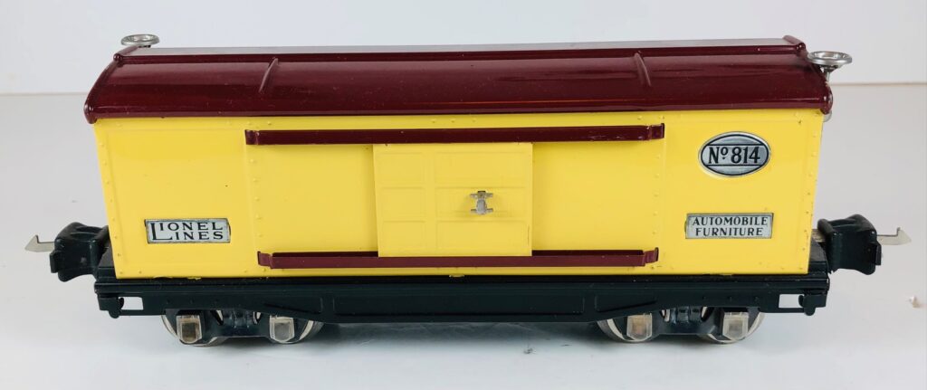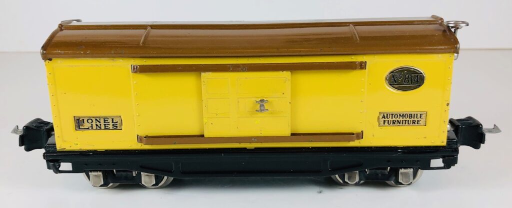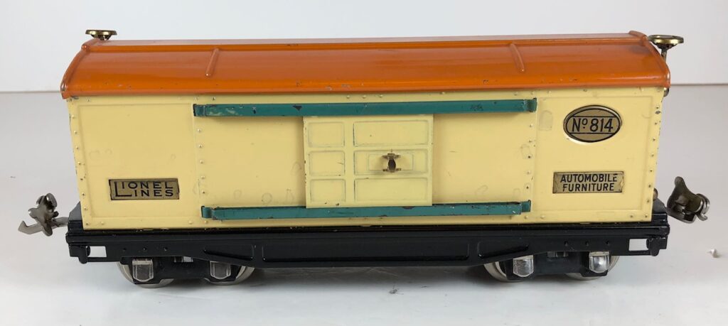 The Lionel No. 814 Box Cars were introduced in 1926 and were issued through 1942. The No. 814 Box Cars always had manual couplers. The No. 814 Box Cars measure 9-inches in length. The box cars had contrasting colors for the body and roof. The frame was always black. The cars had sliding doors that opened. The doors always matched the car body color and have a handle in the center. The door guides typically matched the roof color, but exceptions are noted below. The box cars have metal plates to identify the number, “Automotive Furniture”, and “Lionel Lines”.