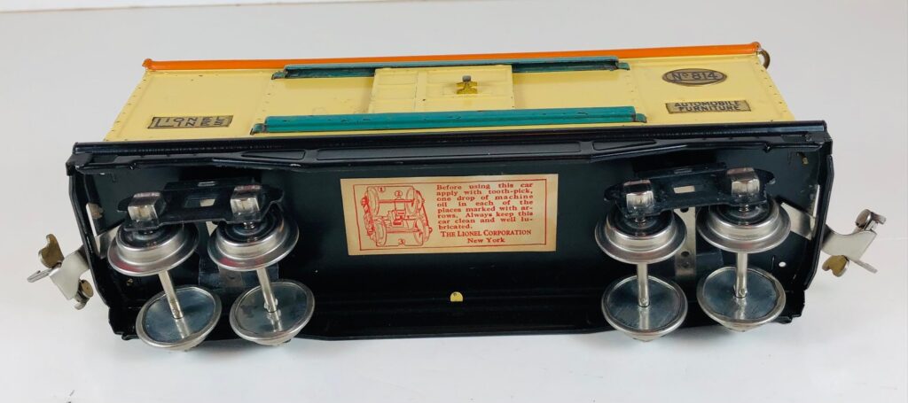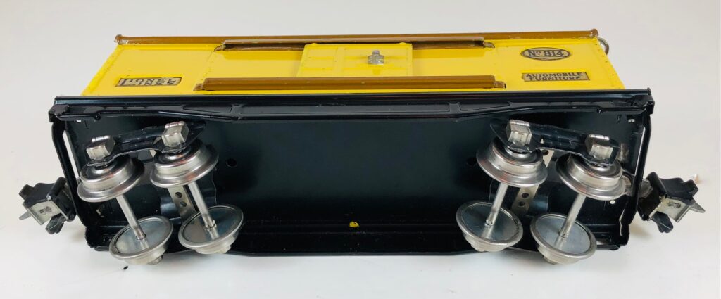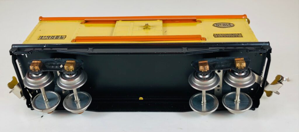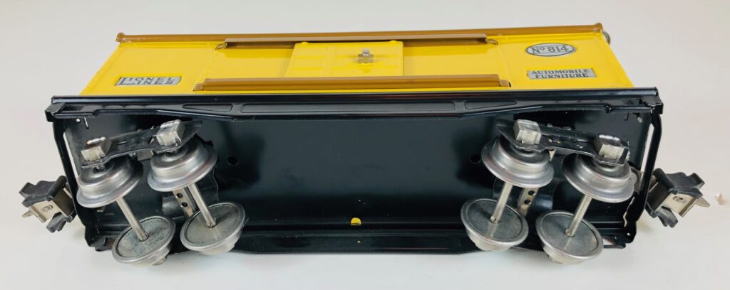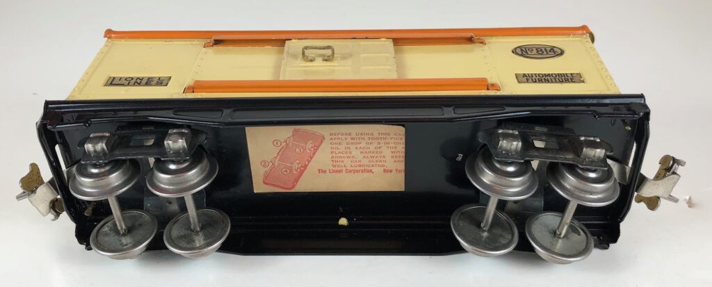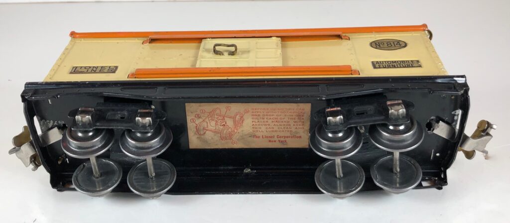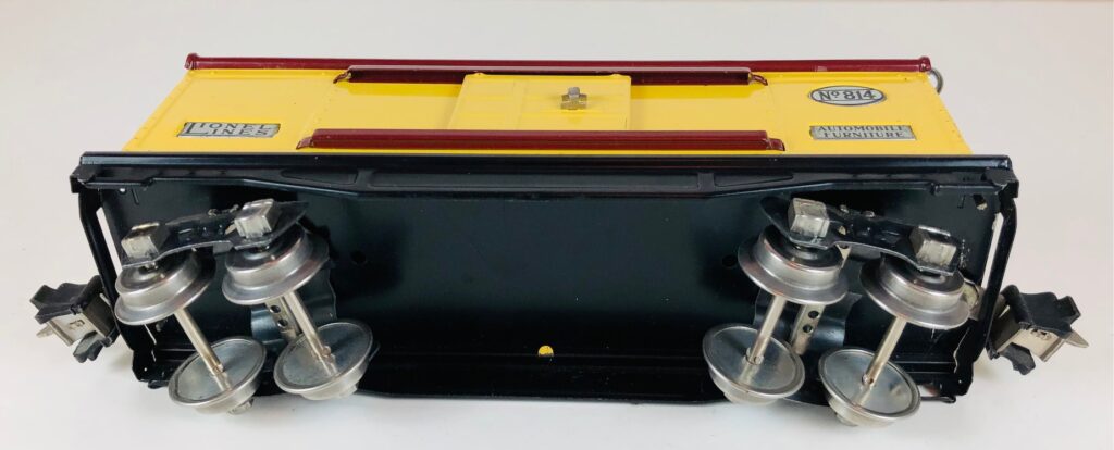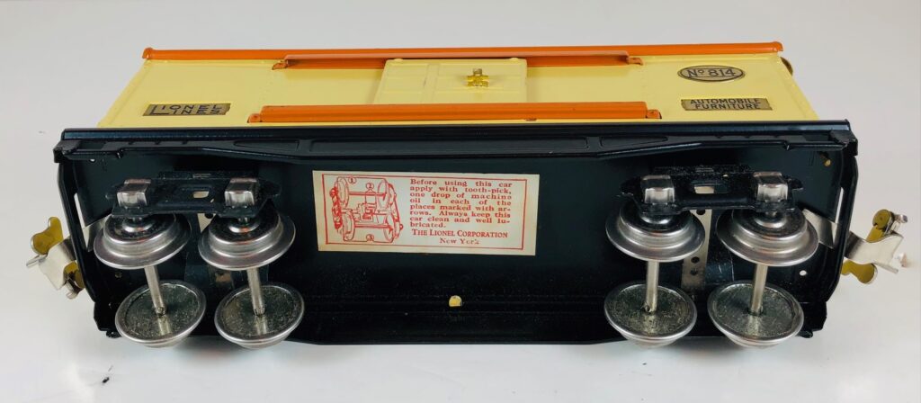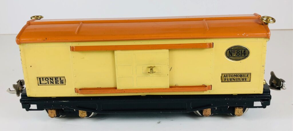 The Lionel No. 814 Box Cars were introduced in 1926 and were issued through 1942. The No. 814 Box Cars always had manual couplers. The No. 814 Box Cars measure 9-inches in length. The box cars had contrasting colors for the body and roof. The frame was always black. The cars had sliding doors that opened. The doors always matched the car body color and have a handle in the center. The door guides typically matched the roof color, but exceptions are noted below. The box cars have metal plates to identify the number, “Automotive Furniture”, and “Lionel Lines”.