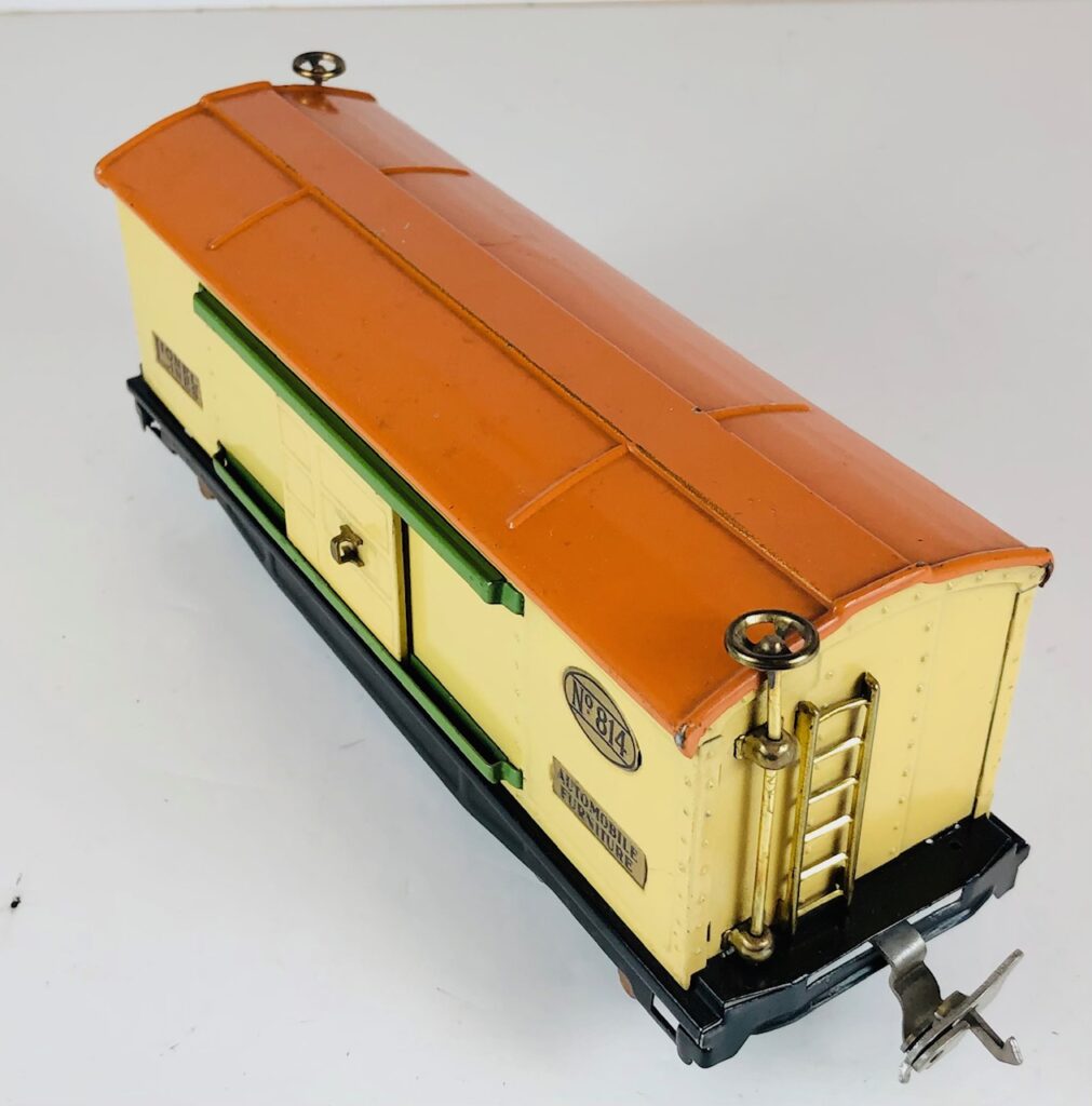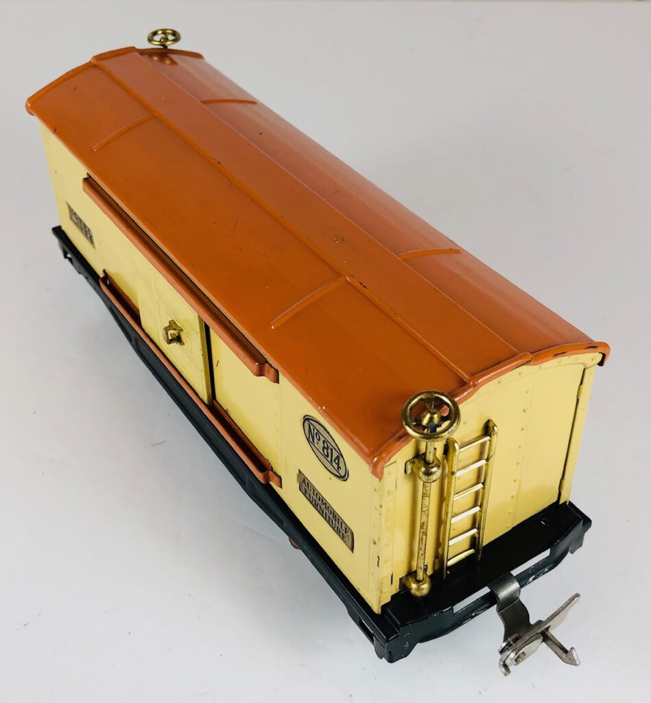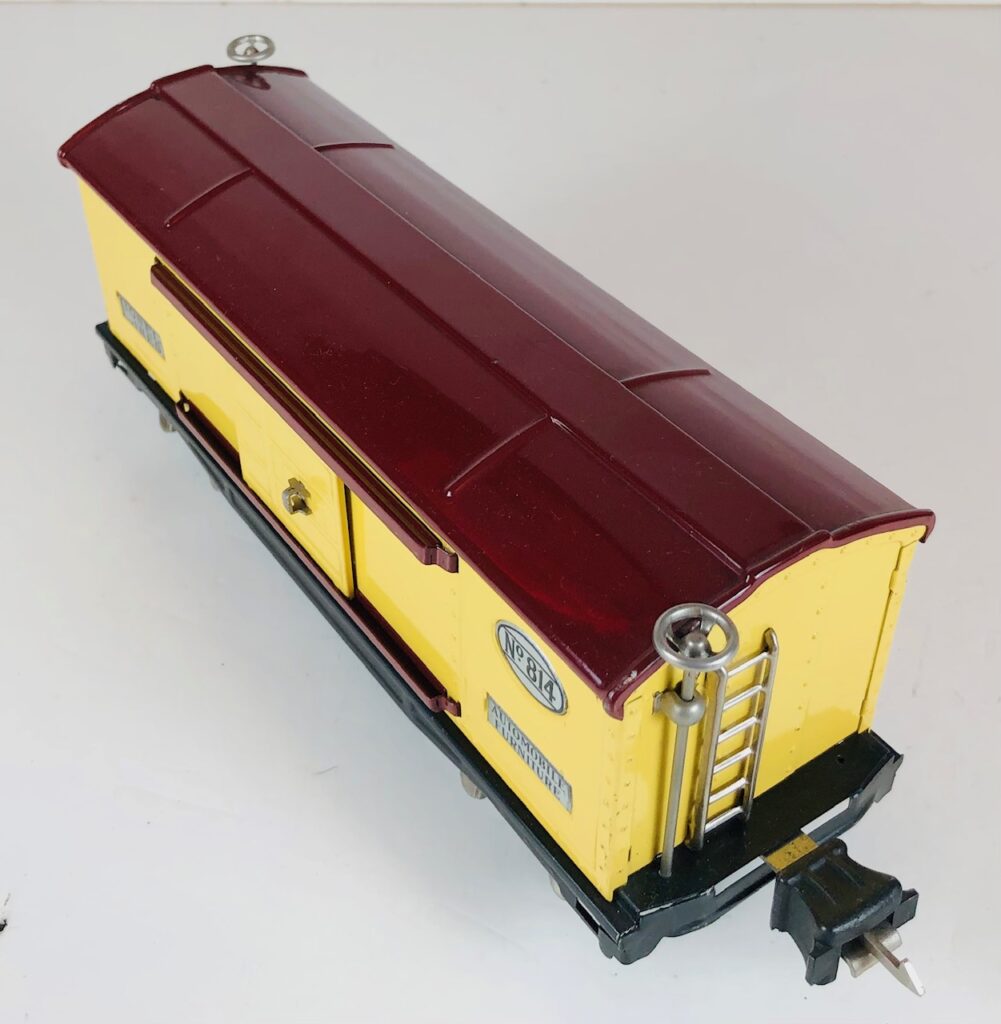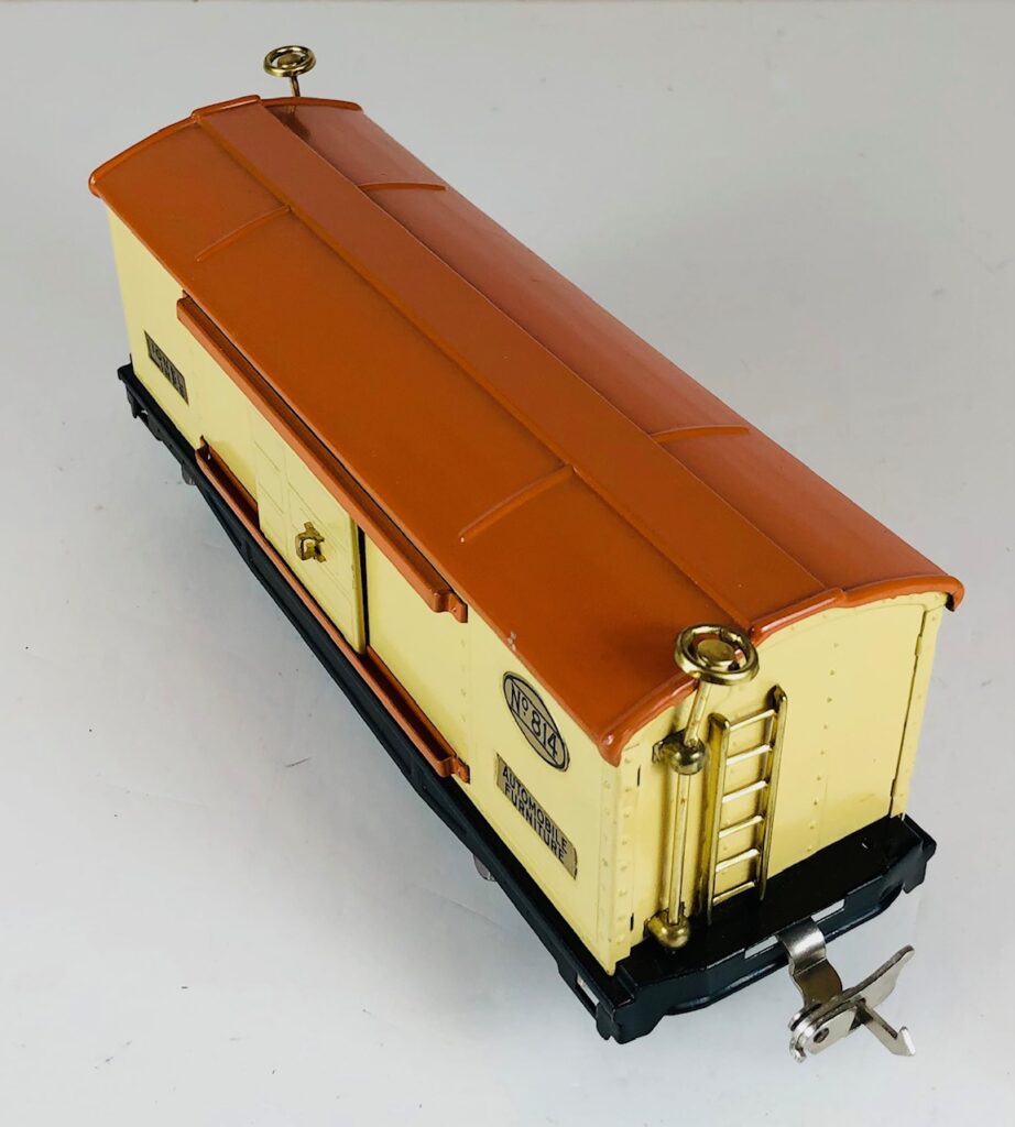 2. No. 814 Box Car in cream with orange roof (1926). The cars have brass plates, large door handles, brass trim and nickel journals. The cars have latch couplers.