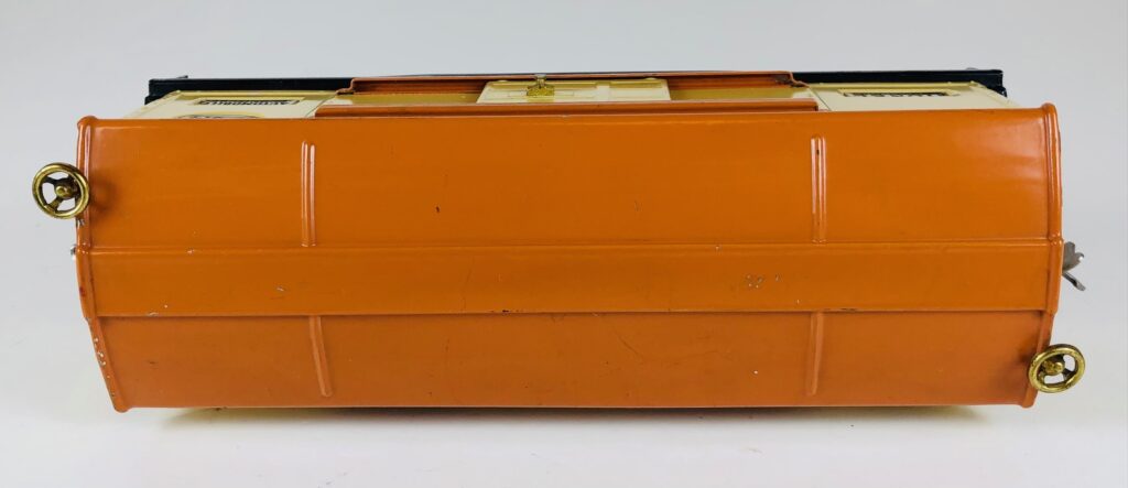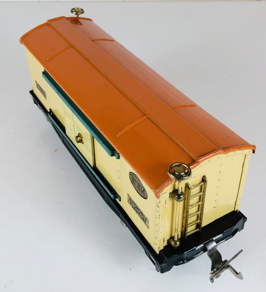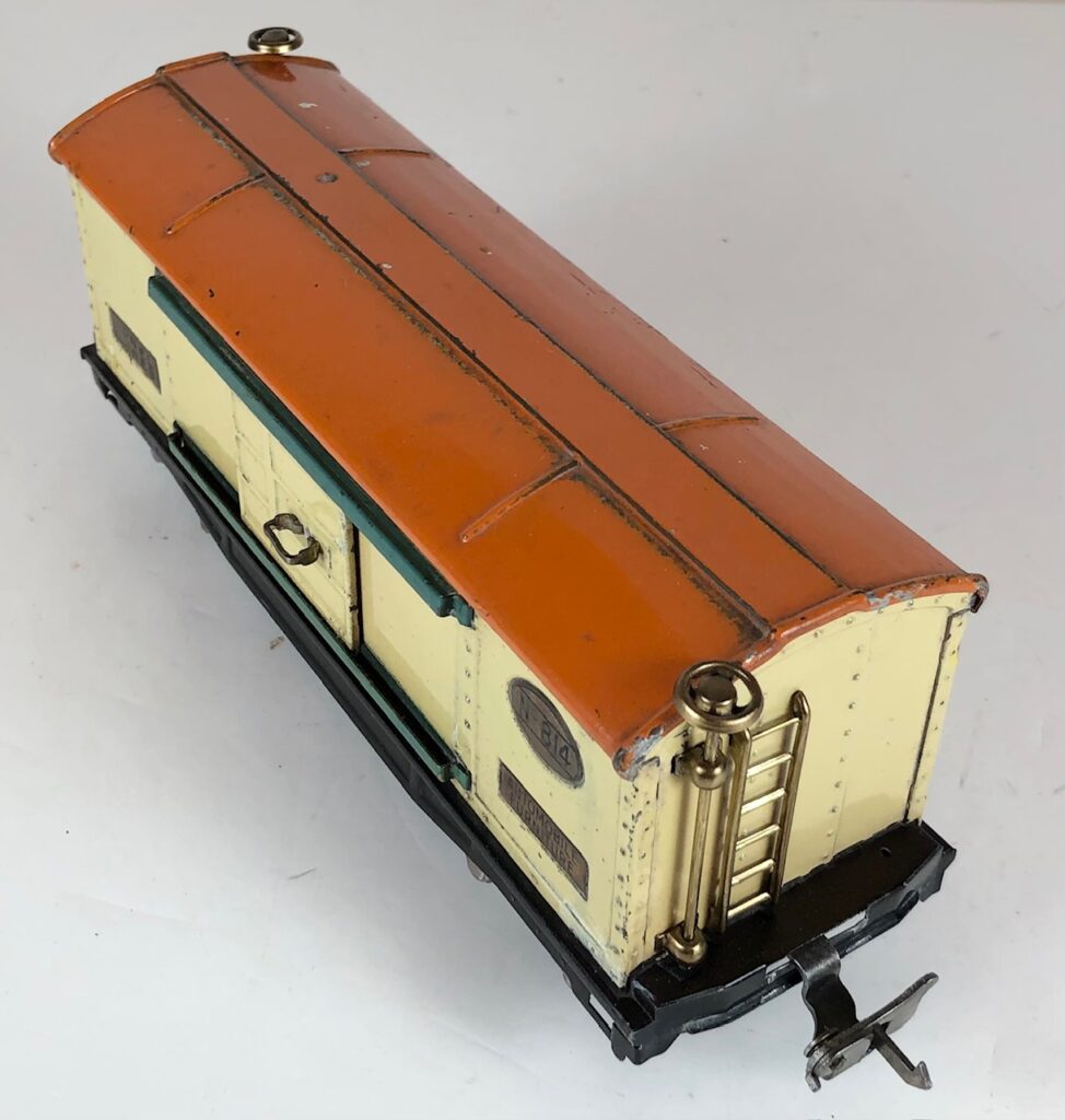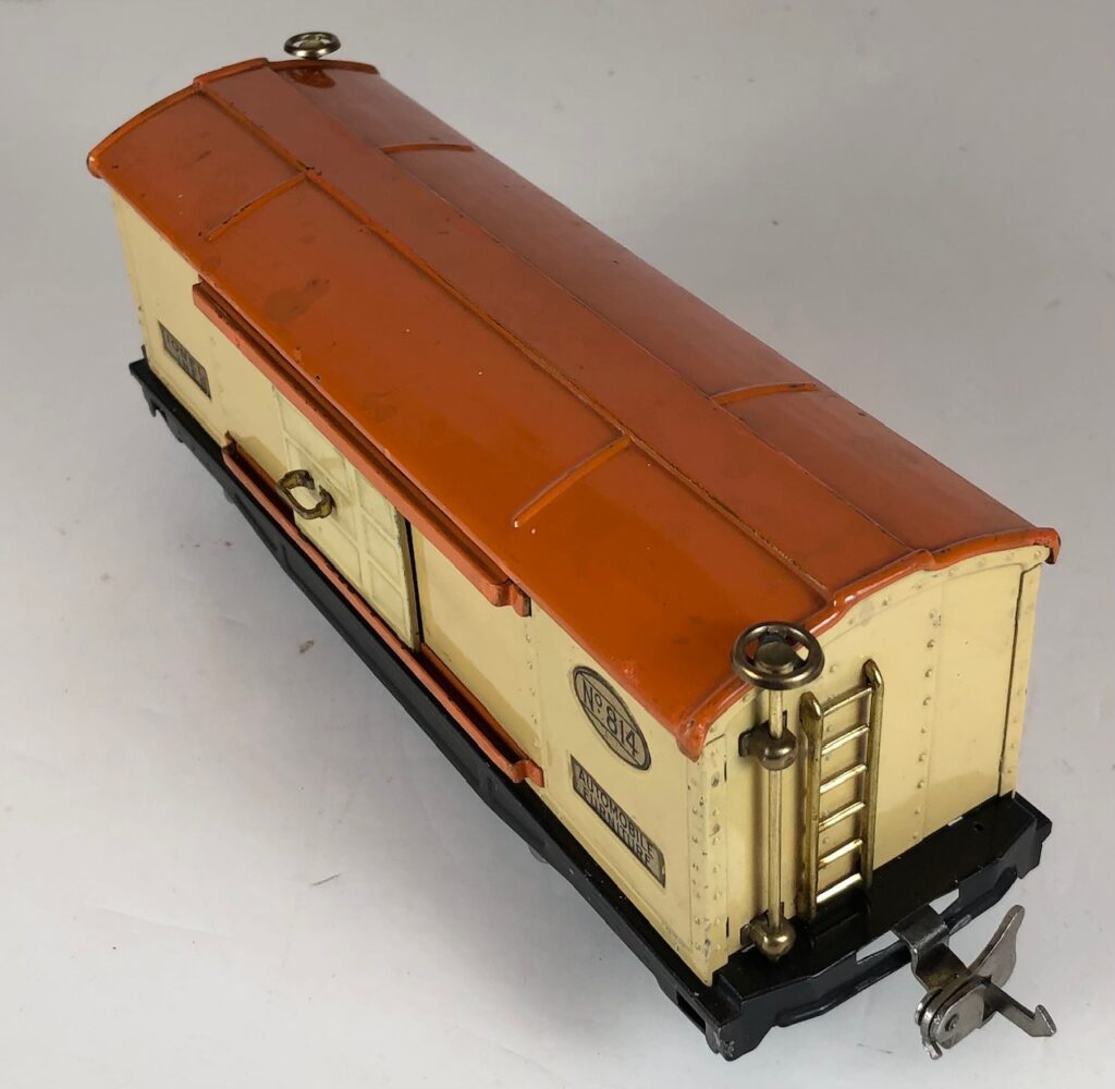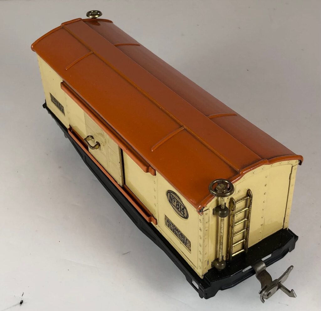 2. No. 814 Box Car in cream with orange roof (1926). The cars have brass plates, large door handles, brass trim and nickel journals. The cars have latch couplers.