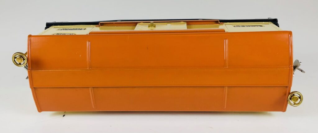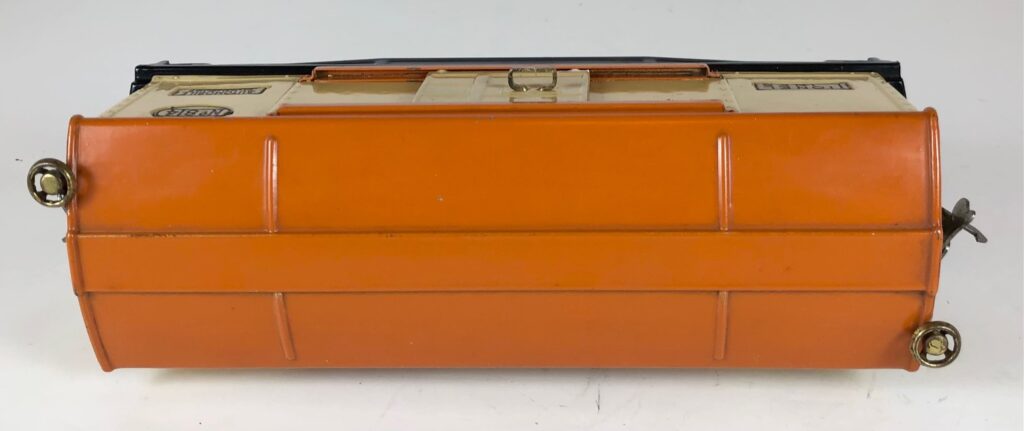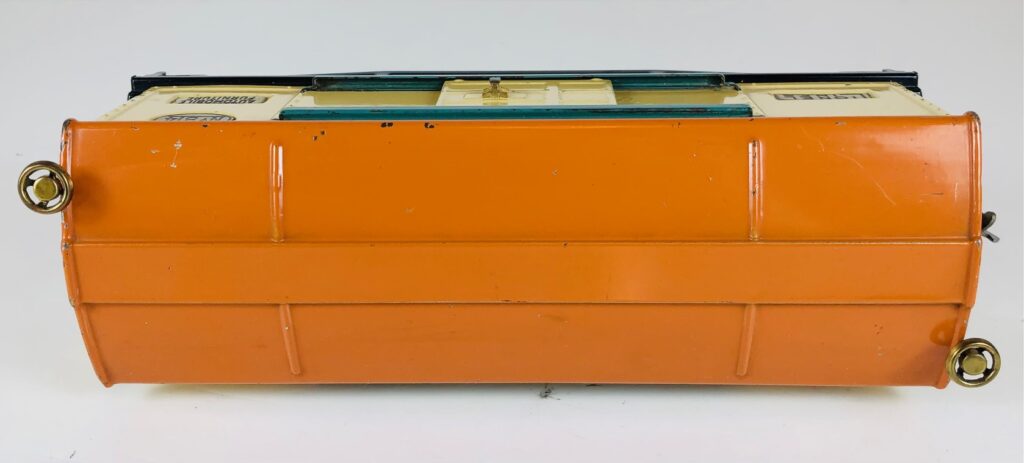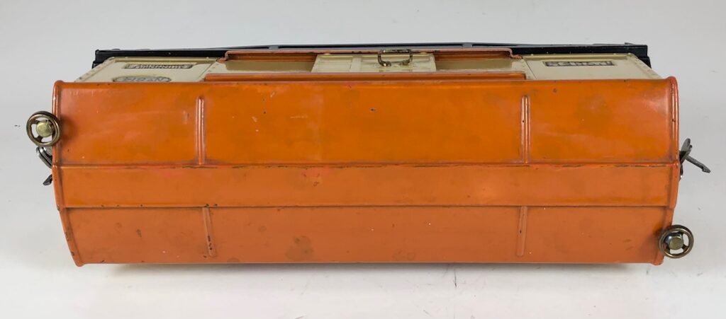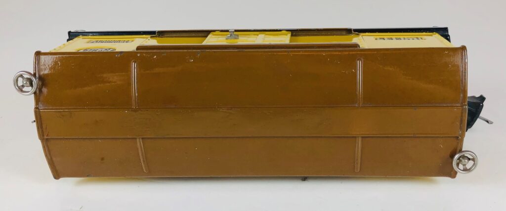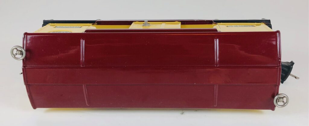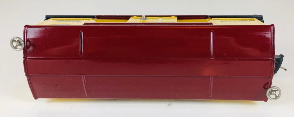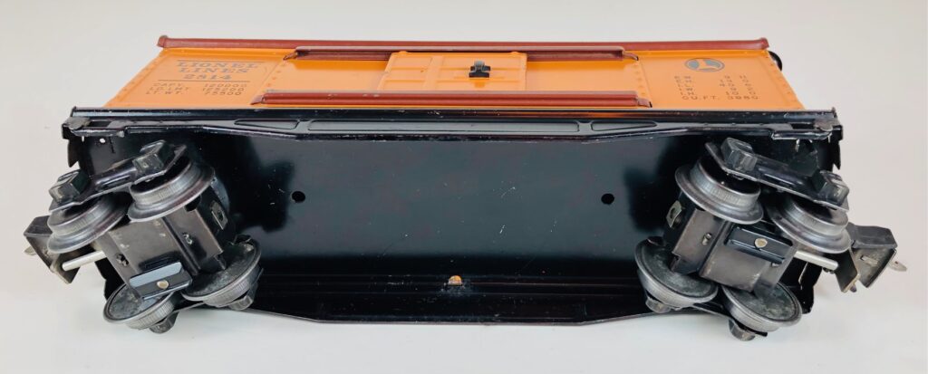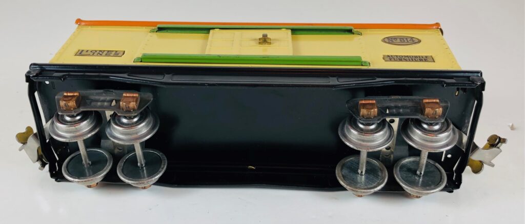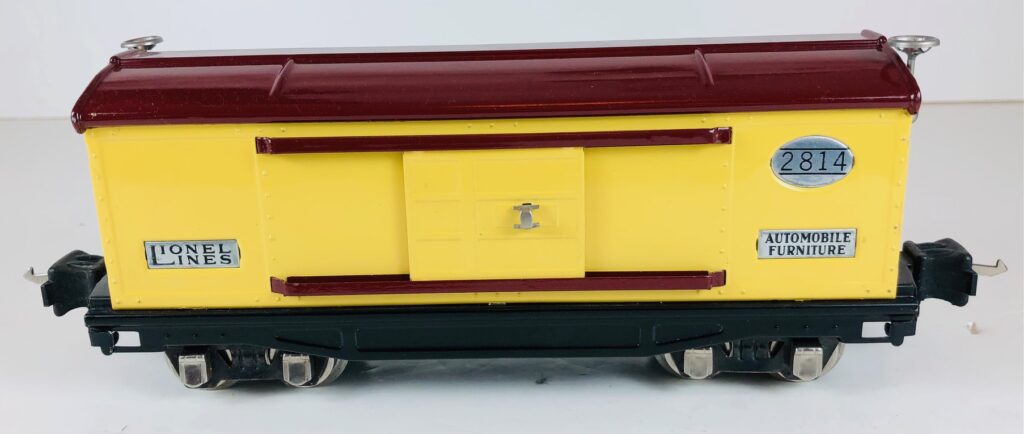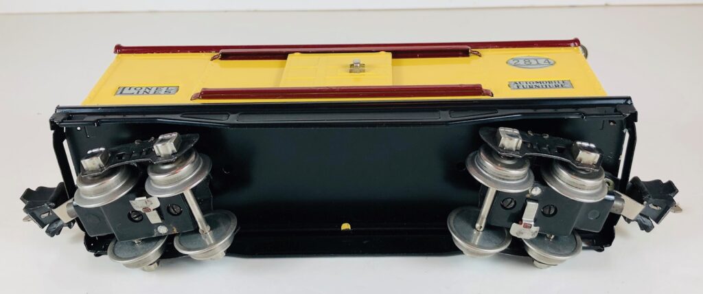 The Lionel No. 2814 Box Cars were introduced in 1938 and were issued through 1942. The No. 2814 Box Cars always had operating couplers. The No. 2814 Box Cars measure 9-inches in length. The box cars had contrasting colors for the body and roof. The frame was always black. The cars had sliding doors that opened. The doors always matched the car body color and have a handle in the center. The door guides always matched the roof color. Early box cars have metal plates to identify the number, “Automobile Furniture”, and “Lionel Lines”. Late box cars have rubber stamped lettering.