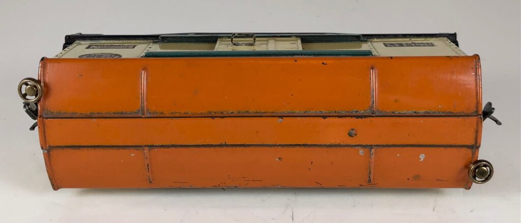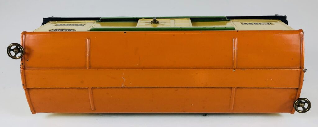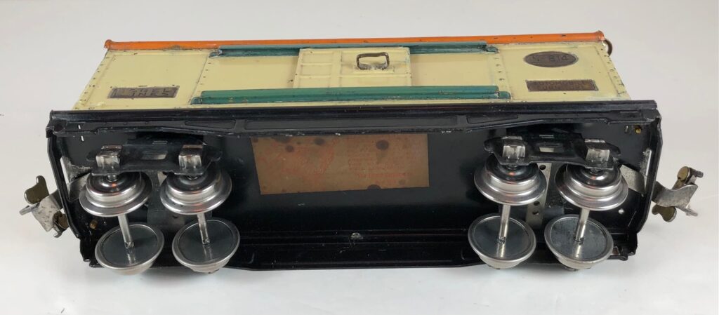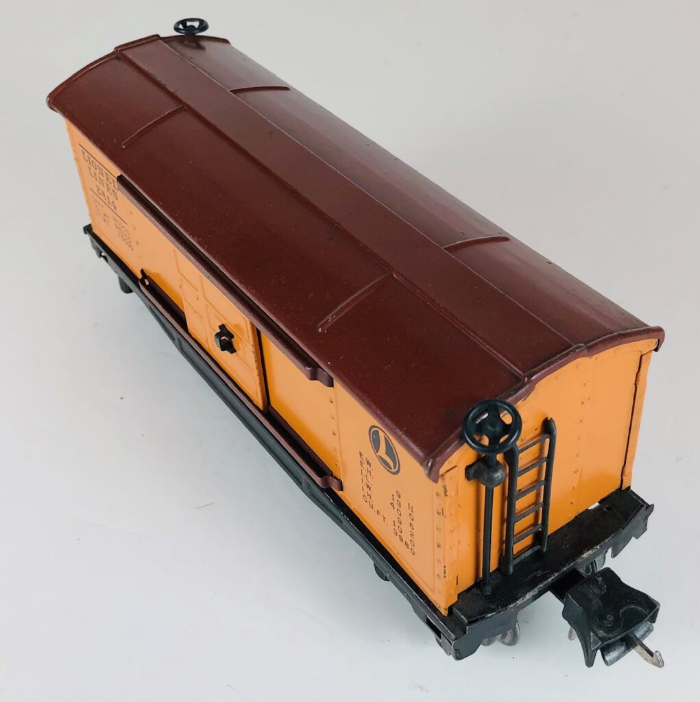 7. No. 814 Box Car in cream with orange roof and pea green door guides (1934). The cars have brass plates, brass trim and copper journals. The cars have latch couplers.