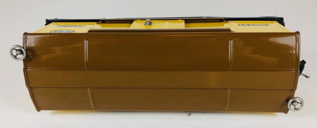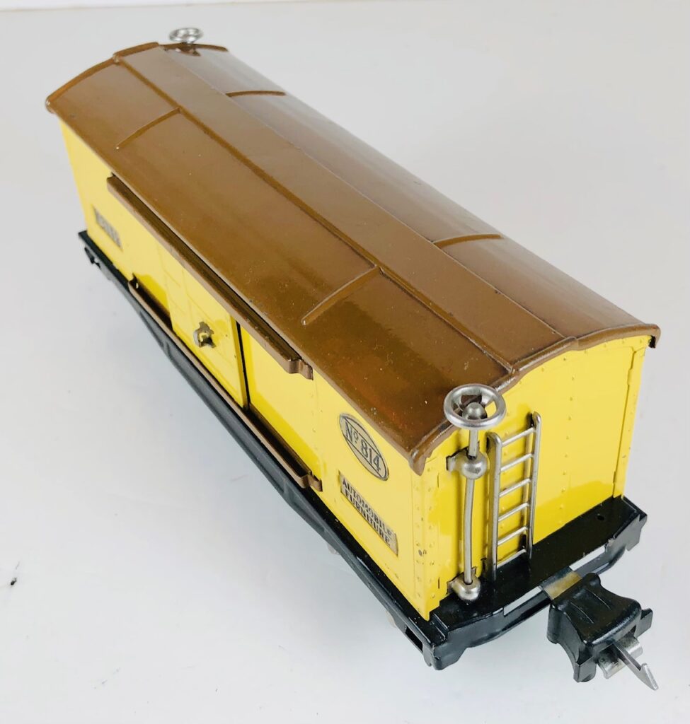9. No. 814 Box Car in yellow with brown roof (1938-1939). The cars have nickel plates, nickel trim and nickel journals. The cars have early style manual box couplers.