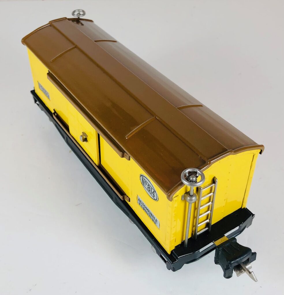 8. No. 814 Box Car in yellow with brown roof (1935-1938). The cars have brass plates, nickel trim and nickel journals. The cars have early style manual box couplers.