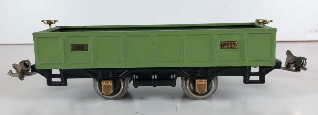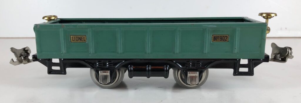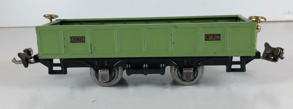 The Lionel No. 902 Gondola Cars were introduced in 1927 and were issued through 1934. The No. 902 Gondola Cars have a four-wheel frame. The No. 902 Gondola Cars measure 6 1/2-inches in length. The gondola car bodies were always painted a single color and had a black frame. The gondola cars all have brass trim and brass identification plates with the number and “Lionel Lines”. The gondola cars all have latch couplers.