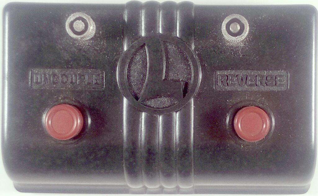 The Type R Peerless Battery Motor was made from 1915-1920 by the Lionel Manufacturing Co. This at first was powered by a dry cell battery and then by a toy transformer as electricity became more available. This has a red fiberboard reversing switch for two direction operation. It also was capable of two speed operation through the different gearing. One end of the axle has a belt drive spool and the other end has a 2″ brass gear.