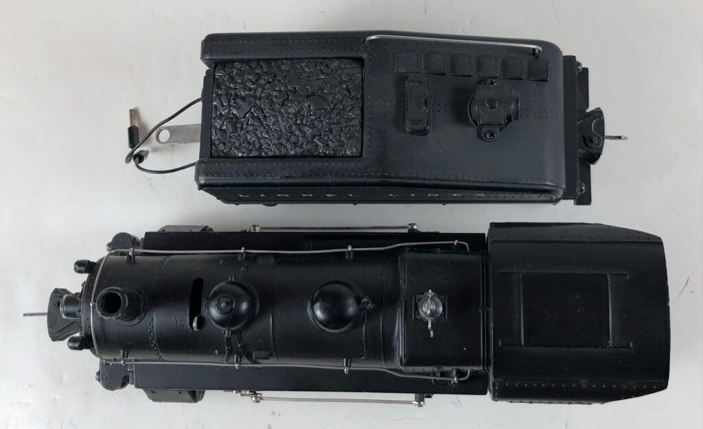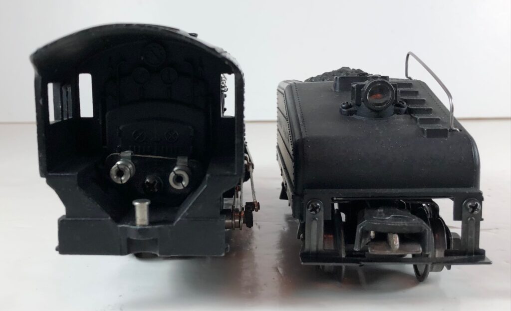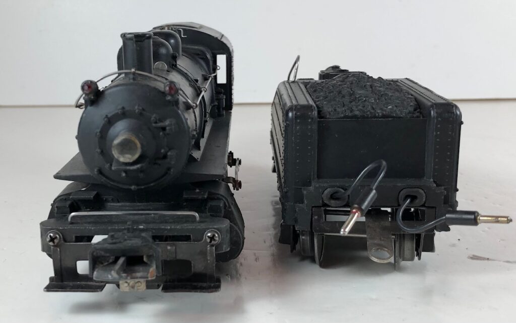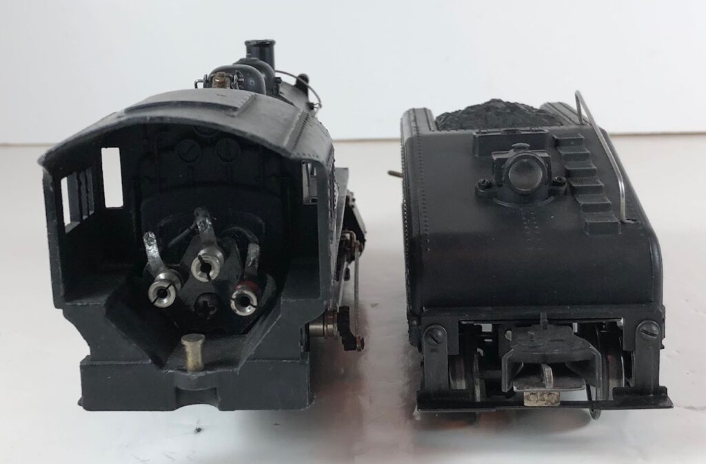 The No. 1662 Steam Switcher has a diecast body with marker lights, steel handrails, decorative bell, and molded in boiler details. The engine has an operating headlight and operating front coupler. The engine number is rubber stamped on the sides of the cab under the windows. The tender has an operating back-up light that is always on. The tender did not come with a bell. The tender shell is diecast and has a steel handrail, molded details, and a simulated coal pile. The tender has two leads that plug in to the rear of the cab to provide power to the engine front coupler and for the tender light. The engine and tender have late style operating box couplers, black journals and a conventional E-Unit reversing unit. The locomotive was not equipped with “Magic Electrol”. The absence of “Magic Electrol” is the only difference between the No. 1662 and the No. 1663 Locomotives.
