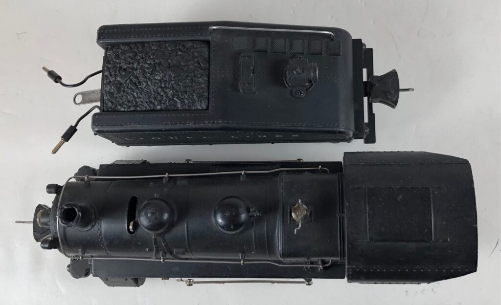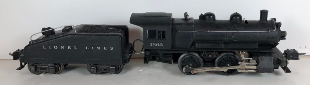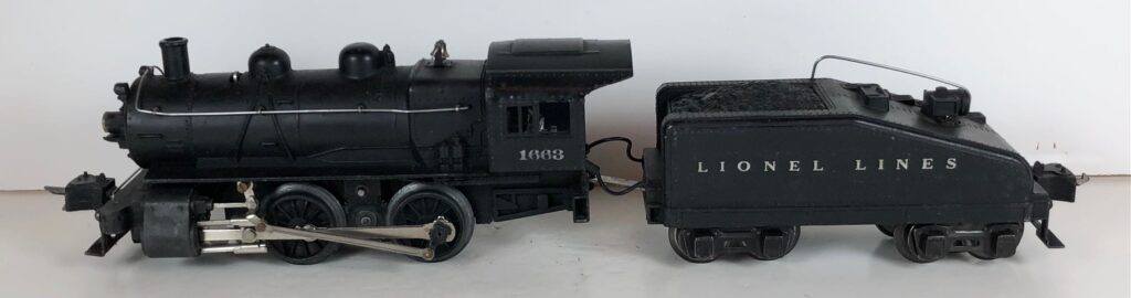 sets during this period. It was not available for separate sale and was not used in uncataloged sets. The No. 1663 0-4-0 Steam Engine was always paired with a No. 2201T Lionel Lines Slope Back Tender. The No. 1663 / 2201T Steam Switcher engine and tender combined measure 16-inches in total length.