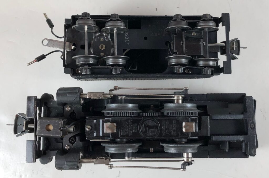 The No. 1663 Steam Switcher has a diecast body with marker lights, steel handrails, decorative bell, and molded in boiler details. The engine has an operating headlight and operating front coupler. The engine number is rubber stamped on the sides of the cab under the windows. The tender has an operating back-up light that is always on. The tender did not come with a bell. The tender shell is diecast and has a steel handrail, molded details, and a simulated coal pile. The tender has three leads that plug in to the rear of the cab to provide power to the engine front coupler, the tender light and the locomotive E-Unit. The engine and tender have late style operating box couplers, black journals and “Magic Electrol” which allows the locomotive to be operated independently from another train running on the same track by use of a No. 168 Controller. The presence of “Magic Electrol” is the only difference between the No. 1662 and the No. 1663 Locomotives.