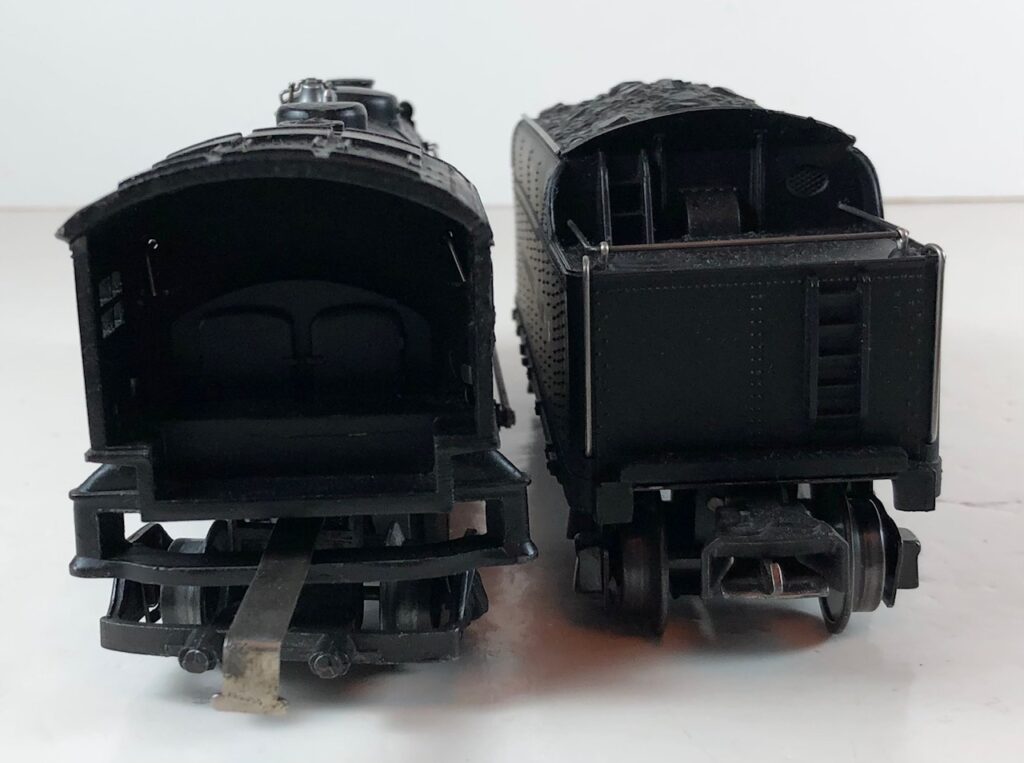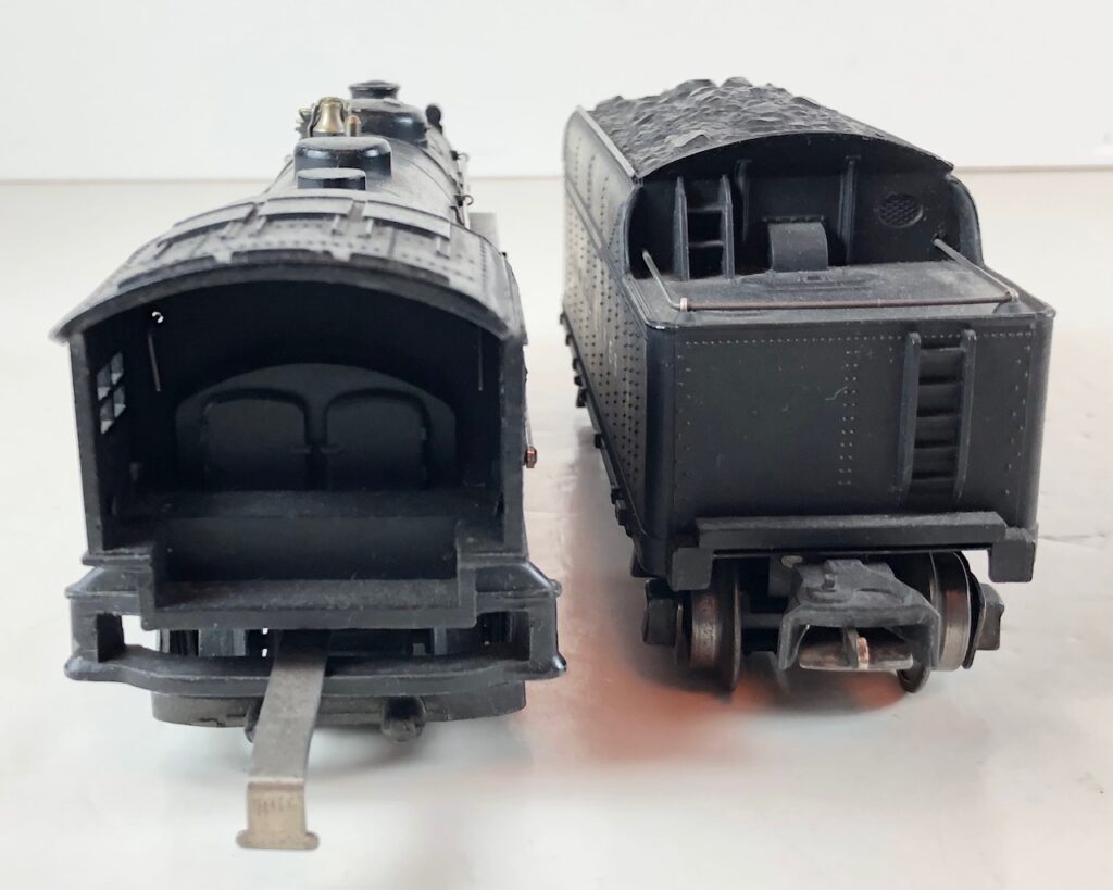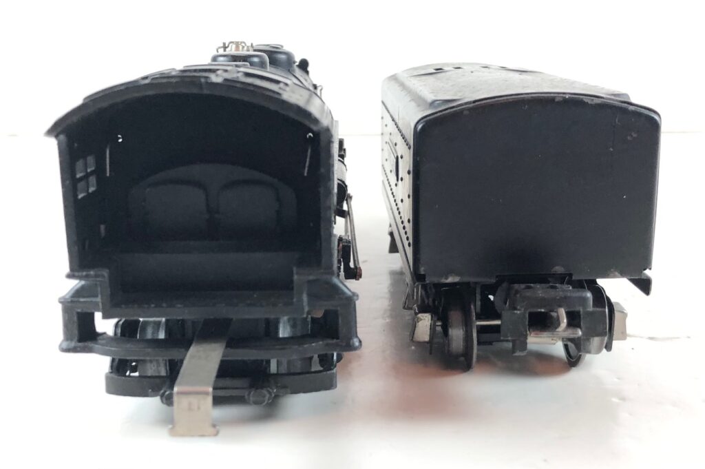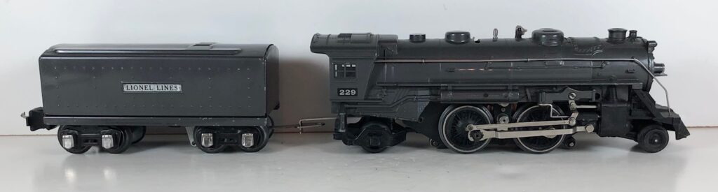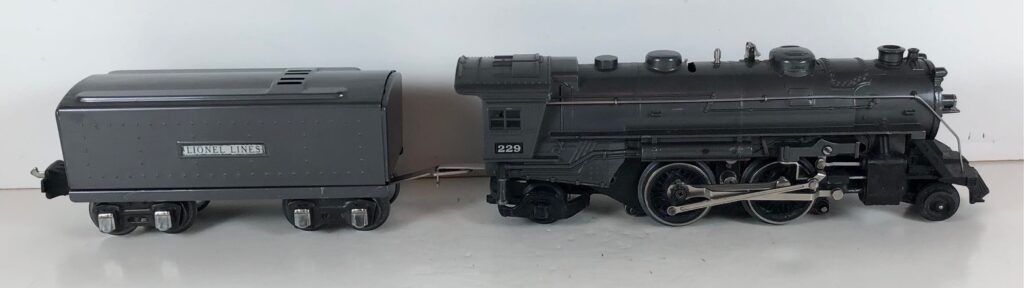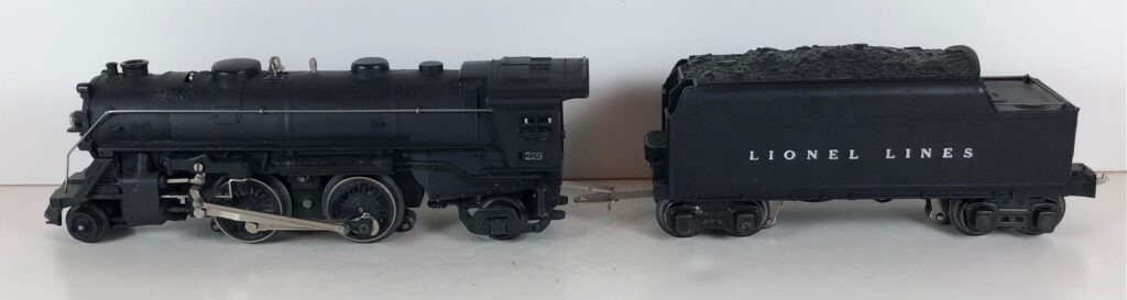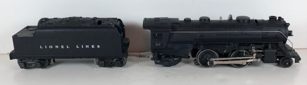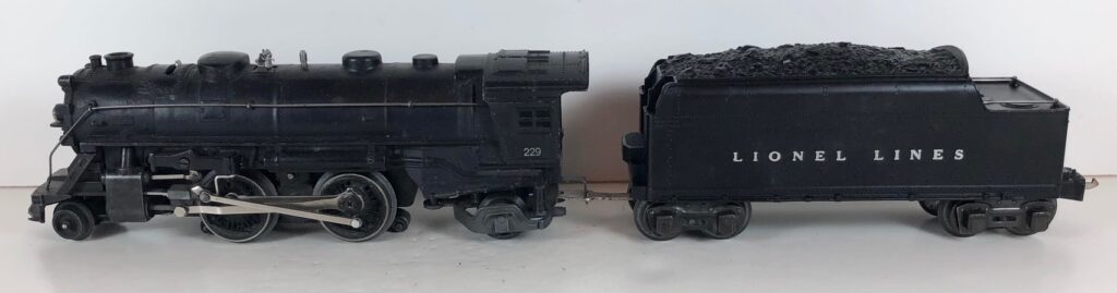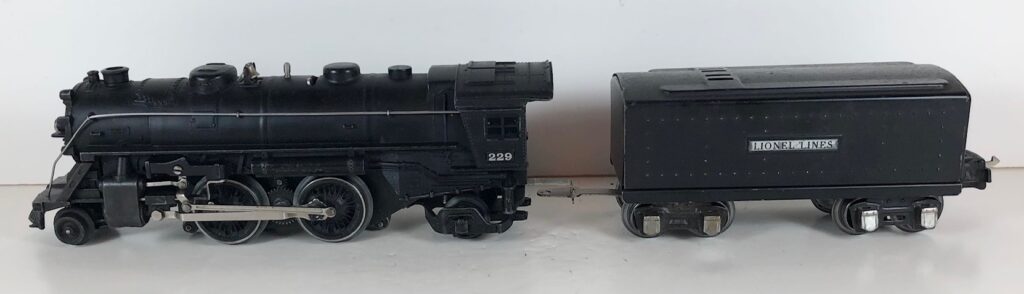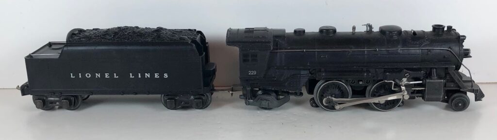 5. No. 229 / 2666T 2-4-2 Steam Locomotive in black with nickel trim and rubber-stamped number “229” on the sides of the cab with no slots (1941-1942). The E-Unit lever is located to the front of the boiler. The No. 2666T Tender is black with “Lionel Lines” on the sides of the tender. The tender has black journals and a late style operating box coupler.