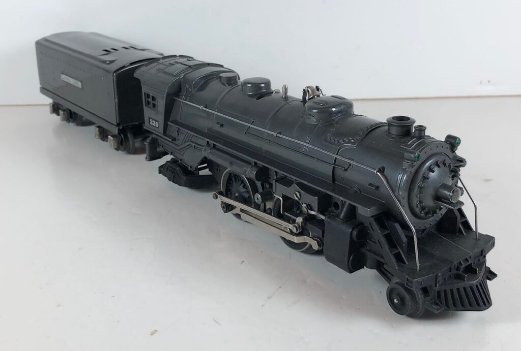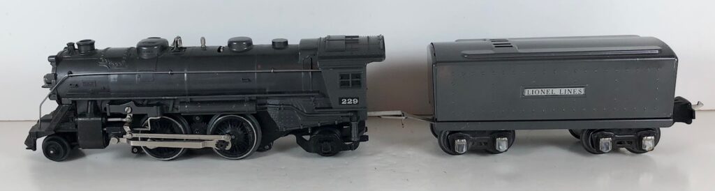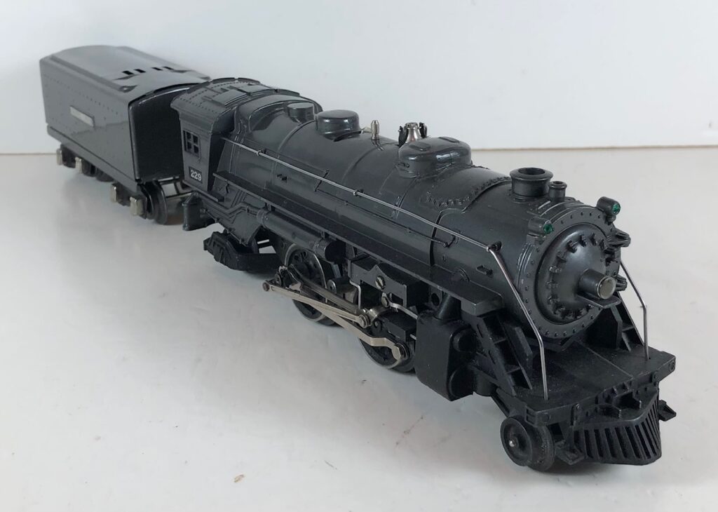 1. No. 229 / 2689W 2-4-2 Steam Locomotive in gunmetal gray with nickel trim and aluminum “229” number plates on the sides of the cab (1939-1940). The E-Unit lever is located in the middle of the boiler. The No. 2689W Tender is gunmetal gray with nickel plates on the sides of the tender. The tender has nickel journals and an early style operating box coupler.