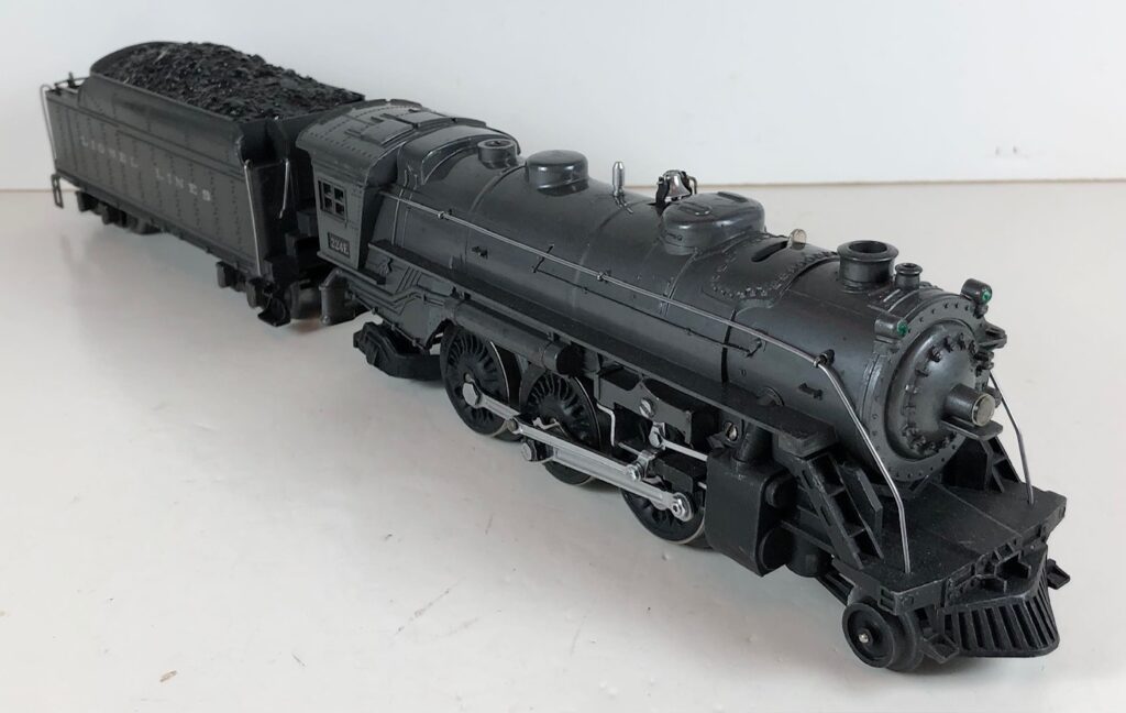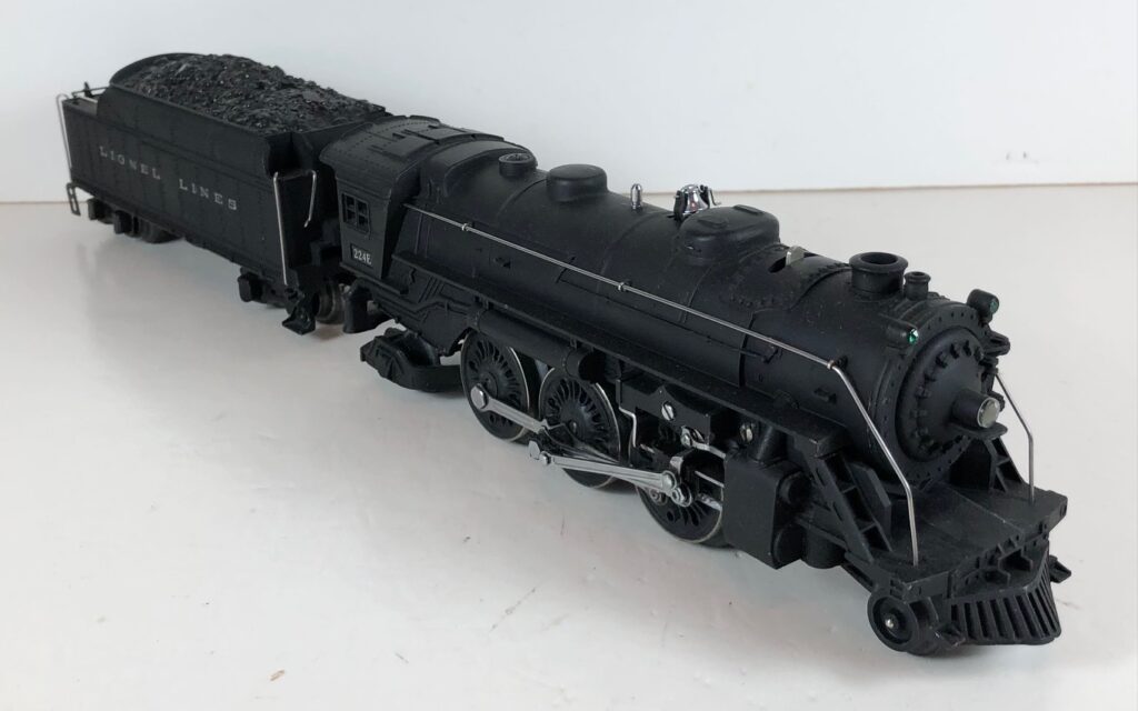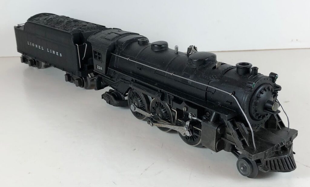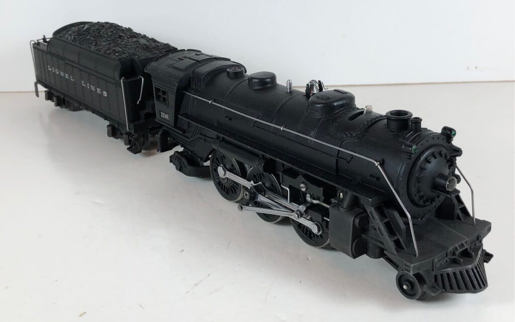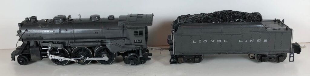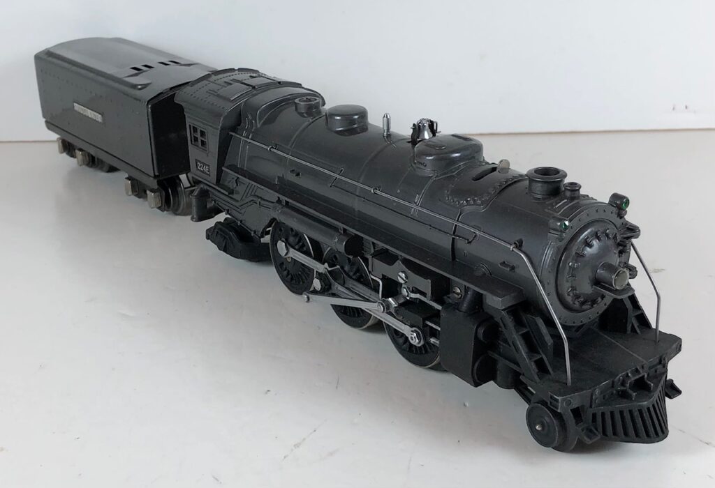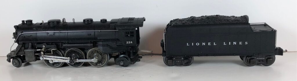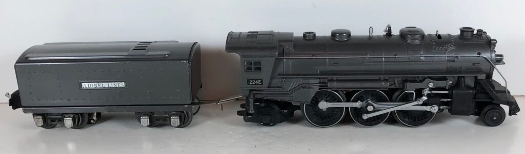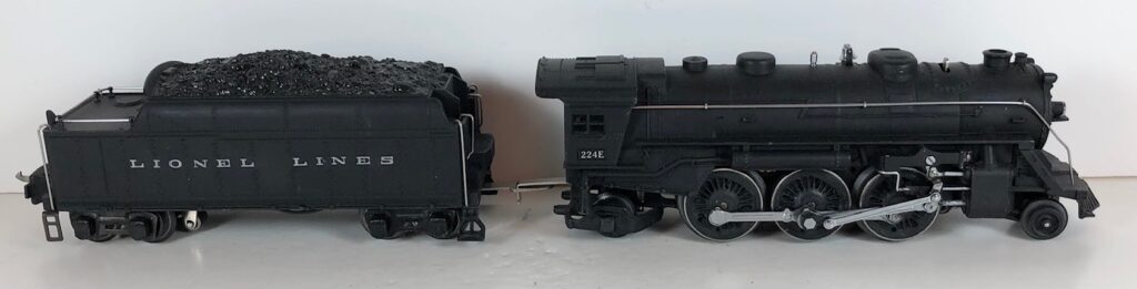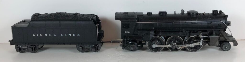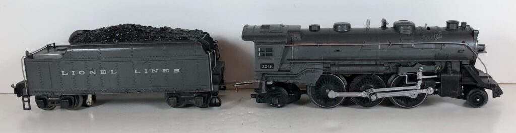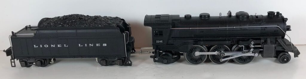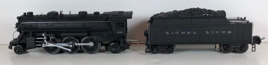 3. No. 224E / 2224W 2-6-2 Steam Locomotive in black with nickel trim and aluminum “224E” number plates on the sides of the cab (1940-1941). The No. 2224W Tender is black with “Lionel Lines” stamped on the sides of the tender. The tender has black journals and an early style operating box coupler.