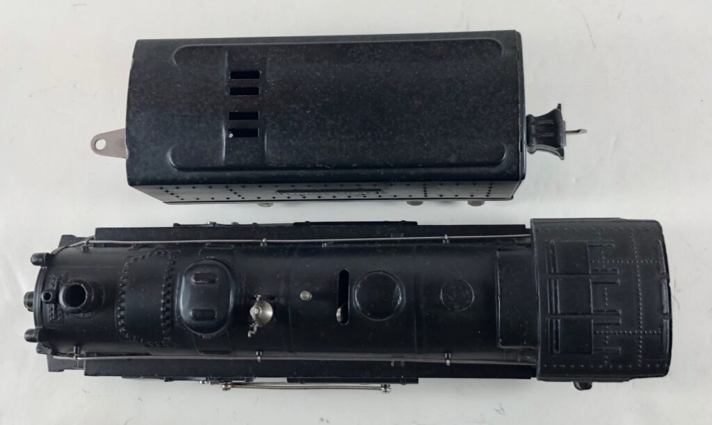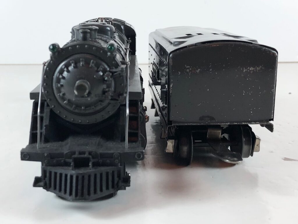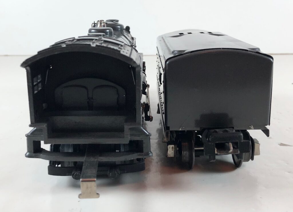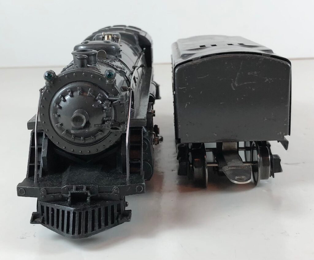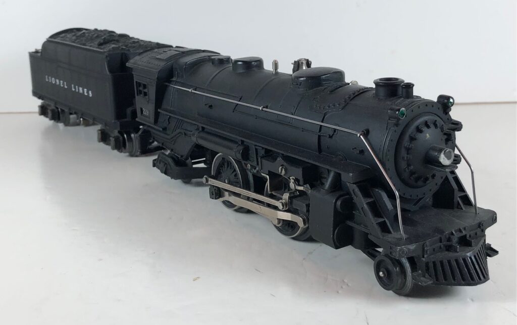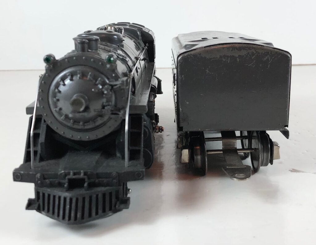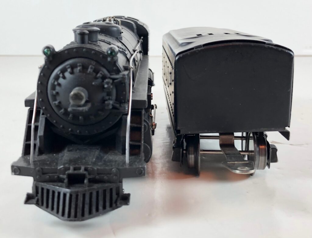 3. No. 224E / 2224W 2-6-2 Steam Locomotive in black with nickel trim and aluminum “224E” number plates on the sides of the cab (1940-1941). The No. 2224W Tender is black with “Lionel Lines” stamped on the sides of the tender. The tender has black journals and an early style operating box coupler.