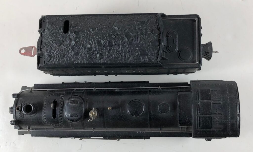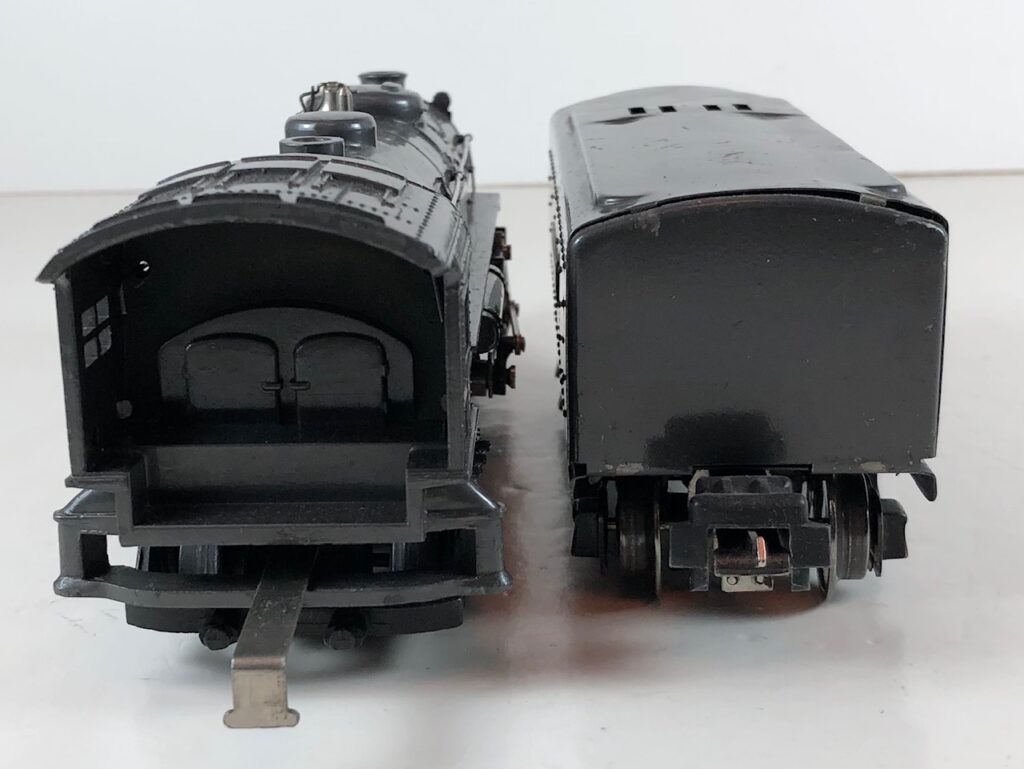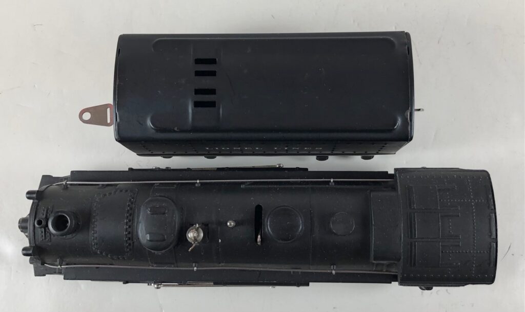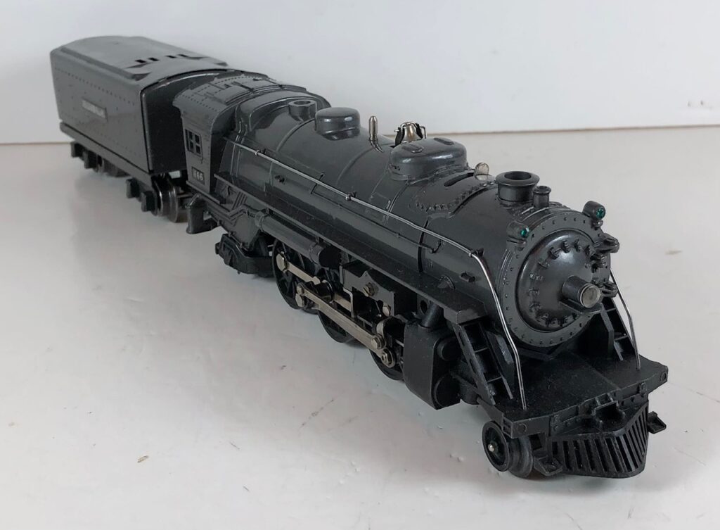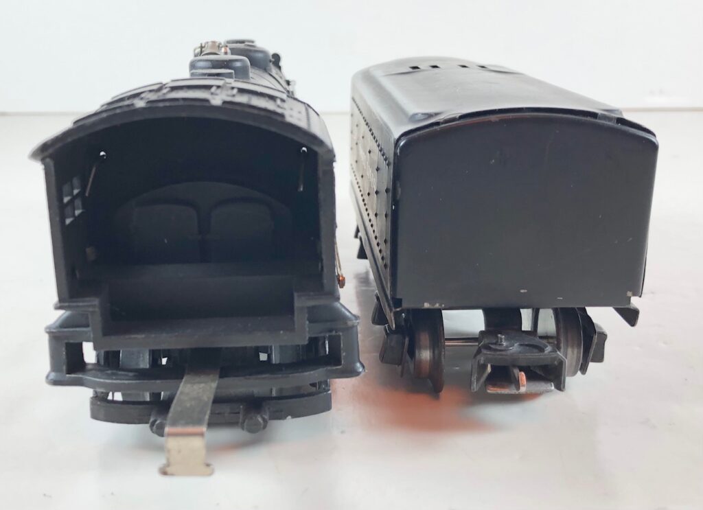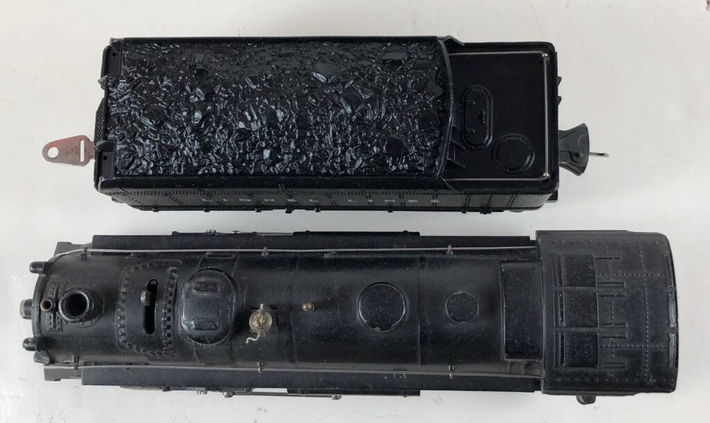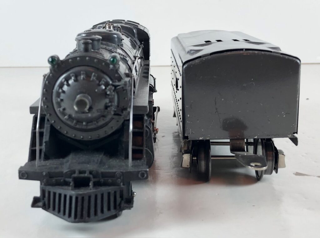 3. No. 224E / 2224W 2-6-2 Steam Locomotive in black with nickel trim and aluminum “224E” number plates on the sides of the cab (1940-1941). The No. 2224W Tender is black with “Lionel Lines” stamped on the sides of the tender. The tender has black journals and an early style operating box coupler.