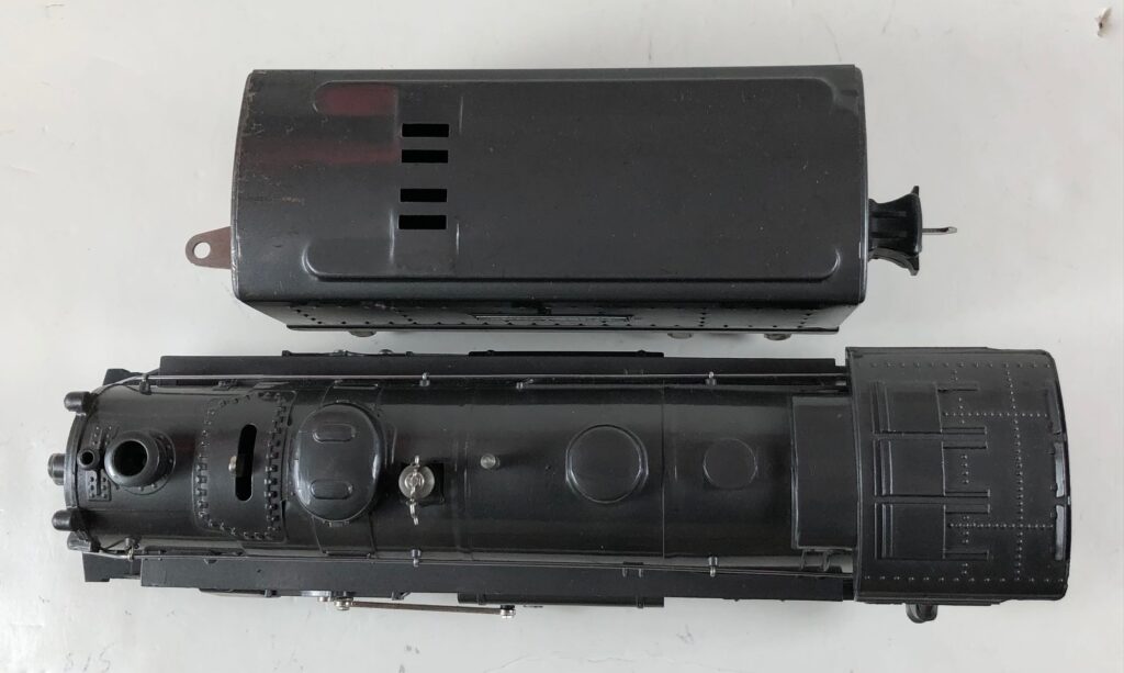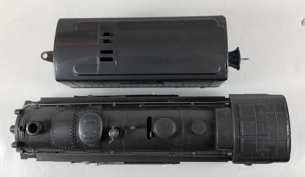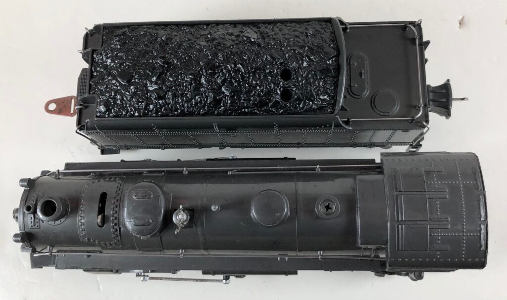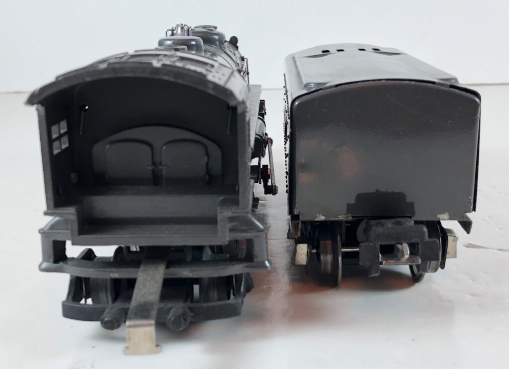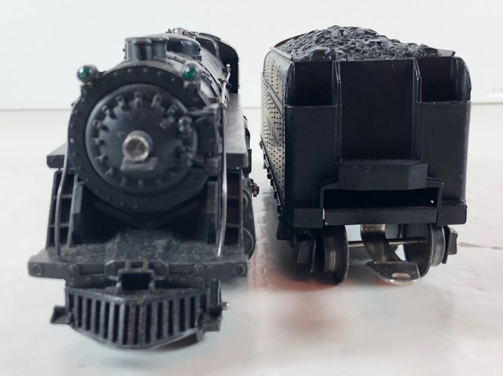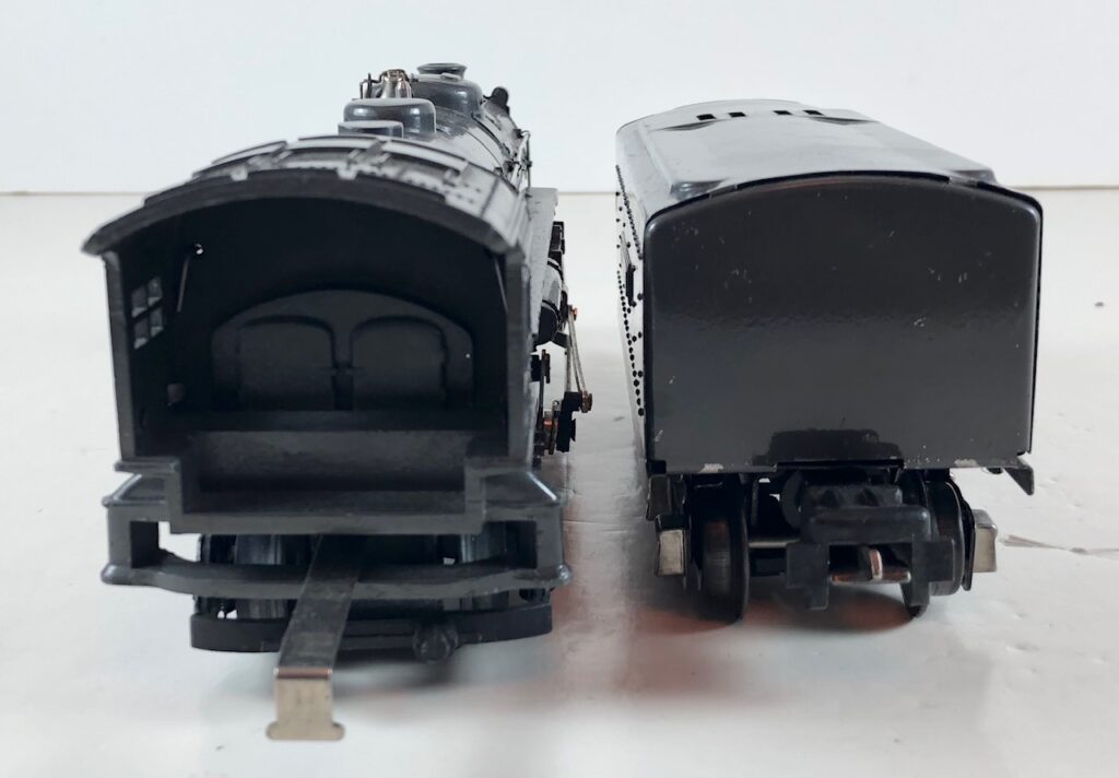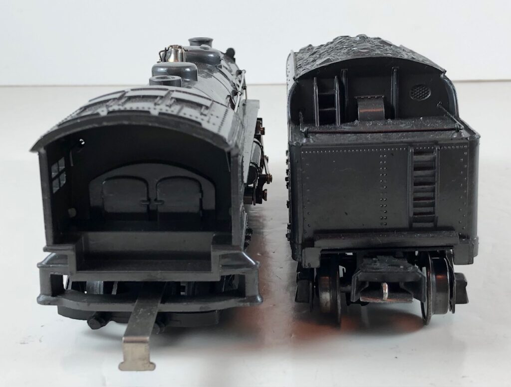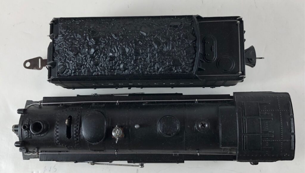 3. No. 224E / 2224W 2-6-2 Steam Locomotive in black with nickel trim and aluminum “224E” number plates on the sides of the cab (1940-1941). The No. 2224W Tender is black with “Lionel Lines” stamped on the sides of the tender. The tender has black journals and an early style operating box coupler.