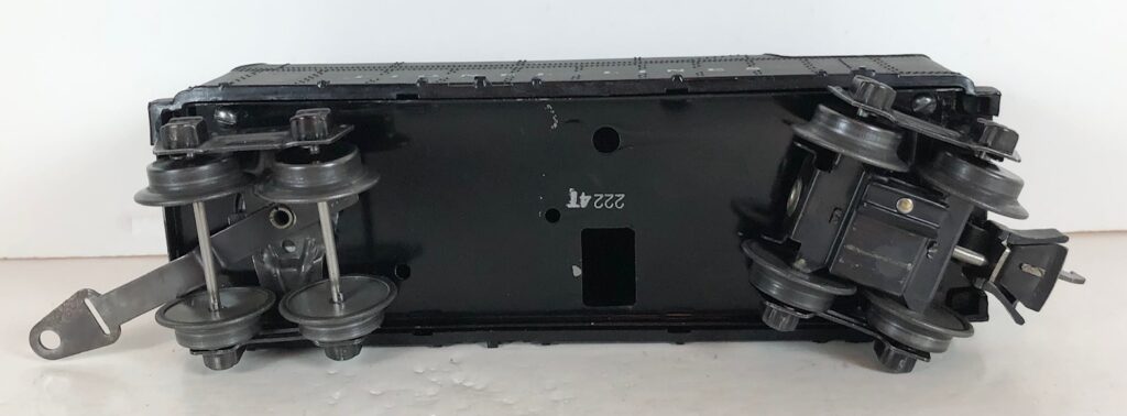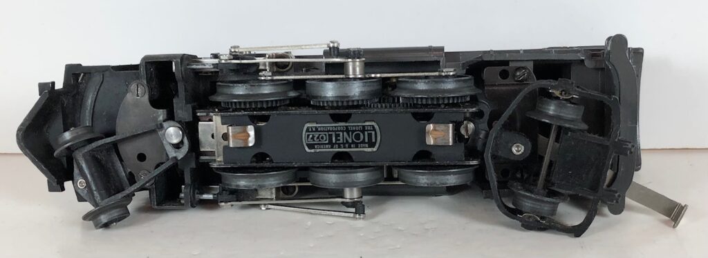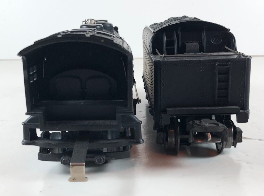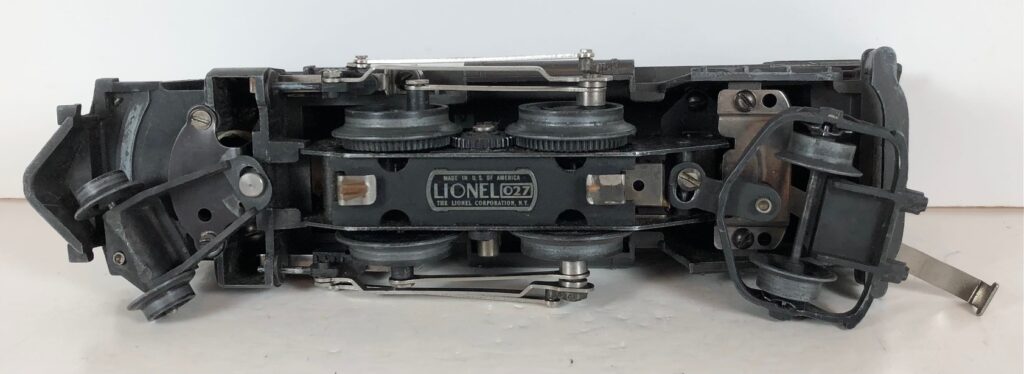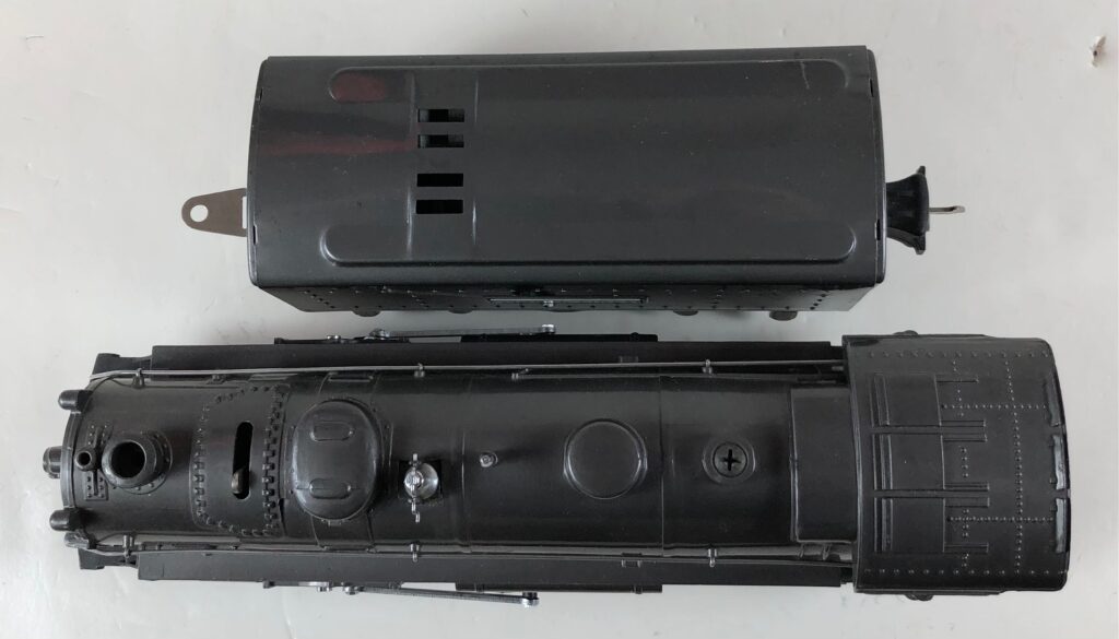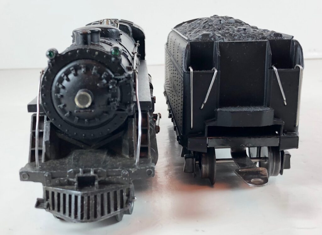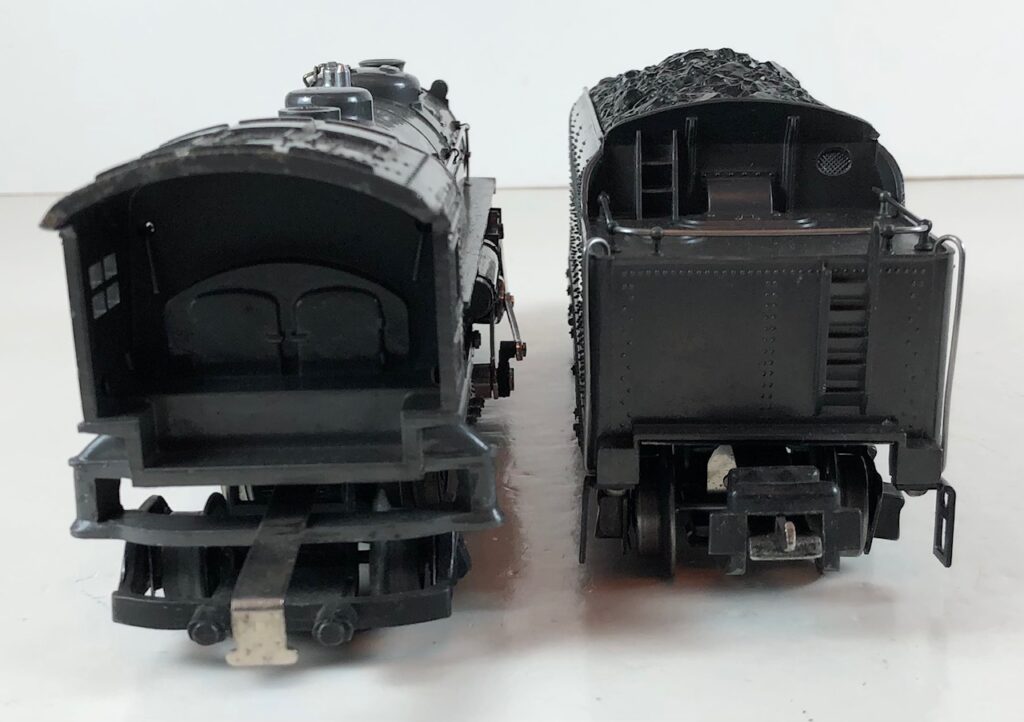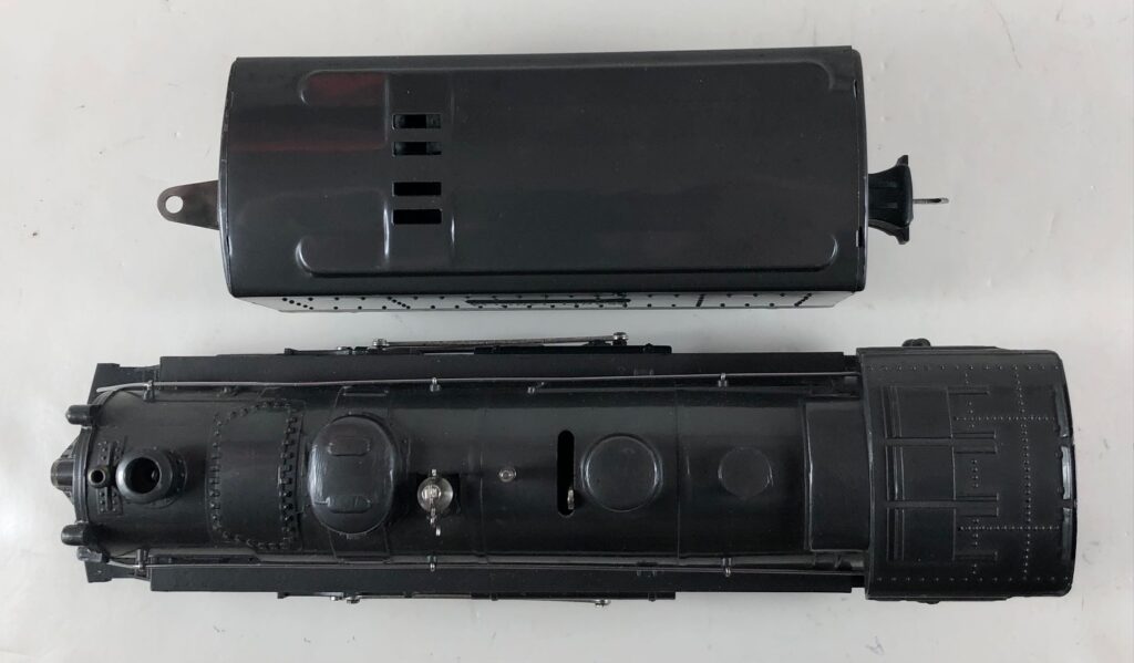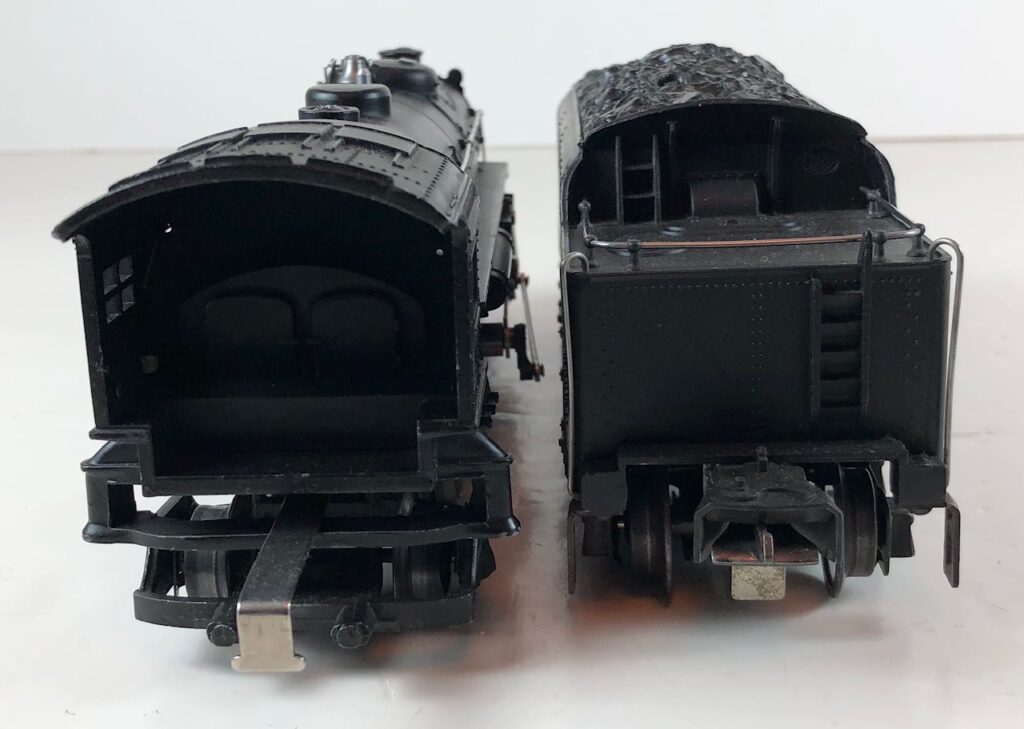 3. No. 224E / 2224W 2-6-2 Steam Locomotive in black with nickel trim and aluminum “224E” number plates on the sides of the cab (1940-1941). The No. 2224W Tender is black with “Lionel Lines” stamped on the sides of the tender. The tender has black journals and an early style operating box coupler.