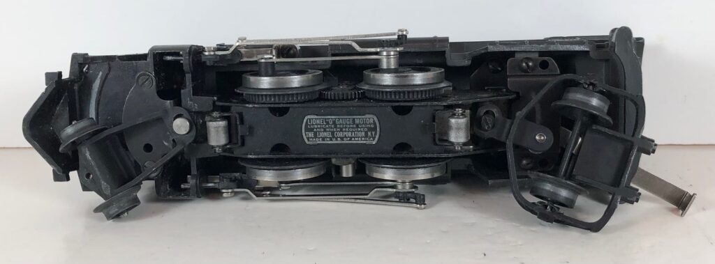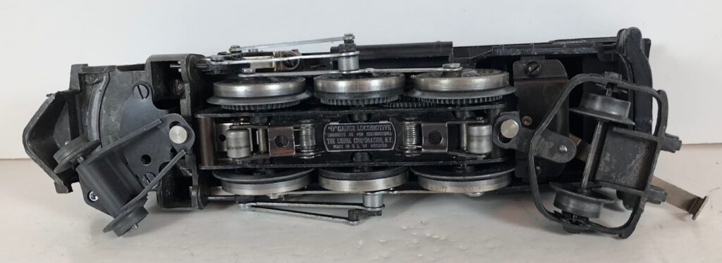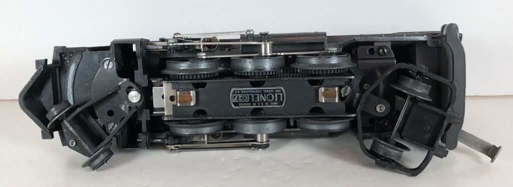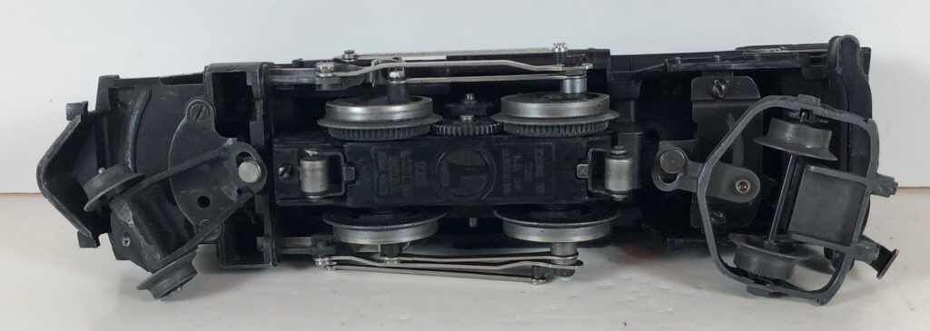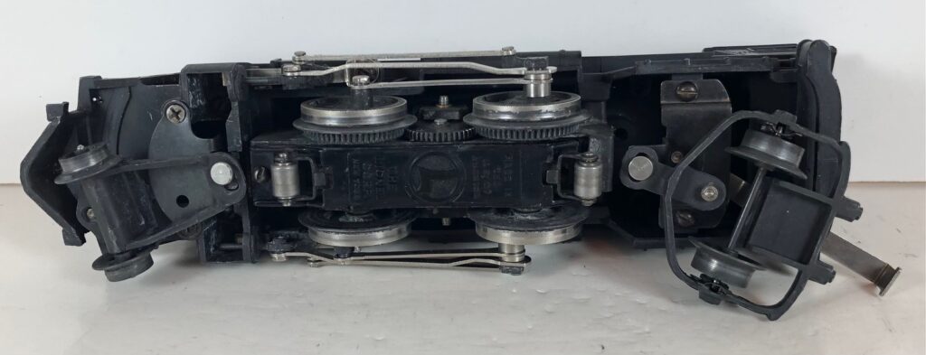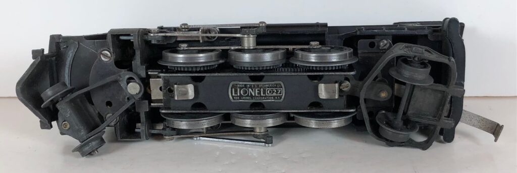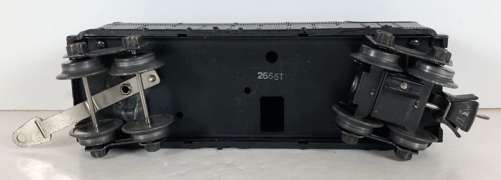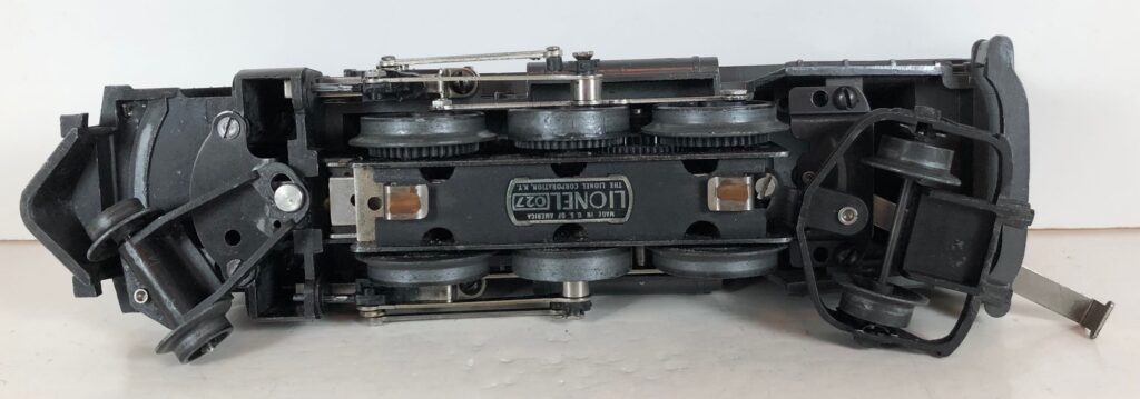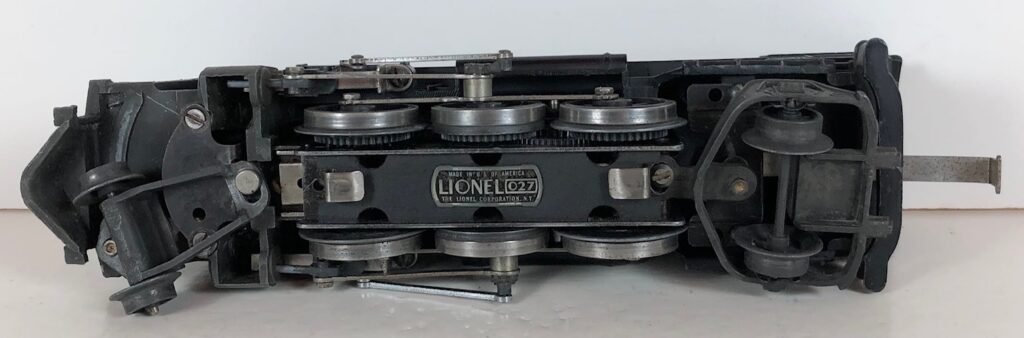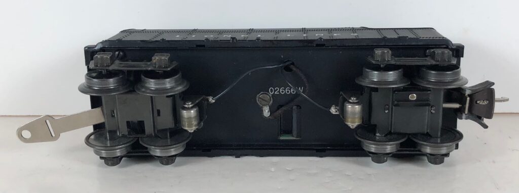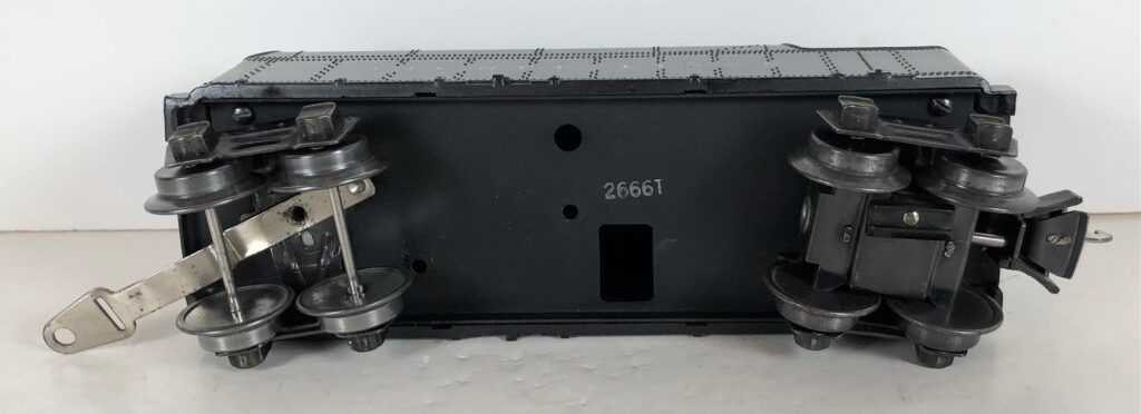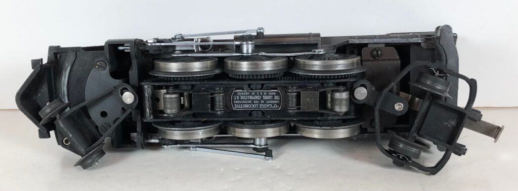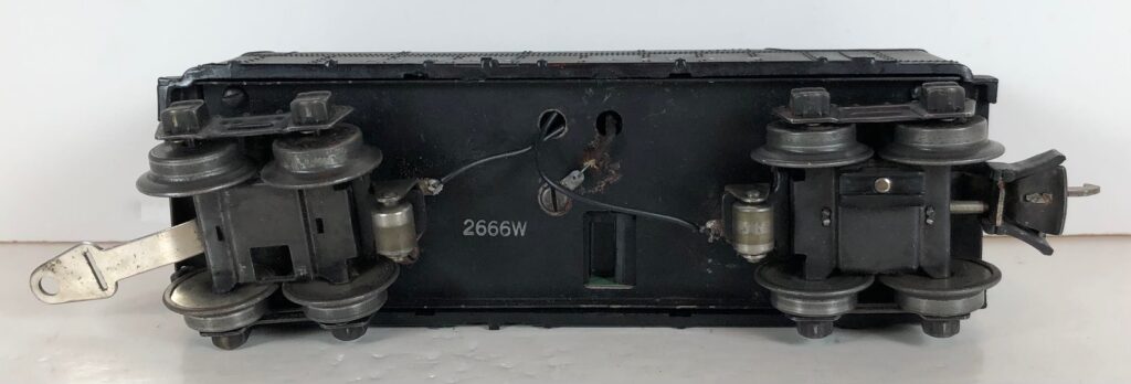 The No. 1666 Locomotive has nickel trim, wire handrails and a “027” Gauge six drive wheel motor. The locomotive has an operating headlight and a remotely operated reverse with a lever on the top of the boiler that engages or disengages the reversing unit. The number is on an aluminum plate or rubber stamped below the cab windows. Some No. 1666 Locomotives used the body of a No. 224 Locomotive that had a screw hole on the top just in front of the cab roof. Due to the different motor mounting configuration of the No. 1666 Locomotive, this screw hole was not used.