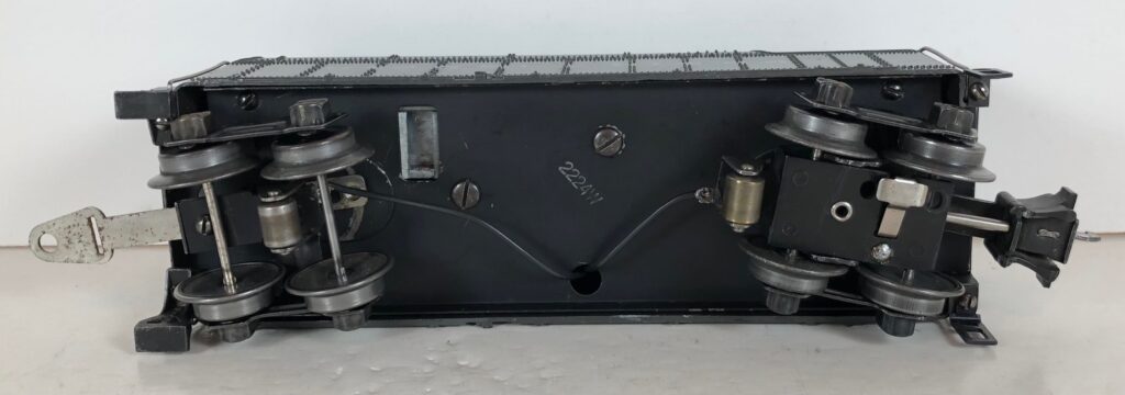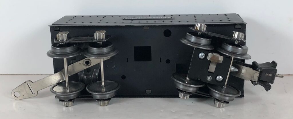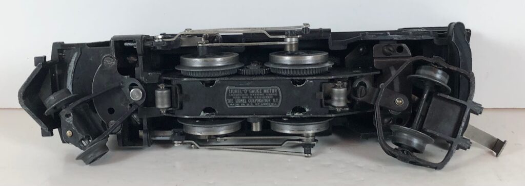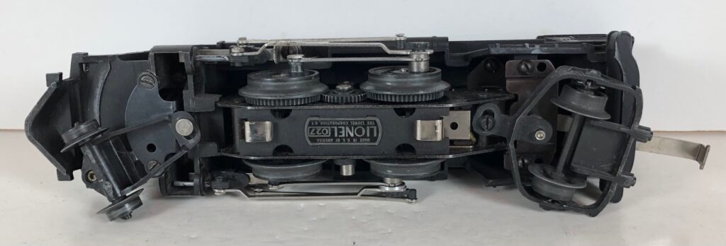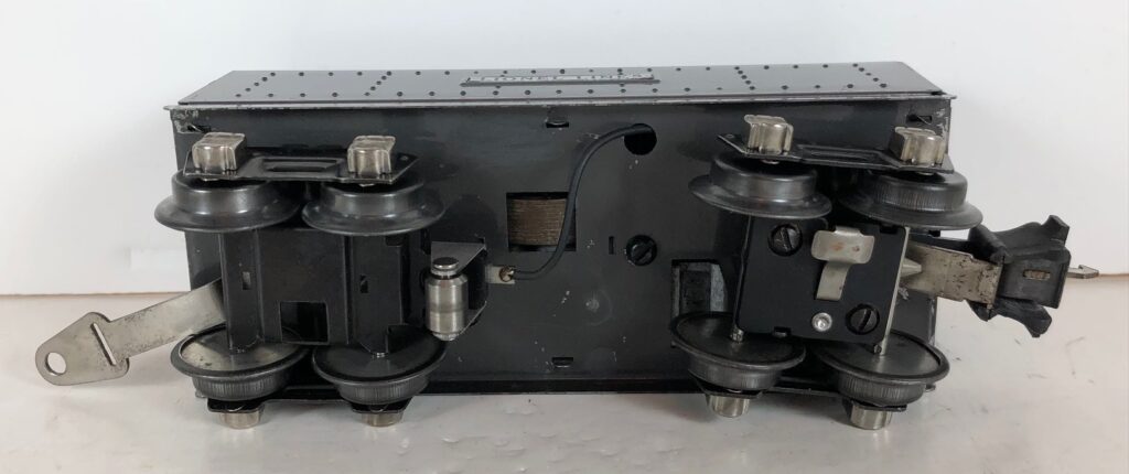 The No. 229 Locomotive has nickel trim, wire handrails and an “O” Gauge four drive wheel motor with Baldwin Disc wheels. The locomotive has an operating headlight and a remotely operated reverse with a lever on the top of the boiler that engages or disengages the reversing unit. Early No. 229 Locomotives have the E-Unit lever located in the middle of the boiler. Late locomotives have the E-Unit lever located in the front of the boiler. The number is either on an aluminum plate or rubber-stamped below the cab windows.