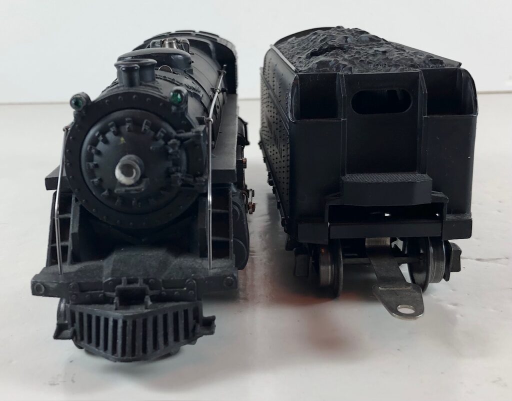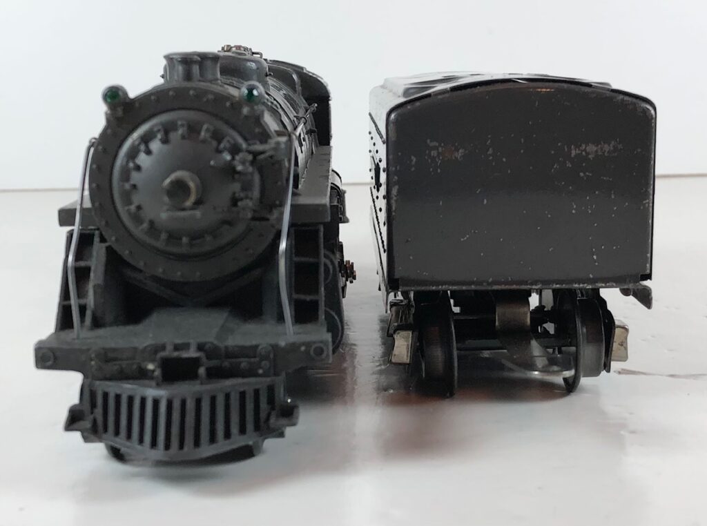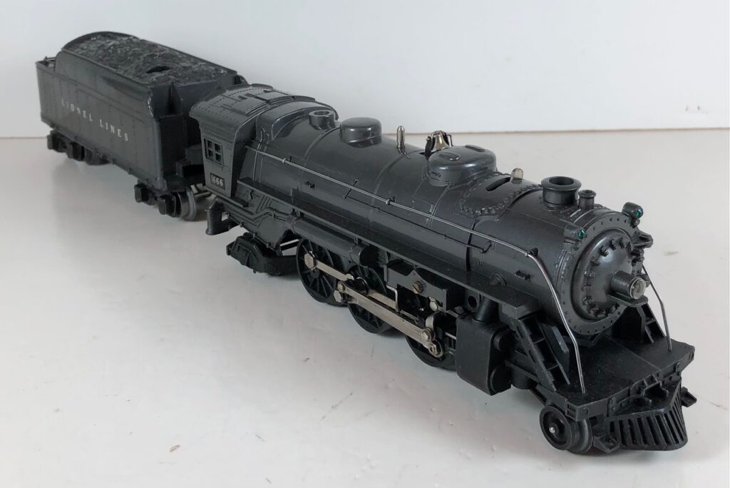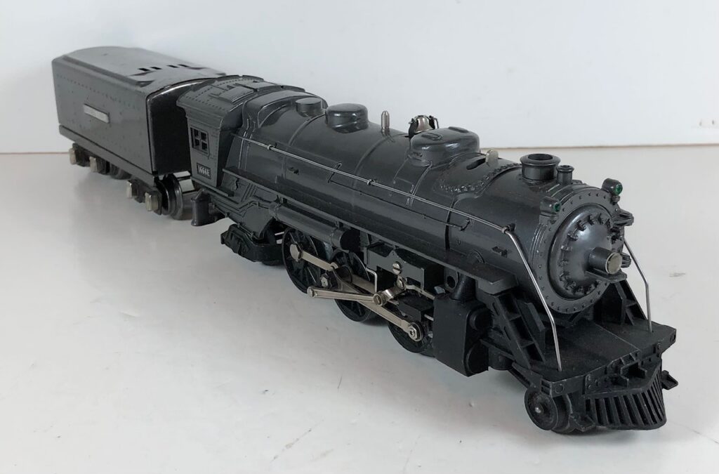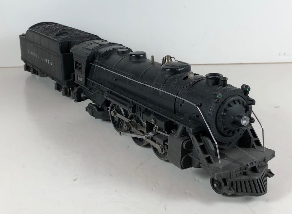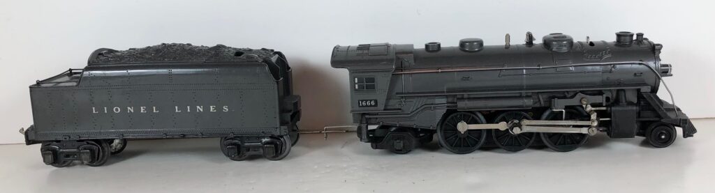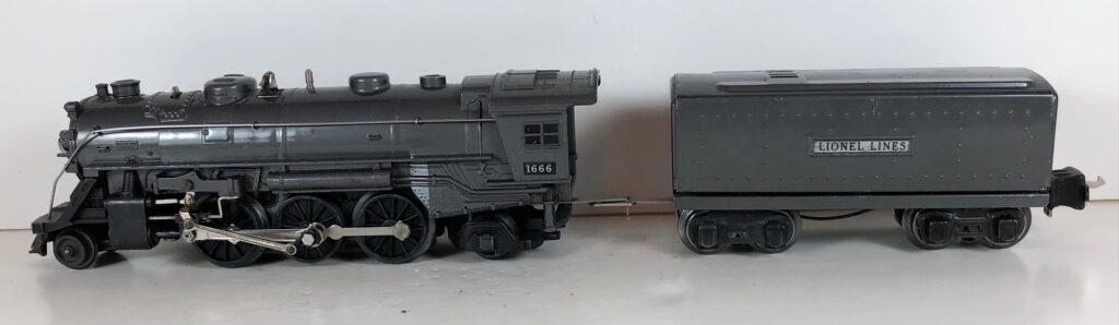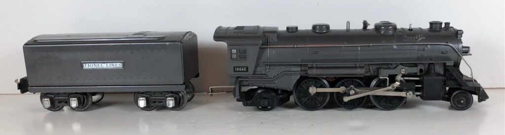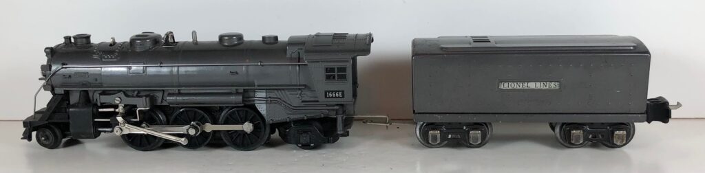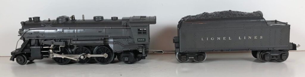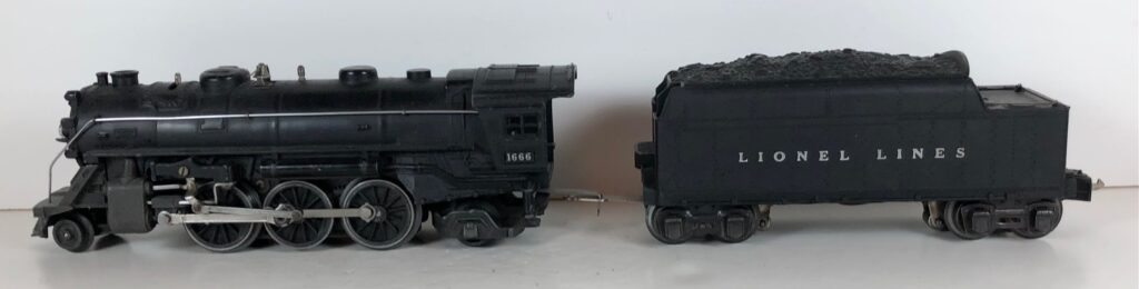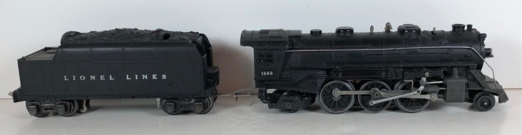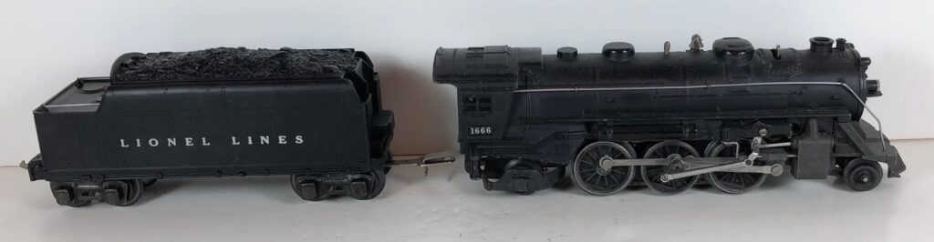 5. No. 1666 / 2666T 2-6-2 Steam Locomotive in black with nickel trim and aluminum “1666” number plates on the sides of the cab (1940-1941). The No. 2666T Tender is black with “Lionel Lines” stamped on the sides of the tender. The tender has black journals and a late style operating box coupler.