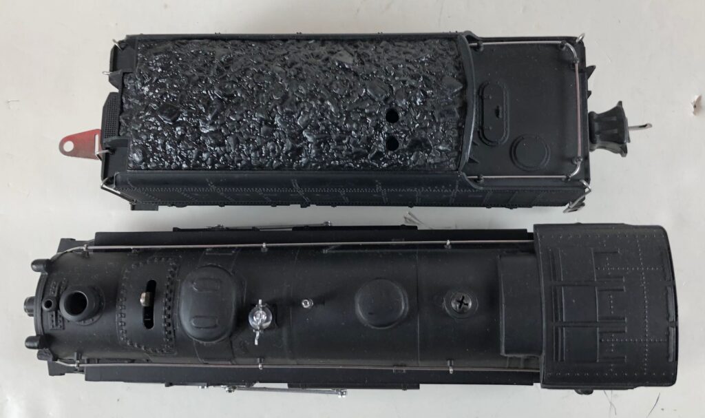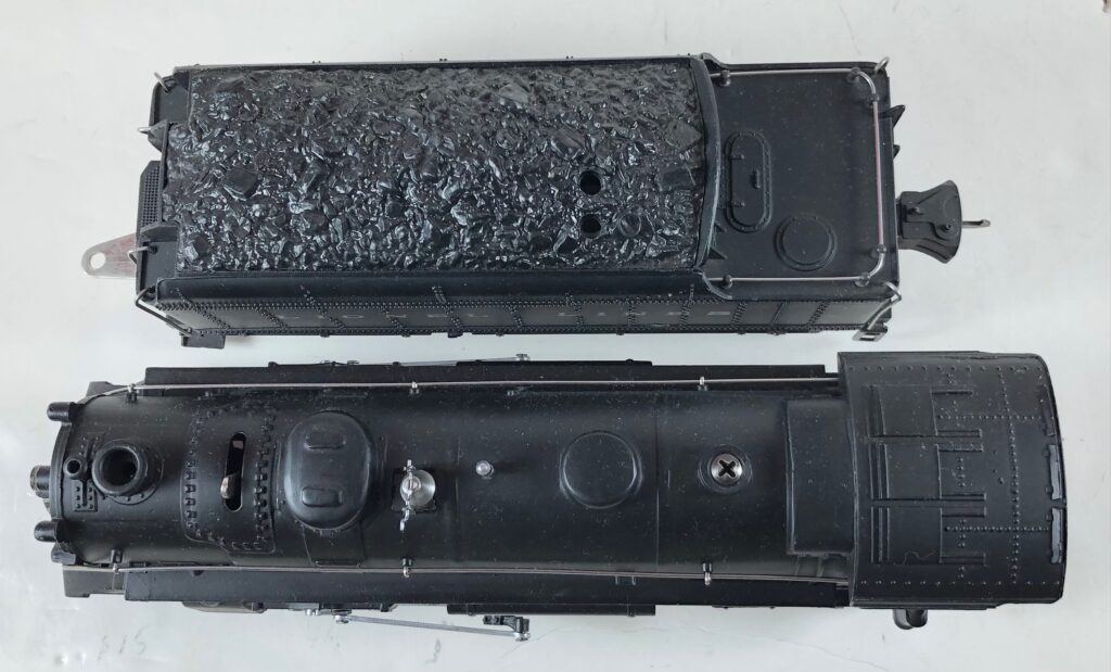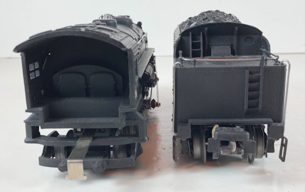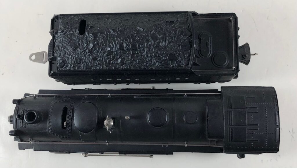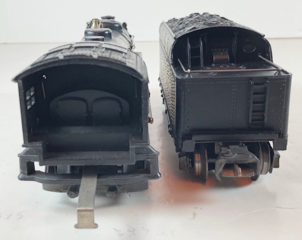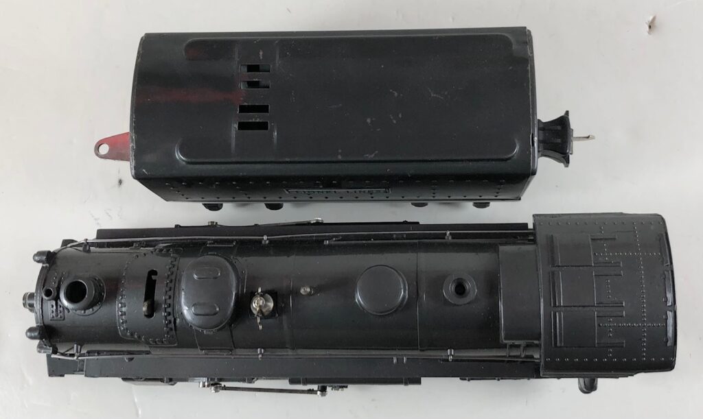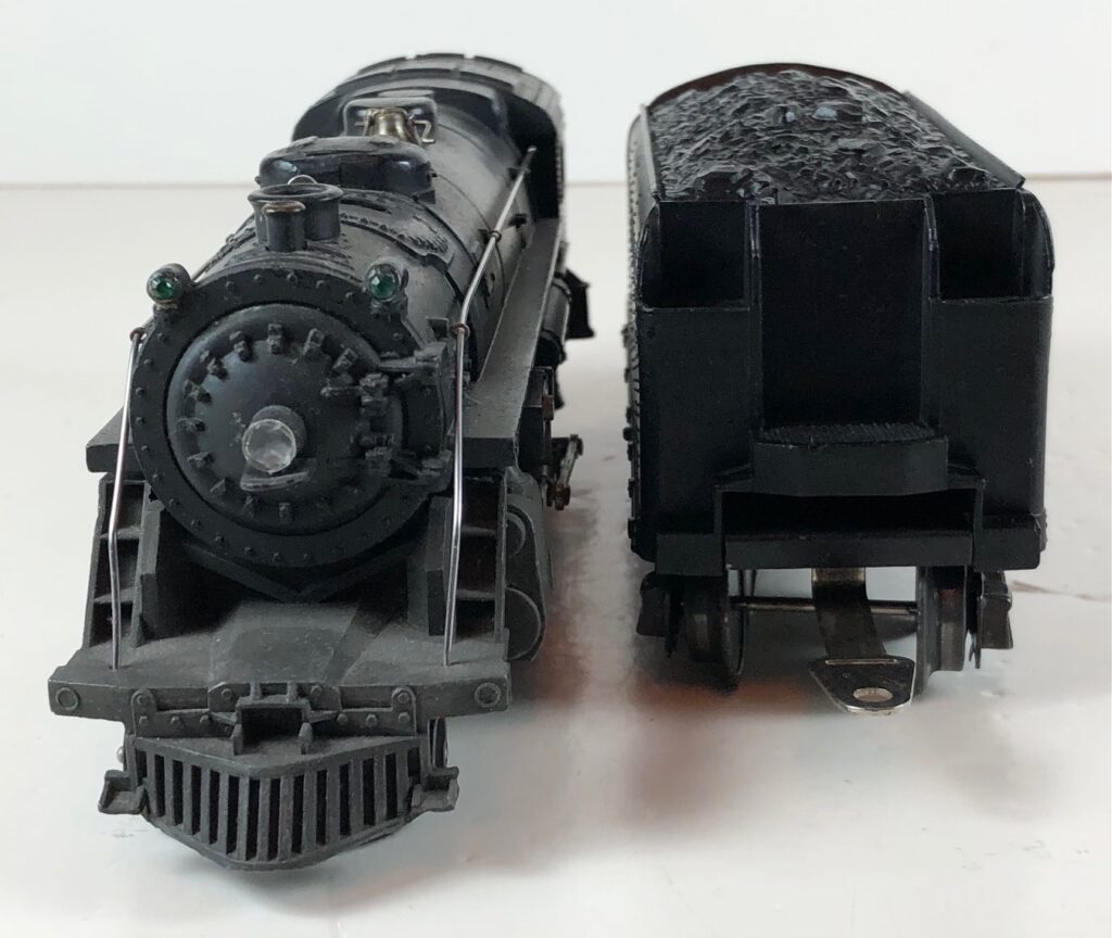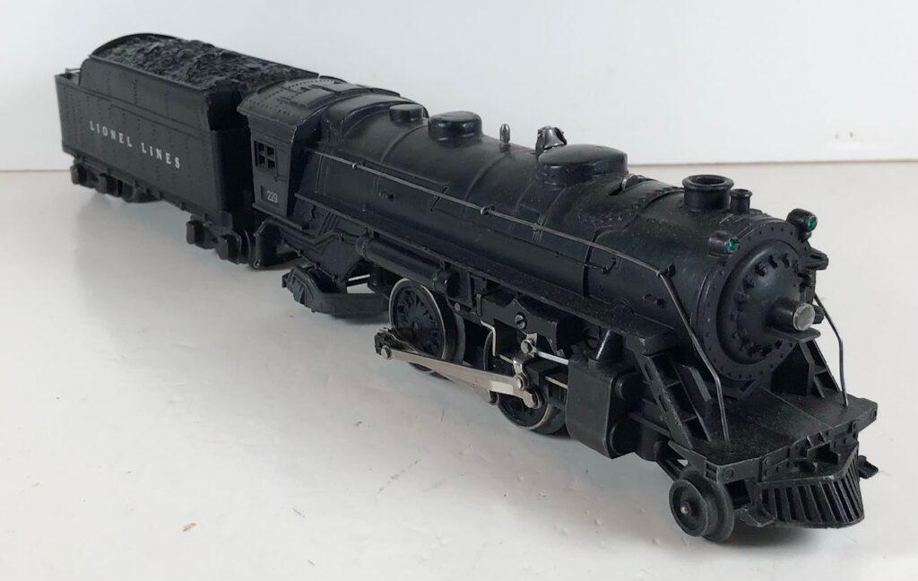 5. No. 224 / 2224T 2-6-2 Steam Locomotive in black with nickel trim and aluminum “224” number plates on the sides of the cab (1941). The top of the sand dome on the locomotive is smooth with no hatches. The No. 2224T Tender is black with a plastic body and “Lionel Lines” stamped on the sides of the tender. The tender has black journals, no corner steps and a late style operating box coupler.
