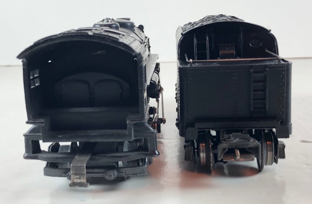 4. No. 224E / 2224W 2-6-2 Steam Locomotive in black with nickel trim and aluminum “224E” number plates on the sides of the cab (1940-1941). The No. 2224W Tender is black with “Lionel Lines” stamped on the sides of the tender. The tender has black journals and a late style operating box coupler.
